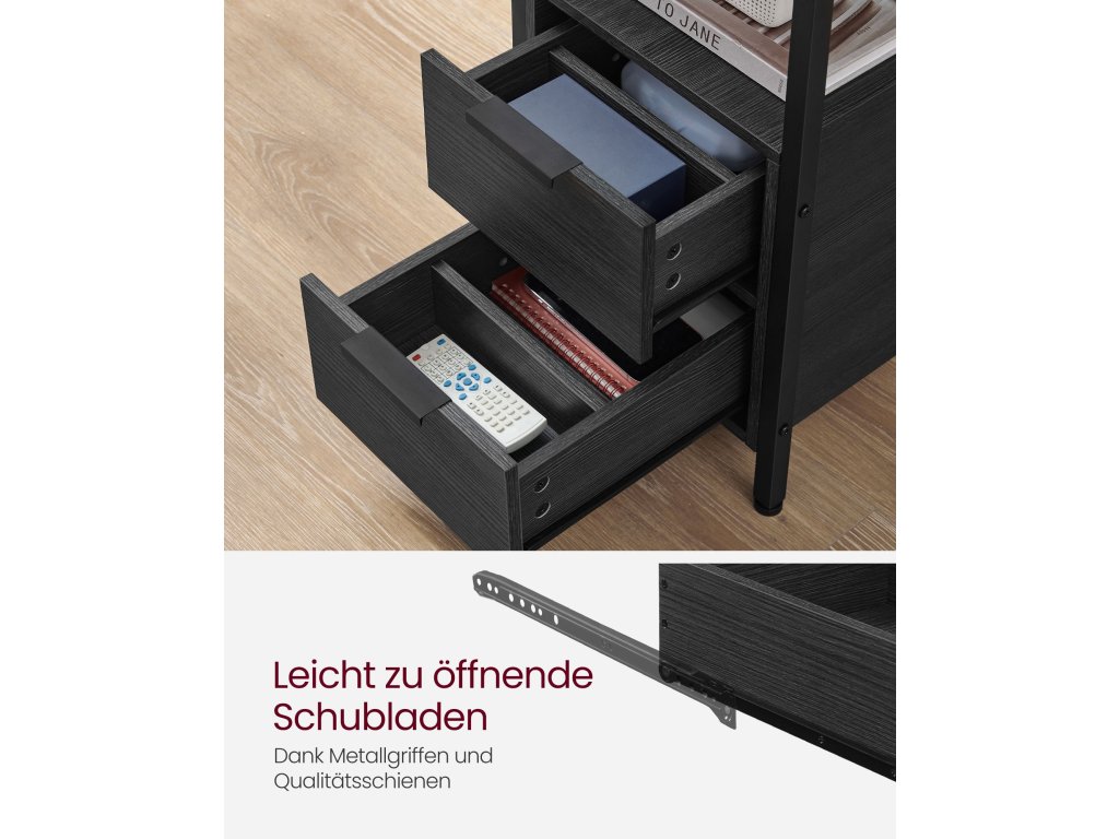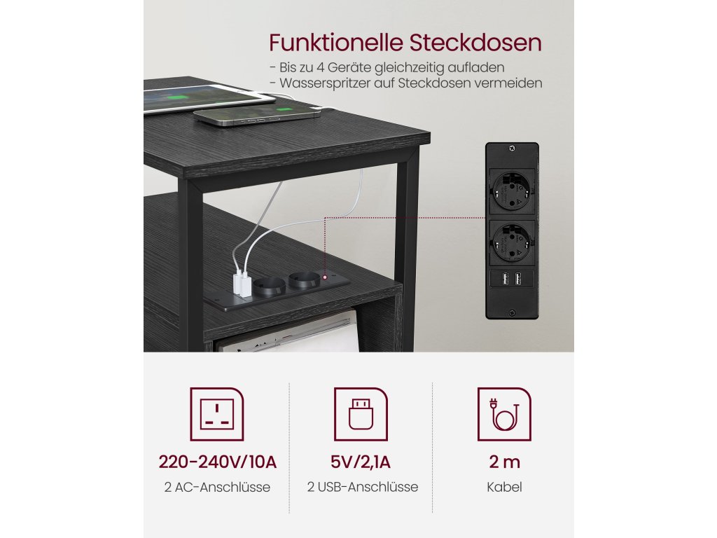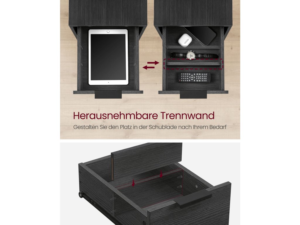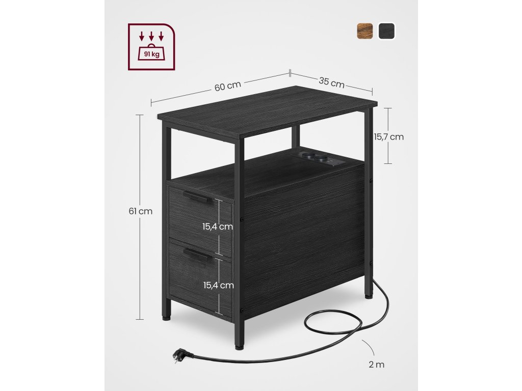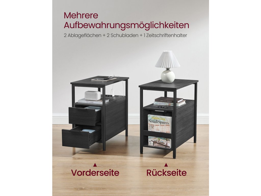 Odkládací stolek, noční stolek s napájecím adaptérem, 2 zásuvky, rozkládací stolek, noční stolek do obývacího pokoje, ložnice, antracitově šedá klasická černá.