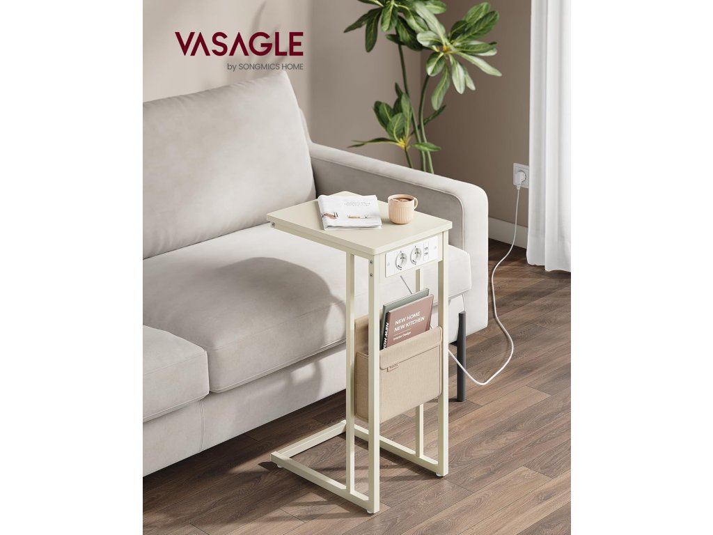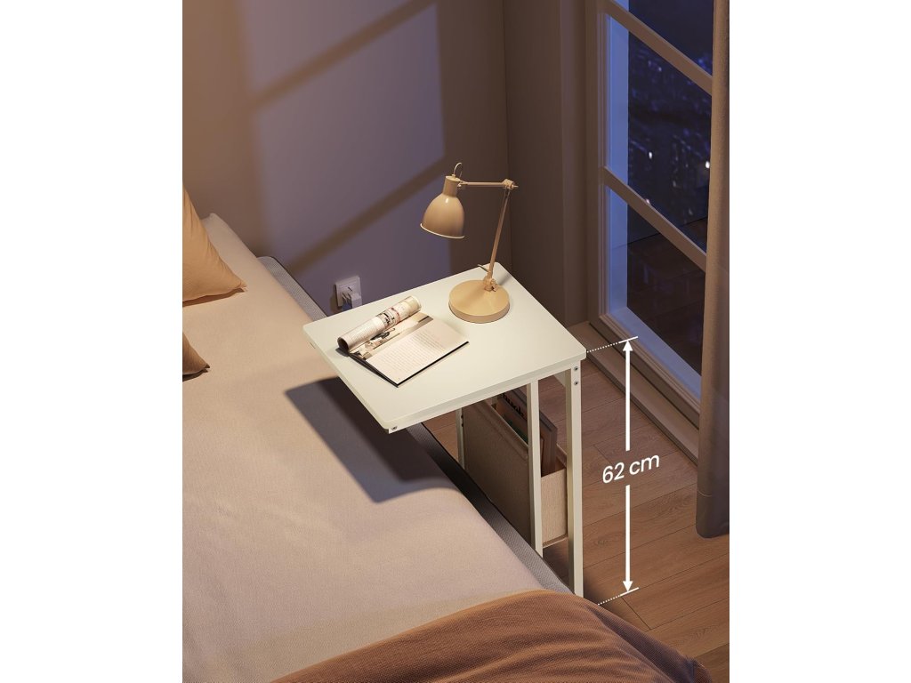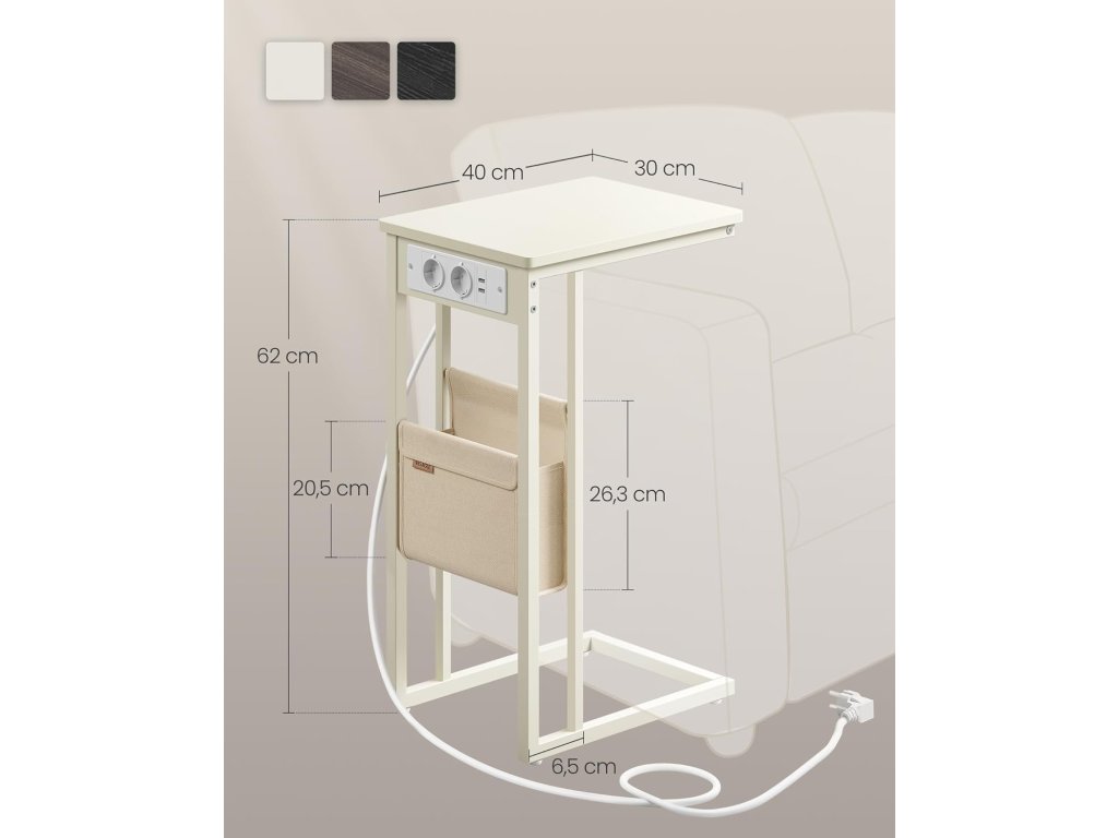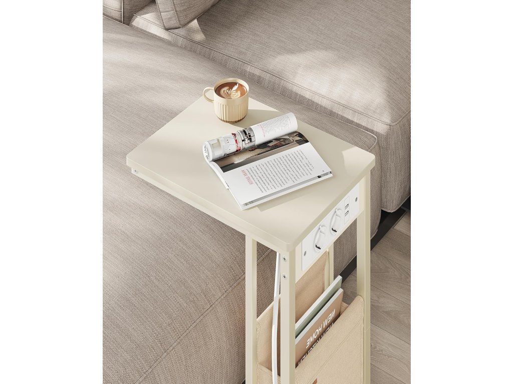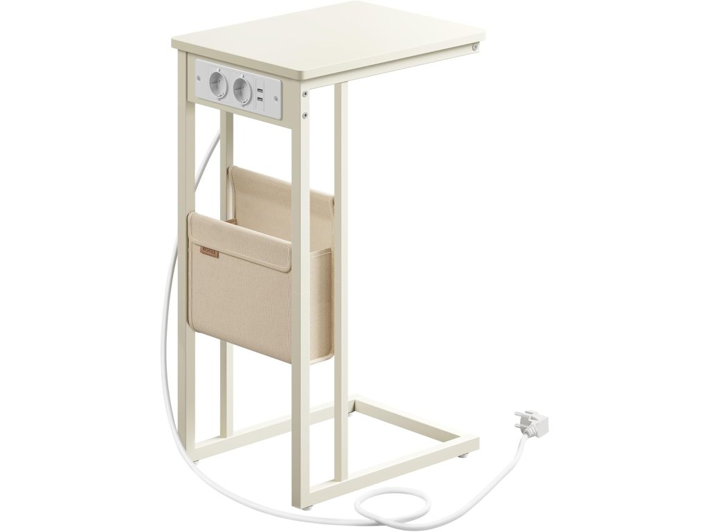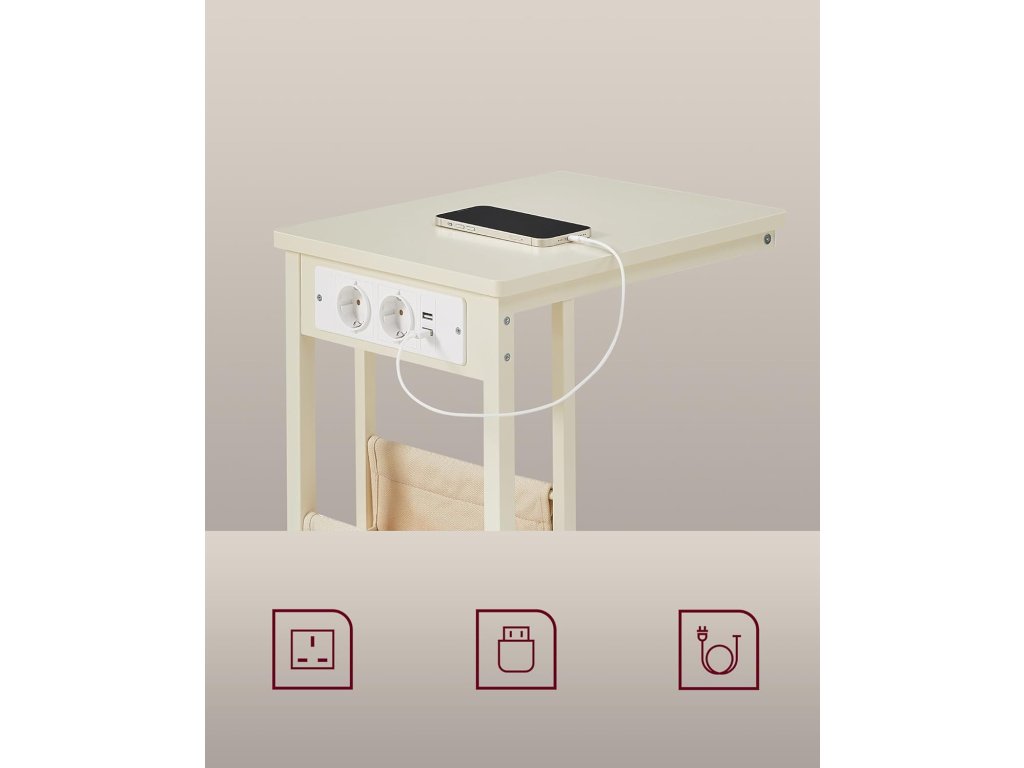 Odkládací stolek, noční stolek se zásuvkami, tvar C, konferenční stolek pro malé prostory, 2 USB porty, 2 síťové zásuvky, úložná taška, nastavitelné nohy, krémově bílý.