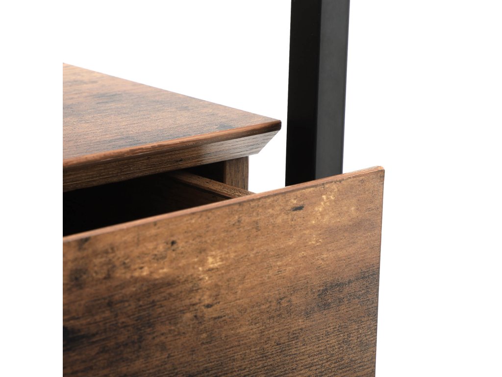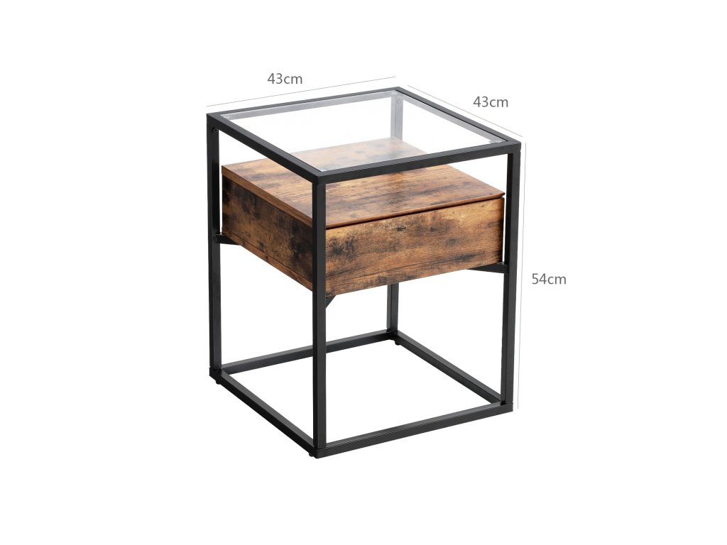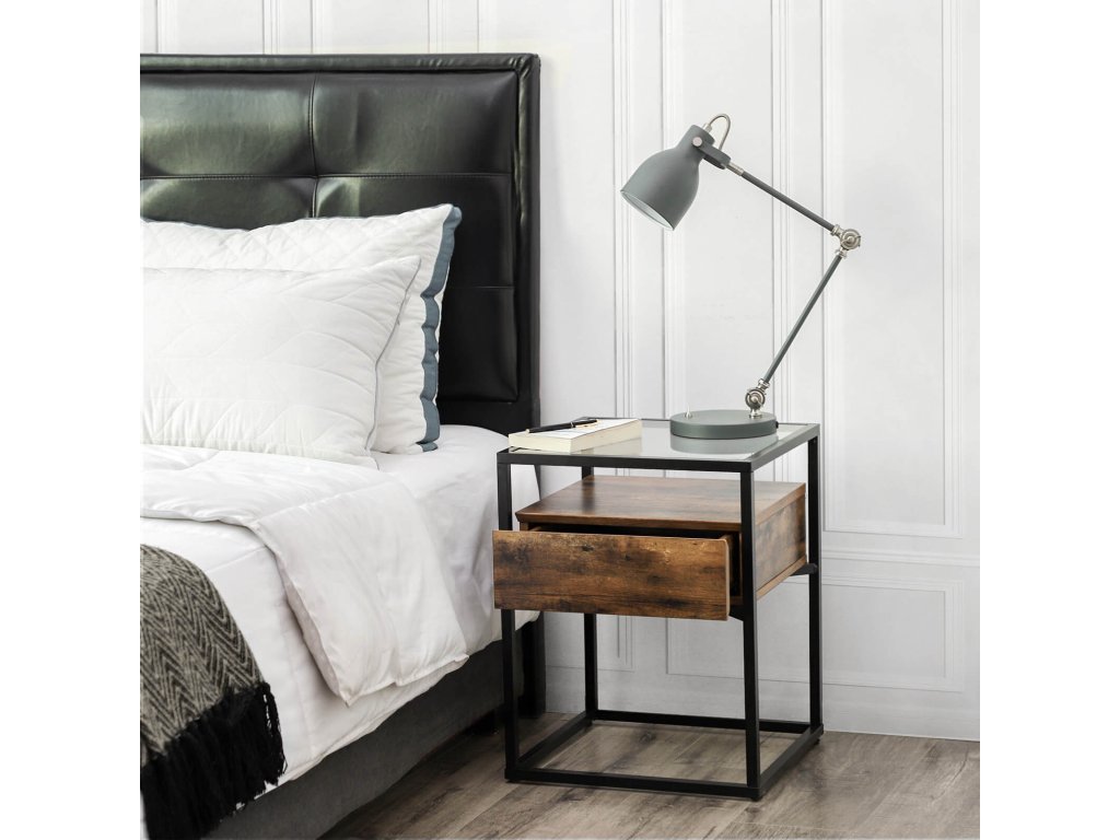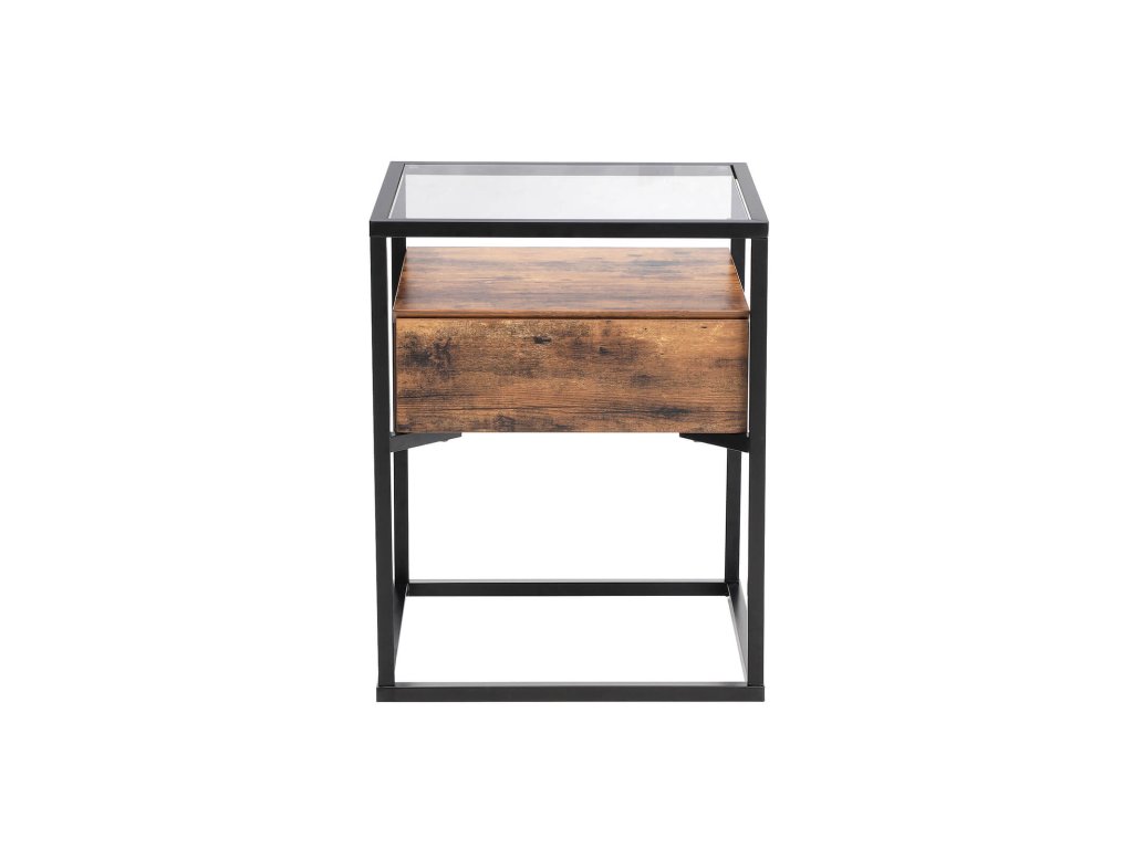 Odkládací stolek z tvrzeného skla se zásuvkou a policí, noční stolek, průmyslový v obývacím pokoji, stabilní ocelový rám, rustikální hnědá a černá.
