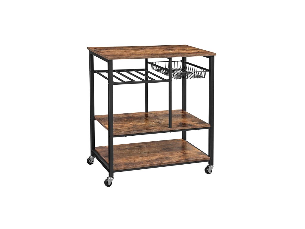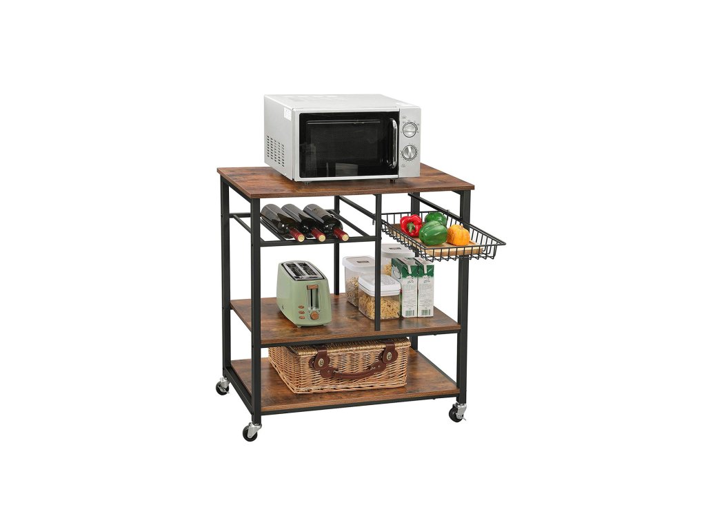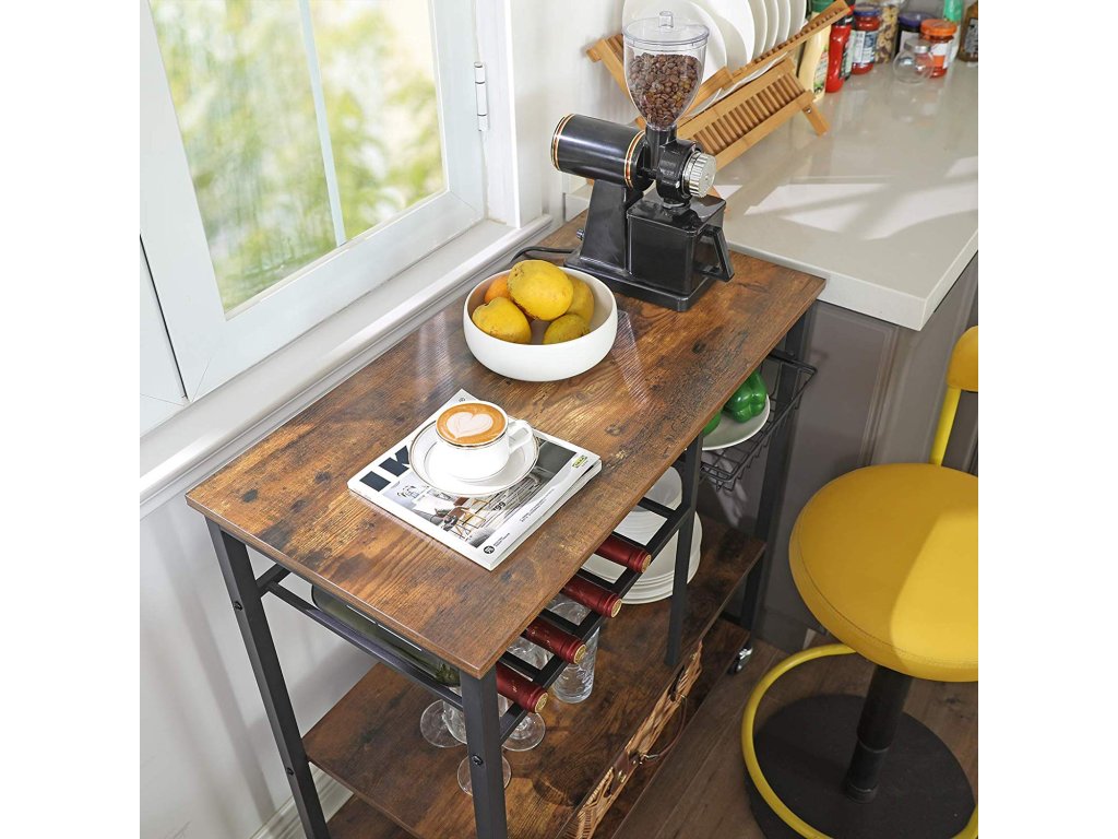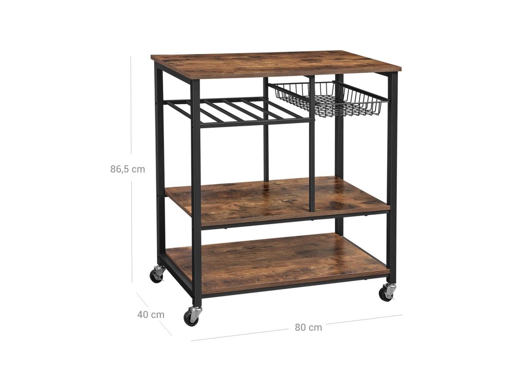 Pekařský regál na kolečkách, kuchyňský ostrůvek, vozík na potraviny s kovovým síťovaným košem, držákem na lahve a úložnými policemi, 80 x 40 x 86,5 cm, průmyslový styl, rustikální hnědá.