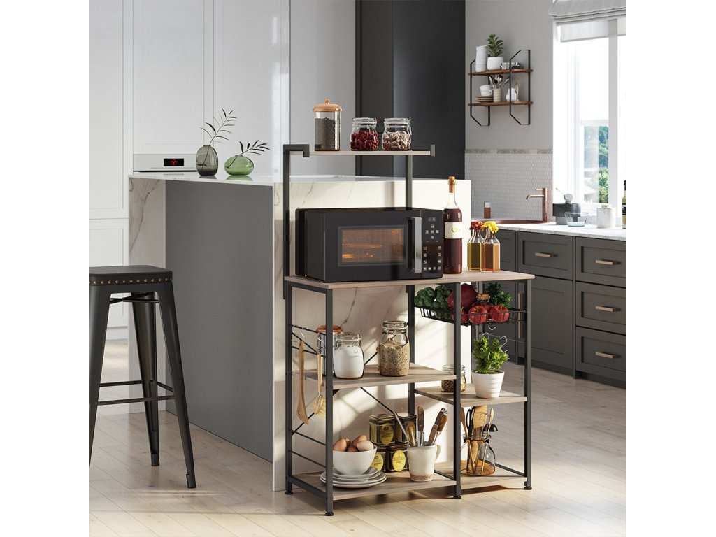 Pekařský regál s policemi, stojan na mikrovlnnou troubu s drátěným košem, 6 háčků ve tvaru S, kuchyňský regál, úložný prostor na koření, hrnce a pánve, béžovo-černý.