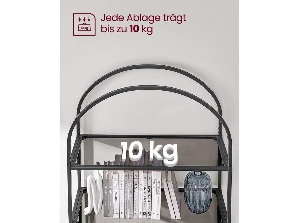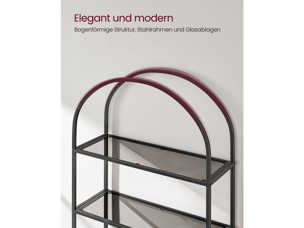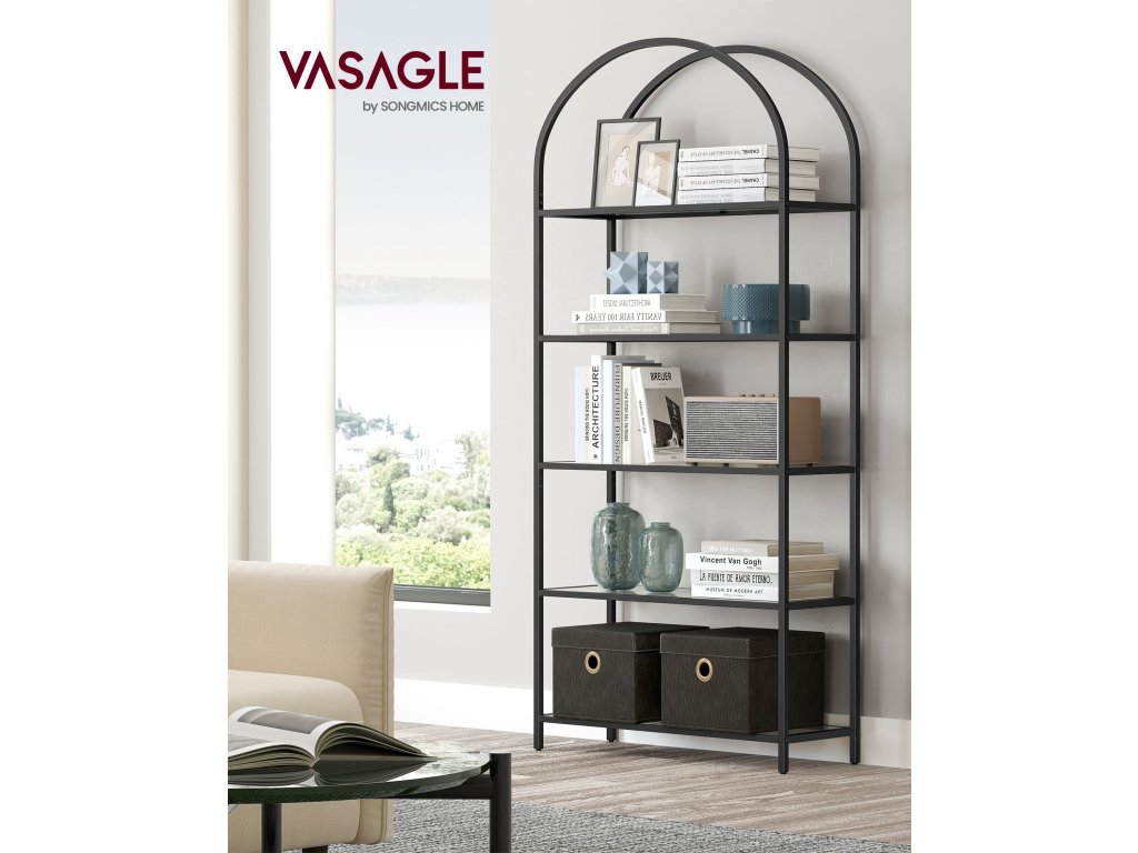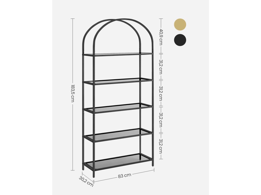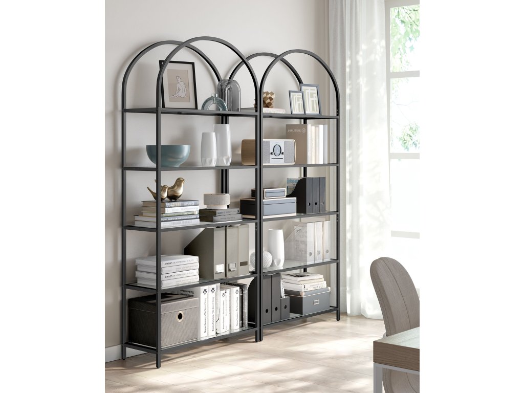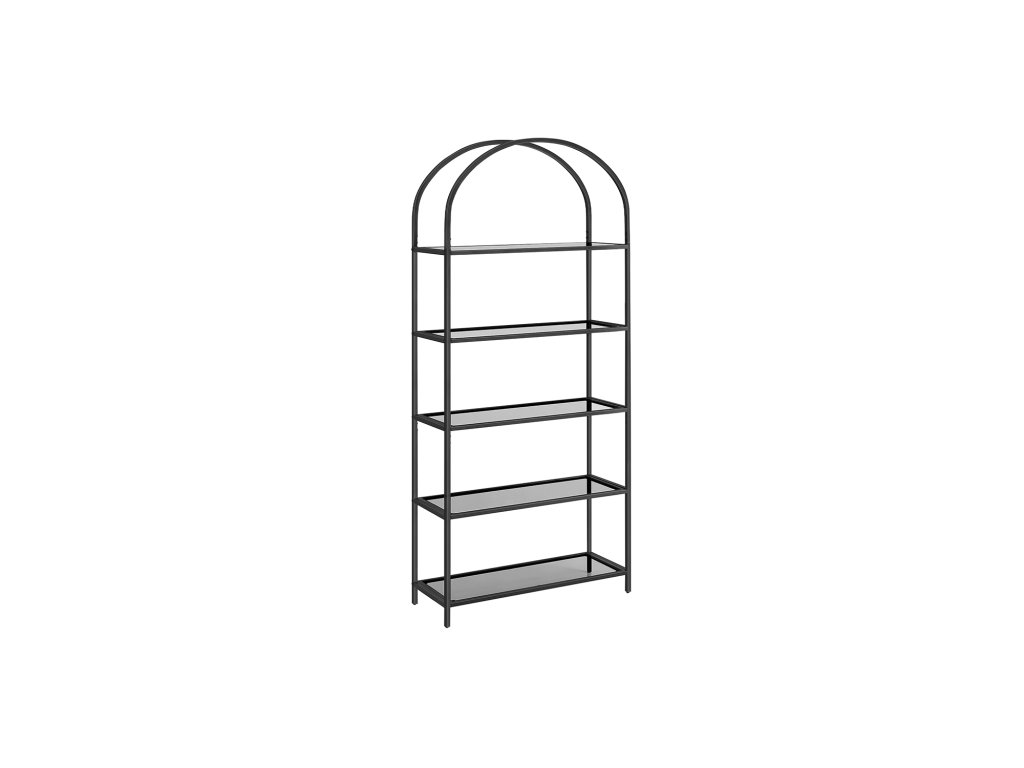 Pětipatrový regál z tvrzeného skla, obloukový design, ocelová konstrukce, do obývacího pokoje, ložnice, pracovny, koupelny, černá a šedá.