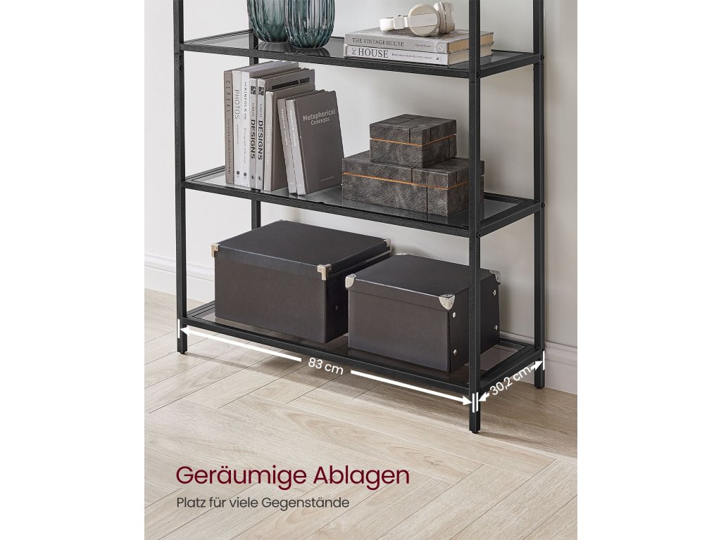 Důstojná scéna Vaše poklady by měly být vystaveny na důstojném stojanu, jako je tato odkládací police; s elegantním designem ve tvaru oblouku a šedými skleněnými policemi obklopenými černou ocelí zvýrazní vše, čeho si ceníte. [5 polic na všechno] Tento regál o rozměrech 30,2 x 83 x 183,5 cm má 5 širokých polic s roztečí 31,2 cm mezi jednotlivými úrovněmi, které nabízejí dostatek prostoru pro vaše drobnosti, knihy, rámečky na fotografie, vázy a další věci. [Pevná opora, stabilní opora] 5 mm silné police z tvrzeného skla s protiskluzovými podložkami stabilně unesou každá 10 kg; nastavitelné nožičky udržují regál v rovnováze; sada proti překlopení nabízí větší stabilitu [Praktický v každé místnosti] Pro dekorace v obývacím pokoji, dokumenty v pracovně, úložné koše v ložnici, koše v kuchyni nebo dokonce toaletní potřeby v koupelně - tento úložný regál zvládne vše díky voděodolnému sklu a nerezavějící oceli. [Snadná montáž] Očíslované díly a přehledný návod vám pomohou rychle sestavit tento policový regál, takže se na policích můžete pochlubit dekoracemi během chvilky;| Kategorie: | Knihovny |