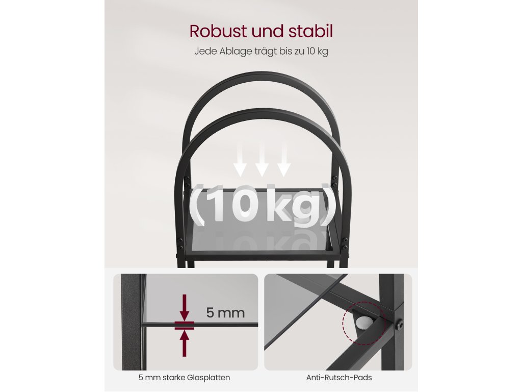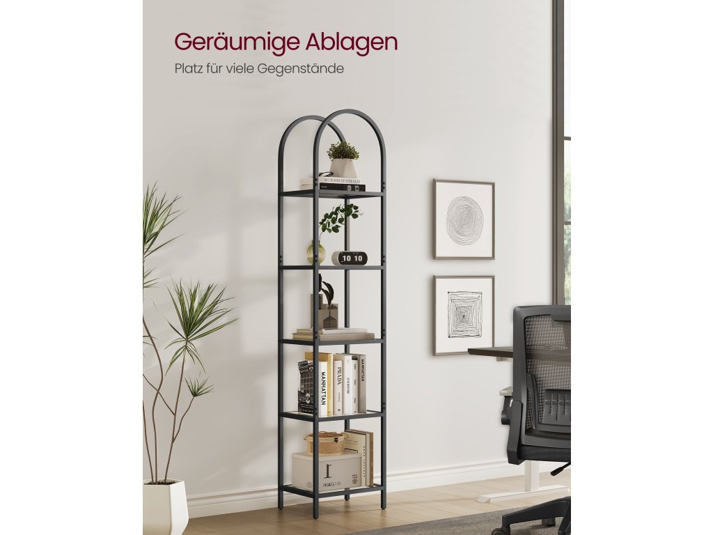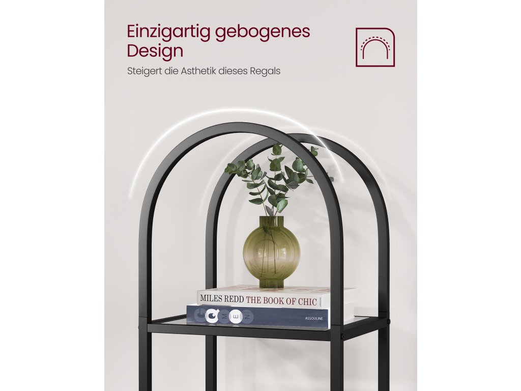 Pětipatrový regál z tvrzeného skla, obloukový design, ocelová konstrukce, do obývacího pokoje, ložnice, pracovny, koupelny, inkoustově černá a břidlicově šedá.