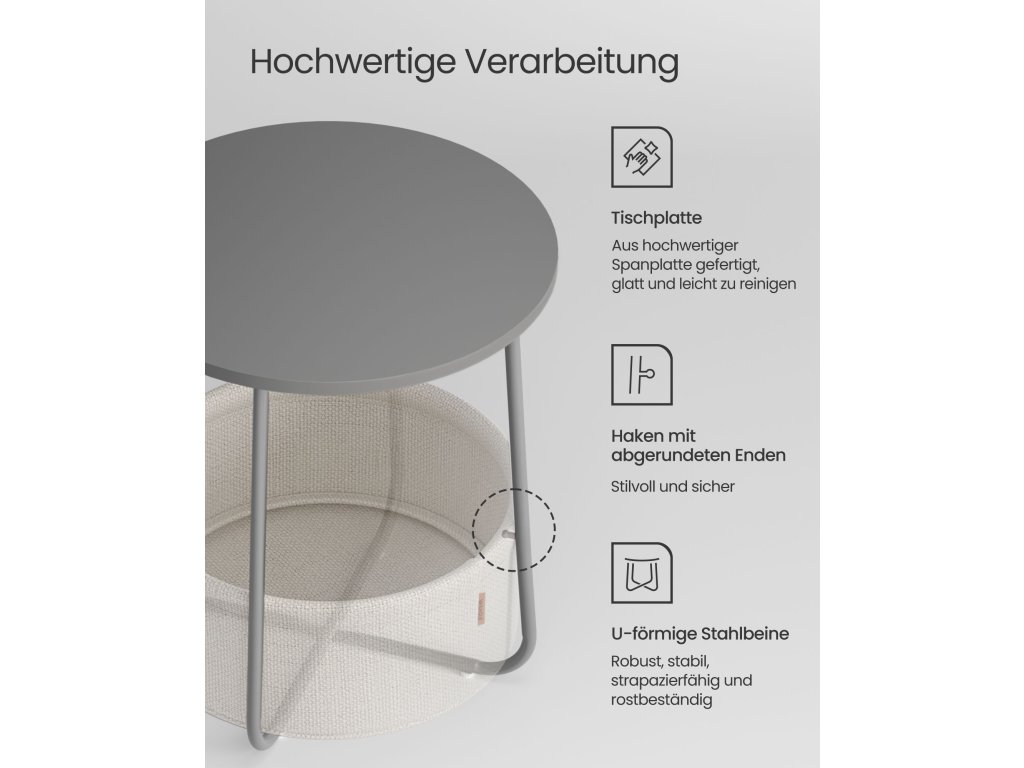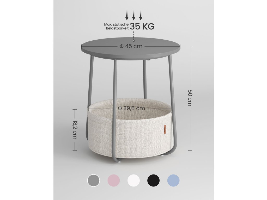 Snadná a rychlá montáž: díky jednoduché konstrukci a jasnému návodu (angličtina není zaručena) lze malý konferenční stolek sestavit během 5-10 minut.Vhodné pro malé prostory: Rozkládací stolek o rozměrech 45 x 50 cm (průměr x výška) má koš o rozměrech 39,6 x 18,2 cm (průměr x výška) a je vhodný do malých prostor. Jako příruční stolek v obývacím pokoji nebo noční stolek v ložnici nezabere mnoho místa, a přesto nabízí dostatek úložného prostoru.Robustní a stabilní: robustní dřevotřískové desky lze k rámu připevnit pevně a bez viklání. Jednodílné ocelové U-nohy zajišťují pevné uchycení. Nastavitelné nožičky zvyšují stabilitu a chrání podlahu před poškrábáním.Vysoce kvalitní koš: Koš je vyroben z hladké dvouvrstvé polyesterové tkaniny a vypadá krásně. Navíc nemá žádný chemický nátěr a zajišťuje bezpečné používání. Díky lněnému vzhledu dodává tomuto stolku jedinečný nádech.Moderní a jednoduchý: tento jednoduchý kulatý stolek dodá vašemu obývacímu pokoji nebo ložnici styl díky kombinaci pastelově růžové a bílé barvy a hodí se do různých stylů interiéru.| Kategorie: | Odkládací stolky |