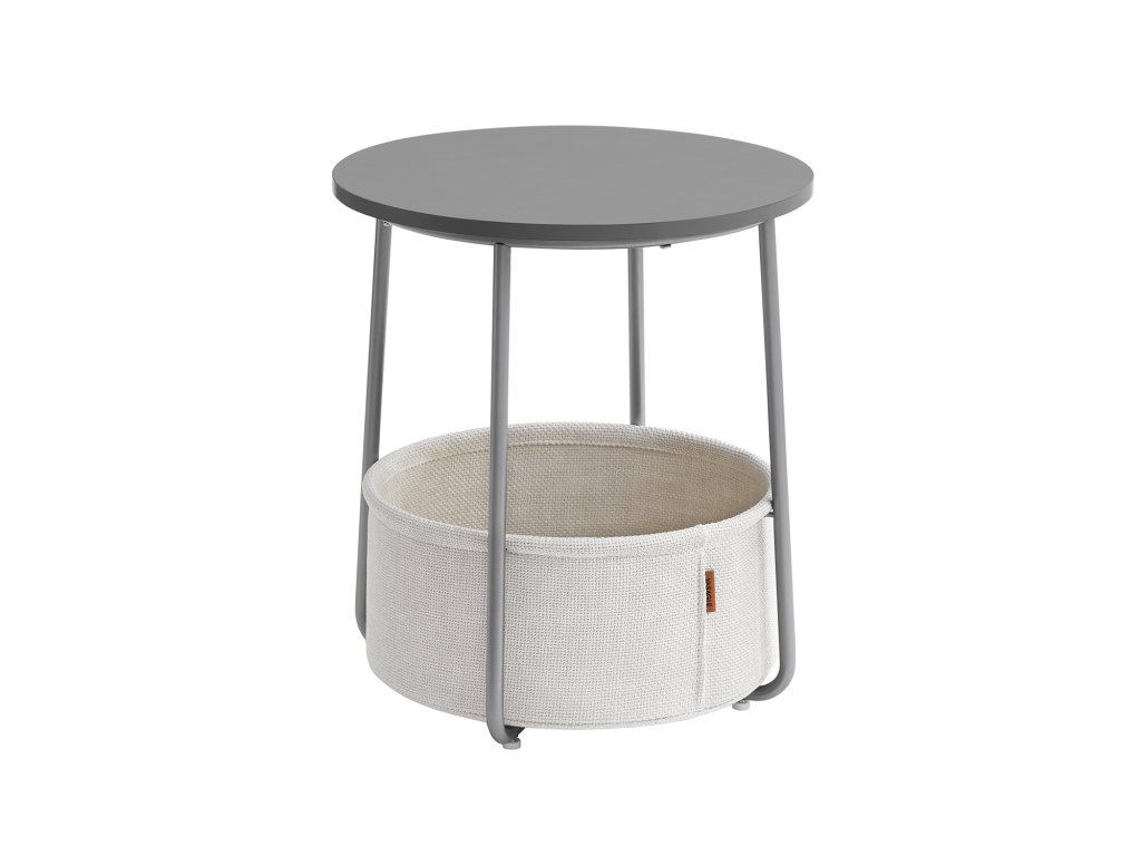 Kulatý konferenční stolek s úložným prostorem v bílo-šedé barvě.