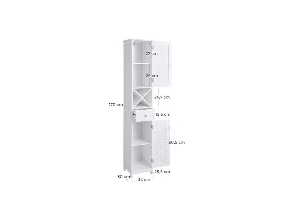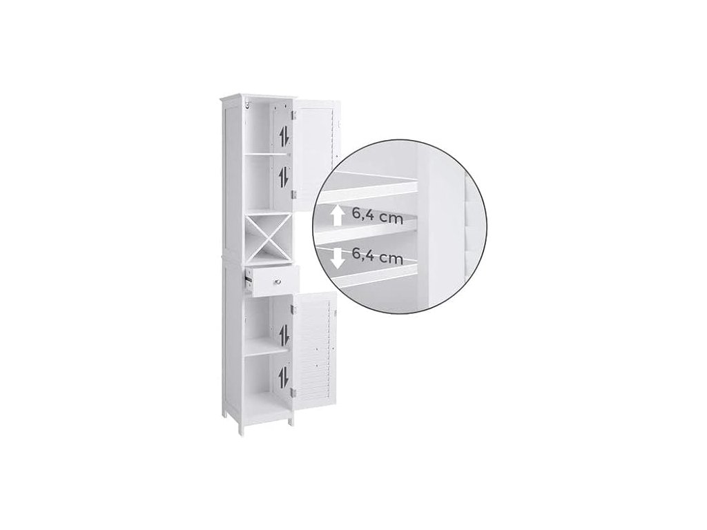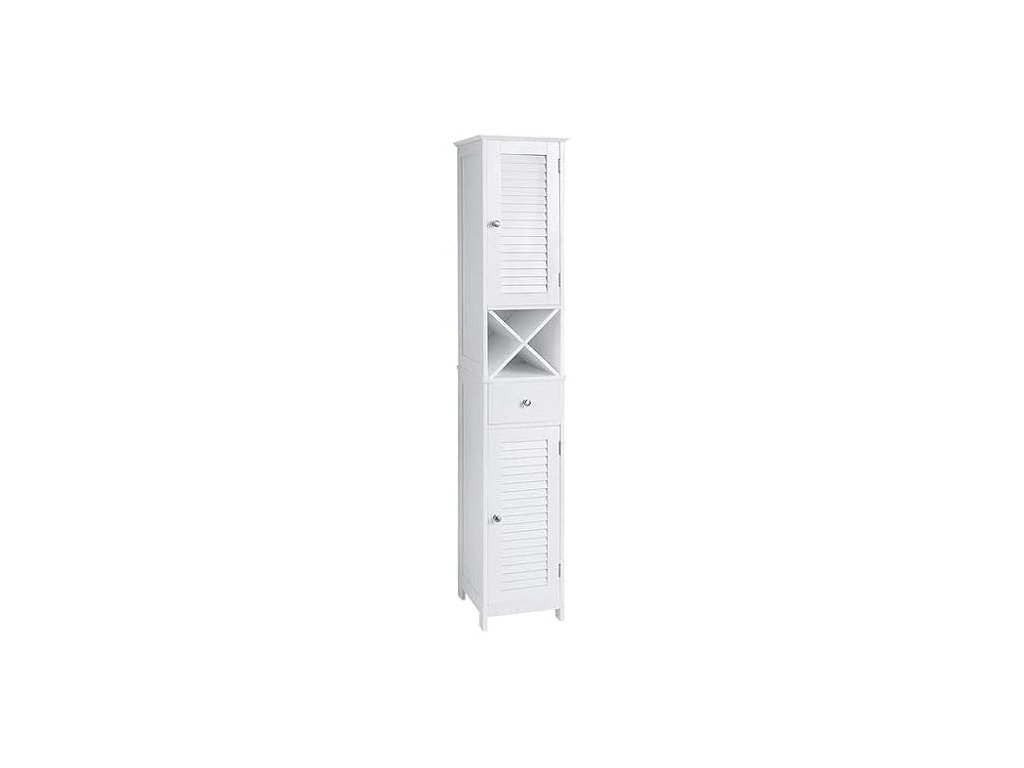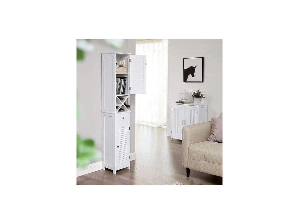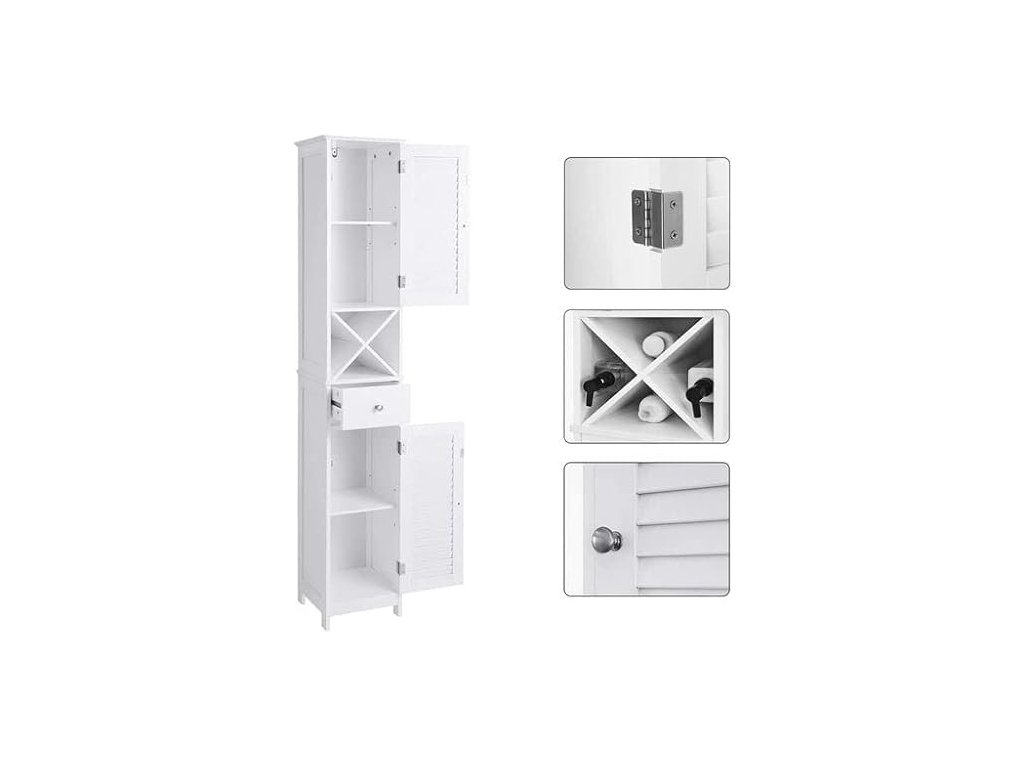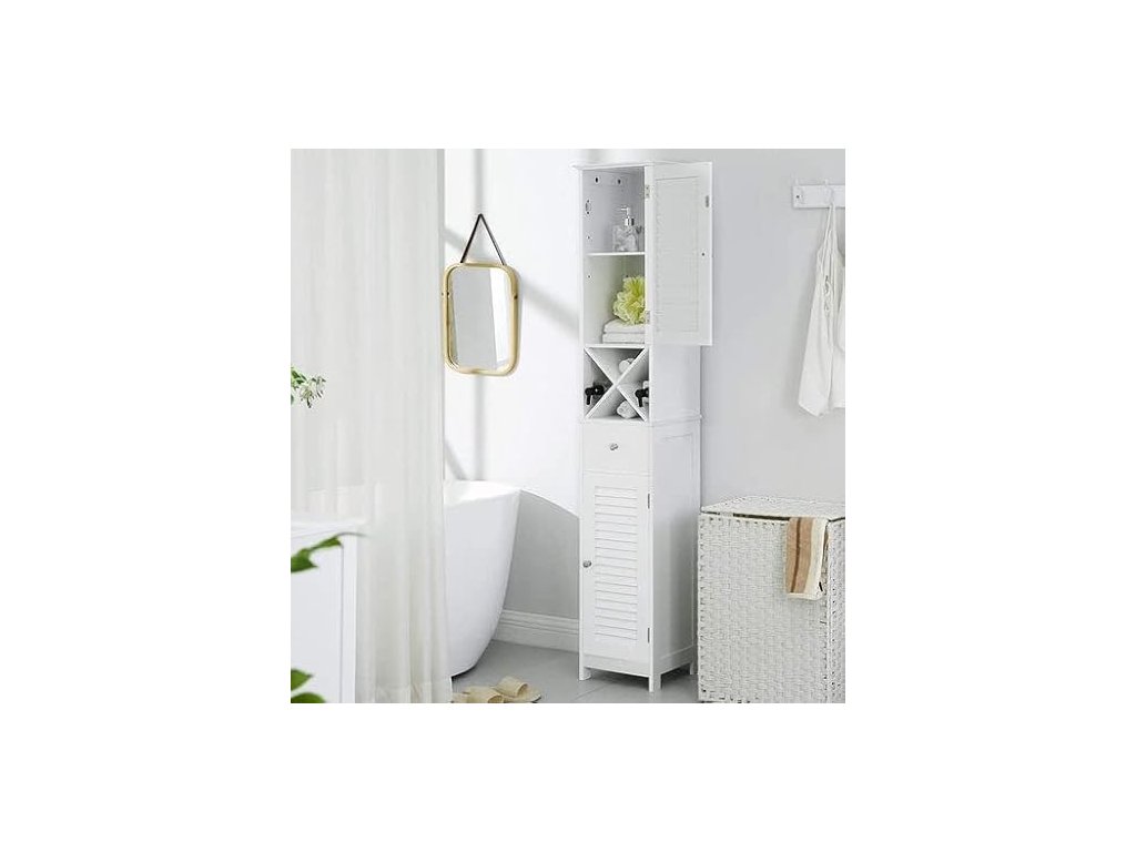 VYHRAZENO PROTI VLHKOSTI: Tato elegantní bílá koupelnová skříňka je vyrobena z umělého dřeva třídy E1. Dvířka s roletou umožňují dobré větrání a udržují vaše produkty péče o pleť v suchu pro příjemnější používání.NA DOSAH RUKY: Vysokou skříňku umístěte vpravo od umyvadla, abyste mohli pohodlně otevřít dvířka a dostat se ke svým toaletním potřebám a užívat si každodenní kosmetickou péči. Máte ještě nějaké drobnosti roztroušené po okolí? Uspořádejte je do zásuvky!VÍCE S MÍŇ: Vysoká a štíhlá skříňka nabízí spoustu úložného prostoru a přitom v koupelně zabírá málo místa. Můžete ho také umístit do obývacího pokoje, do vstupní haly nebo na balkon - jeho elegantní vzhled se hodí k mnoha stylům.PRO RELAXAČNÍ HODINY: Ponořte se do vany, abyste se vykoupali, a ze stojanu X volně stojící skříňky si vezměte láhev vína a vychutnejte si uklidňující chvíle; mimochodem, stojan X lze použít samostatně;MONTÁŽ POD VAŠÍ KONTROLOU: Díky přehledným návodům a očíslovaným dílům je montáž skříňky hračka a přiložená sada proti převrácení zajišťuje bezpečné prostředí pro vaši rodinu.| Kategorie: | Koupelnový nábytek |