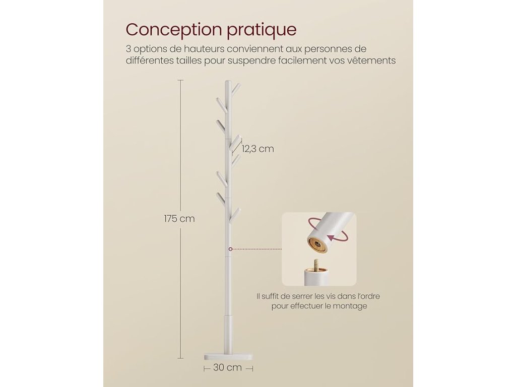 Montage facile Představte si portemanteau, které je sestaveno z jednoho klin d'œil, s integrovanými částmi, které nepotřebují žádný dodatečný nástroj. Il vous suffit de tourner, fixer, et votre élégant portemanteau est prêt !.Conception durable, surface lisse Fabriqué en bois d'hévéa robuste et recouvert d'une finition de peinture triple couche ce portant à vêtements est durable en termes de qualité et offre une surface lisse et adaptée aux vêtements3 možnosti výšky Le portemanteau réglable, avec 3 options de hauteur, répond aux besoins variés des utilisateurs. Je vhodný pro každého člena rodiny, jeho použití je optimální a bez námahy se přizpůsobí vašemu stylu života.Stable et fiable Ce portemanteau moderne est doté d'un poteau principal robuste de 4 cm de diamètre, solidement relié aux branches. Soutenu par une base carrée stable, il peut supporter jusqu'à 24 kg au total, soit 3 kg par crochet.Polyvalence et élégance Avec son design épuré et minimaliste, ce portemanteau sur pieds s'intègre parfaitement dans tout environnement. Je to navíc funkční předmět, který dodává eleganci vašemu vchodu, pokoji, kanceláři nebo přijímacímu salonu.| Kategorie: | Stojany na oblečení |