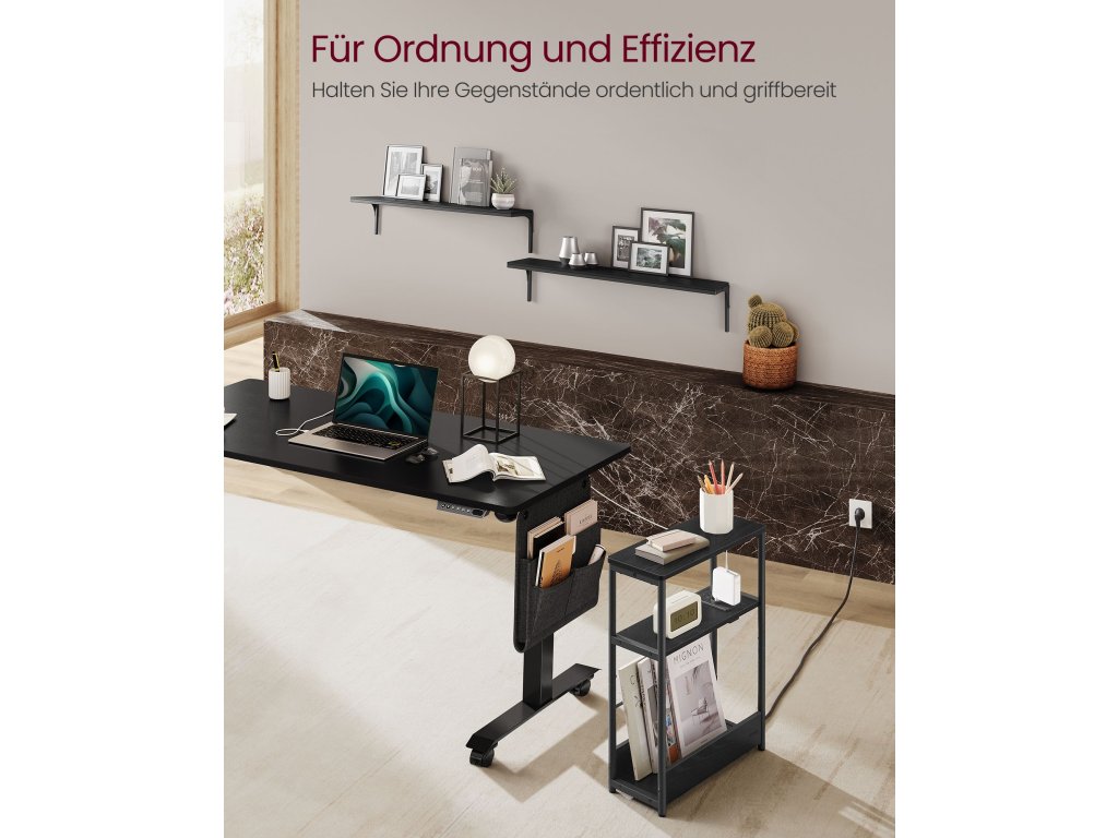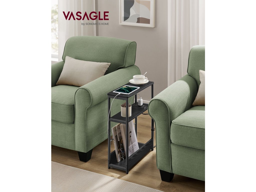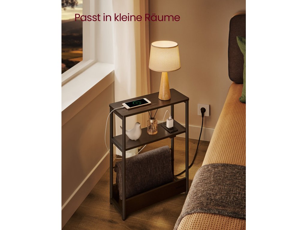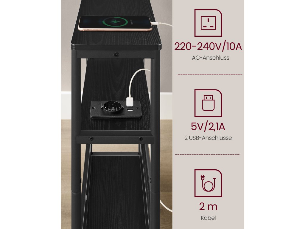Postranní stolek s napájecím adaptérem, úzký třípatrový postranní stolek, postranní stolek pro malé prostory s držákem na časopisy, do obývacího pokoje, ložnice, pracovna, černá ebenová a černá inkoustová.