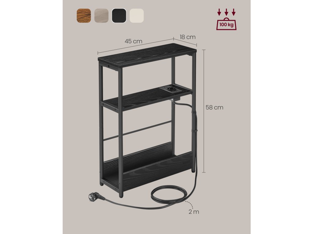 Vhodné pro úzké prostory Tento prostorově úsporný třípatrový konferenční stolek o rozměrech 18 x 45 x 58 cm se skvěle hodí do malých prostor vedle pohovky nebo postele a maximálně využije volný prostor.Vestavěná nabíjecí stanice Tento konferenční stolek s 1 zásuvkou a 2 porty USB umožňuje nabíjet mobilní telefon, tablet a další zařízení současně. Díky 2 m dlouhému kabelu můžete tento stolek umístit, kamkoli potřebujete.Univerzální Ať už potřebujete stojan na časopisy nebo odkládací stolek na věci denní potřeby, tato multifunkční skříňka se 3 policemi splní všechny vaše požadavky.Robustní a spolehlivý Díky robustnímu ocelovému rámu a kvalitní dřevotřískové desce unese tento konferenční stolek až 100 kg a poskytne stabilní oporu pro vaše každodenní potřeby.Rychlá a snadná montáž Montáž tohoto konferenčního stolku je díky označeným dílům a jasnému návodu hračka. Tento praktický a elegantní rozkládací stolek si budete moci užívat během několika minut.| Kategorie: | Odkládací stolky |
