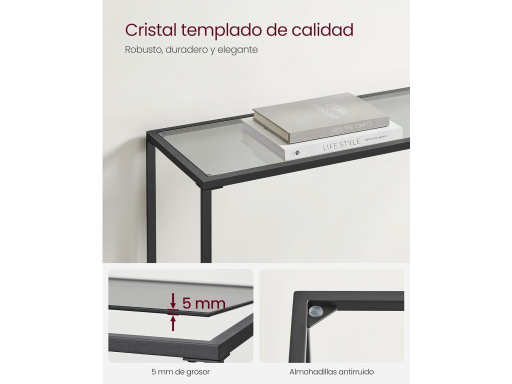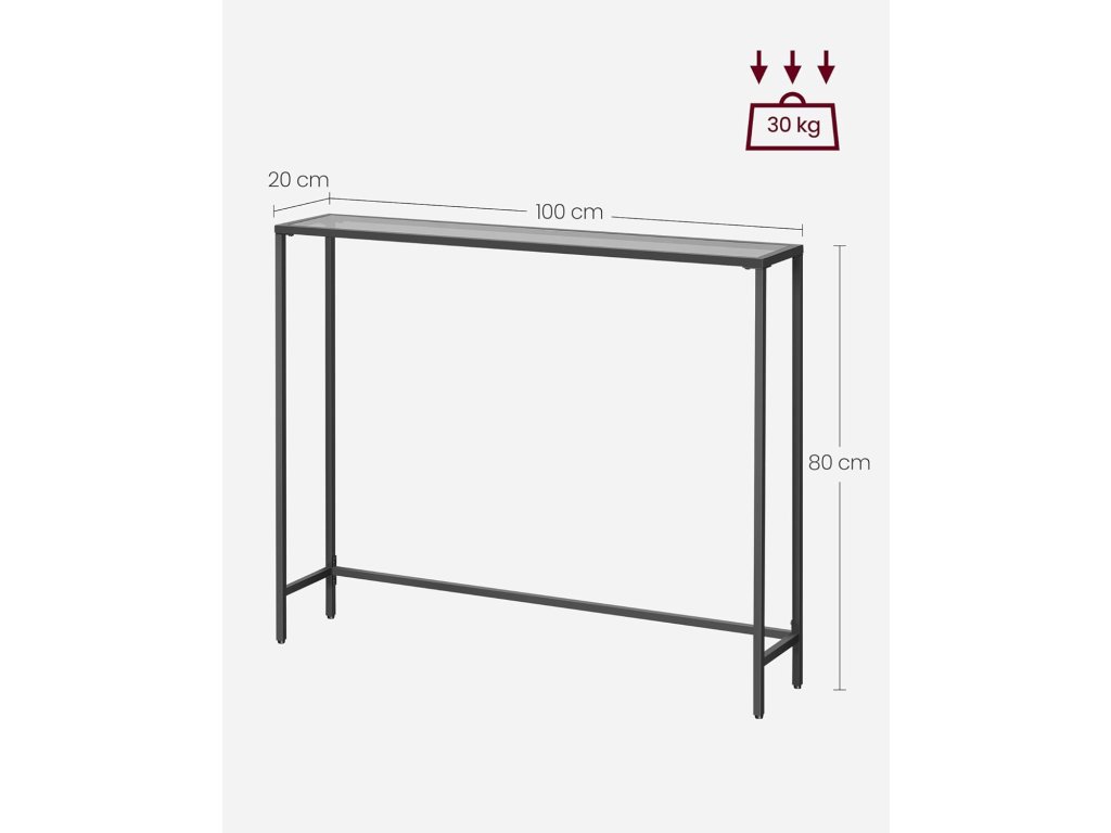 Atraktivní minimalistický styl Dodejte své vstupní hale jiný nádech s tímto konzolovým stolkem, který kombinuje inkoustově černý lineární kov a desku z tvrzeného skla a vytváří tak jednoduchý, ale funkční kousek.Stabilní podpora 5 mm silné sklo je stabilně podepřeno kovovým rámem tohoto konzolového stolku o rozměrech 20 x 100 x 80 cm (D x Š x V), který pojme až 30 kg rostlin, dekorací, knih nebo vzácné keramiky.Použijte jej podle svého Představte si, že konzolový stolek již máte doma. kam ji umístíte? Do obývacího pokoje na ozdobu nudné stěny? Do předsíně, abyste si tam mohli dát věci potřebné k odchodu z domu? Nebo jako konzolu na chodbě? Záleží jen na vásPřipraveno během okamžiku Sestavováním tohoto konzolového stolku nemusíte strávit celé odpoledne; díky jasným návodům a očíslovaným dílům jej sestavíte během chvilky.Sbohem, viklání! Pokud vás trápí mírně nerovná podlaha, pak vám nastavitelné nohy tohoto konzolového stolku pomohou udržet vše stabilní a na svém místě.| Kategorie: | Odkládací stolky |