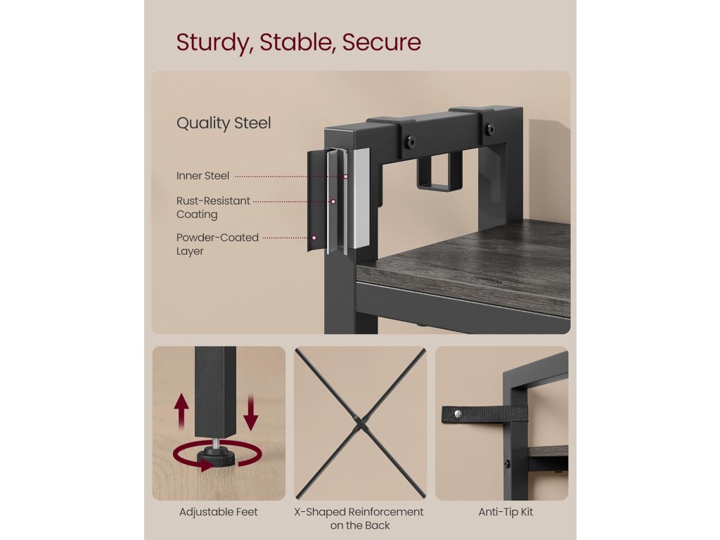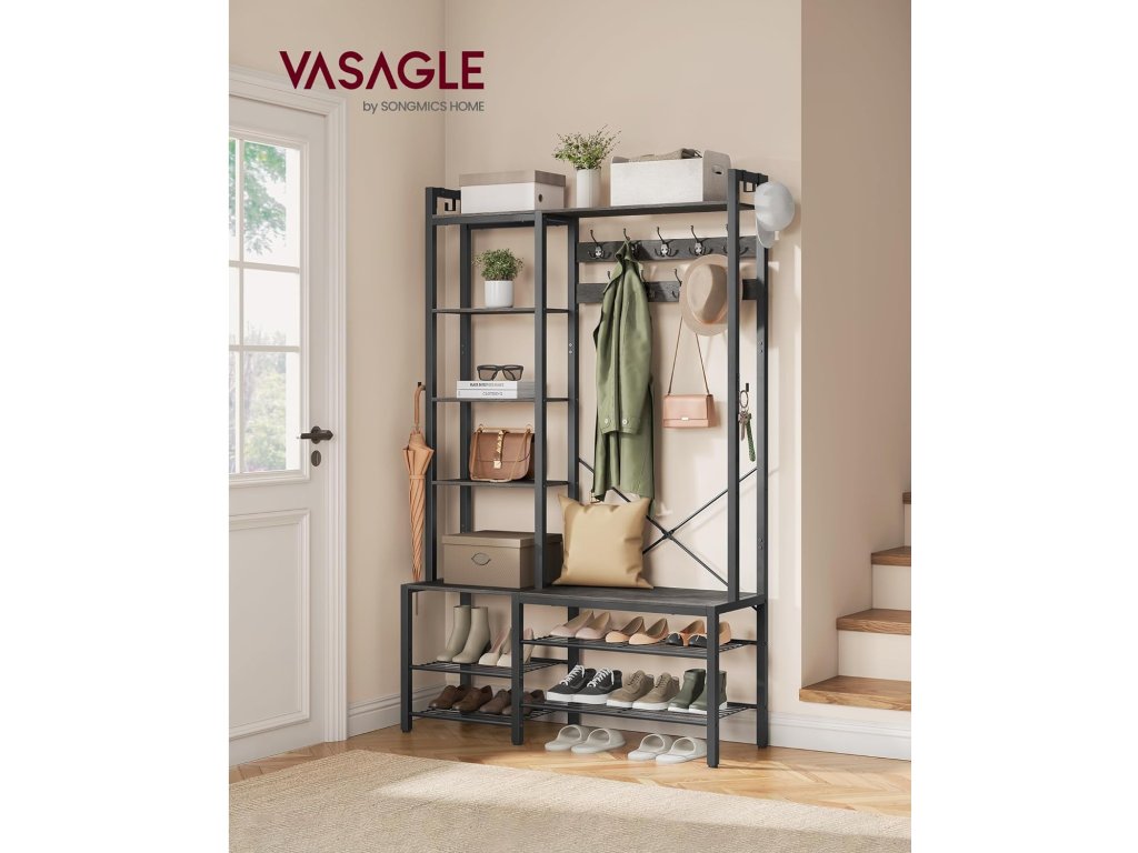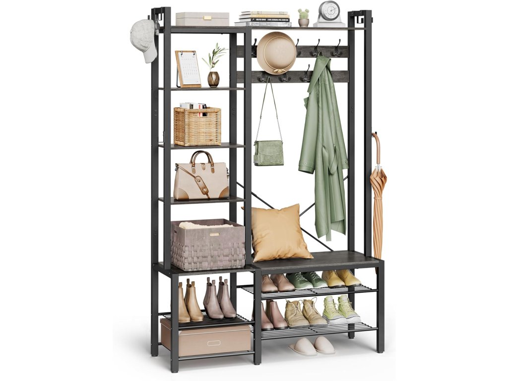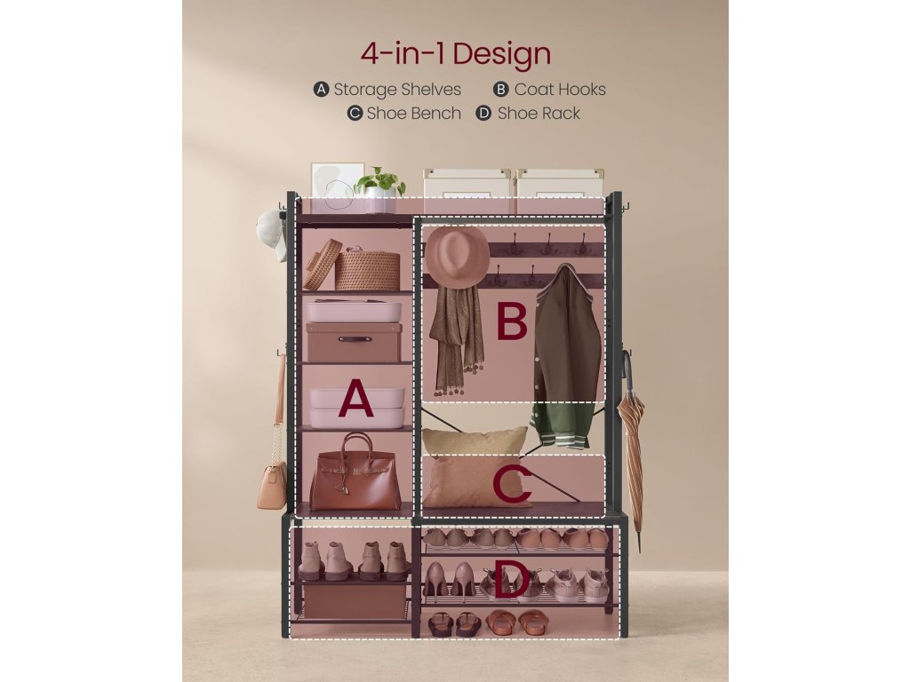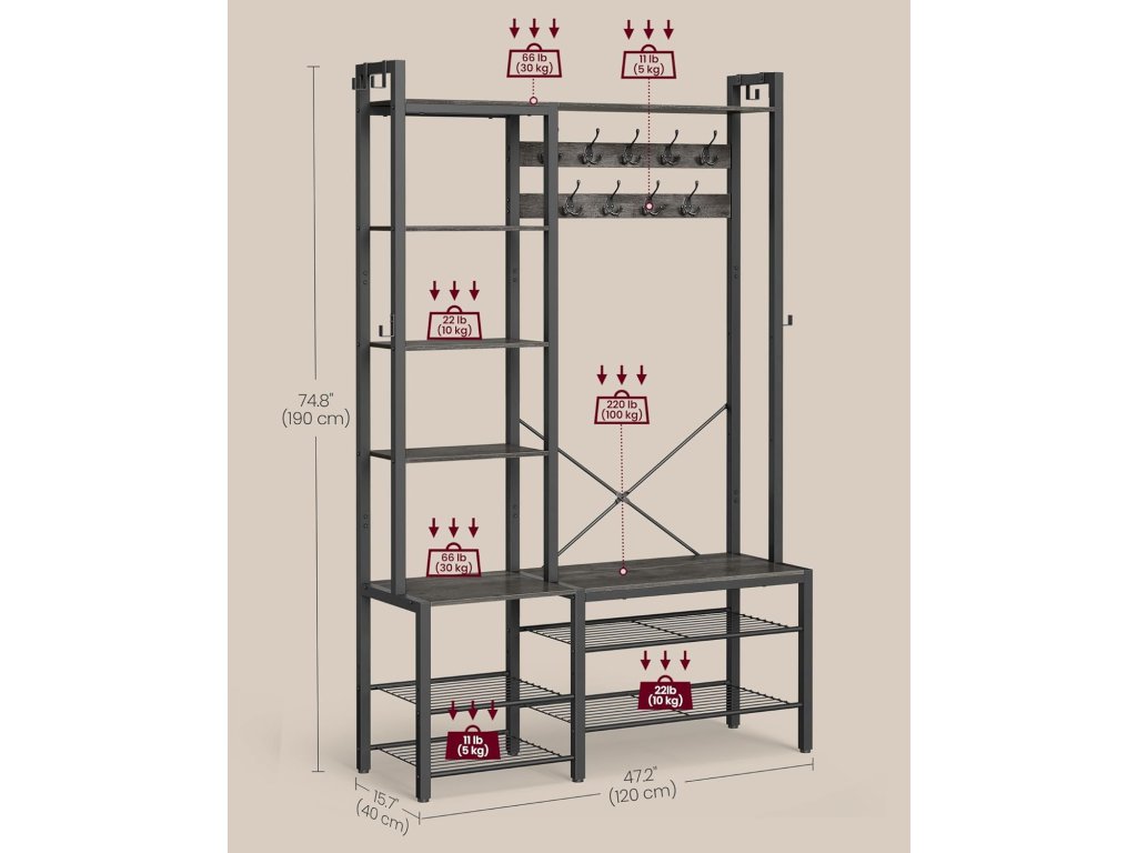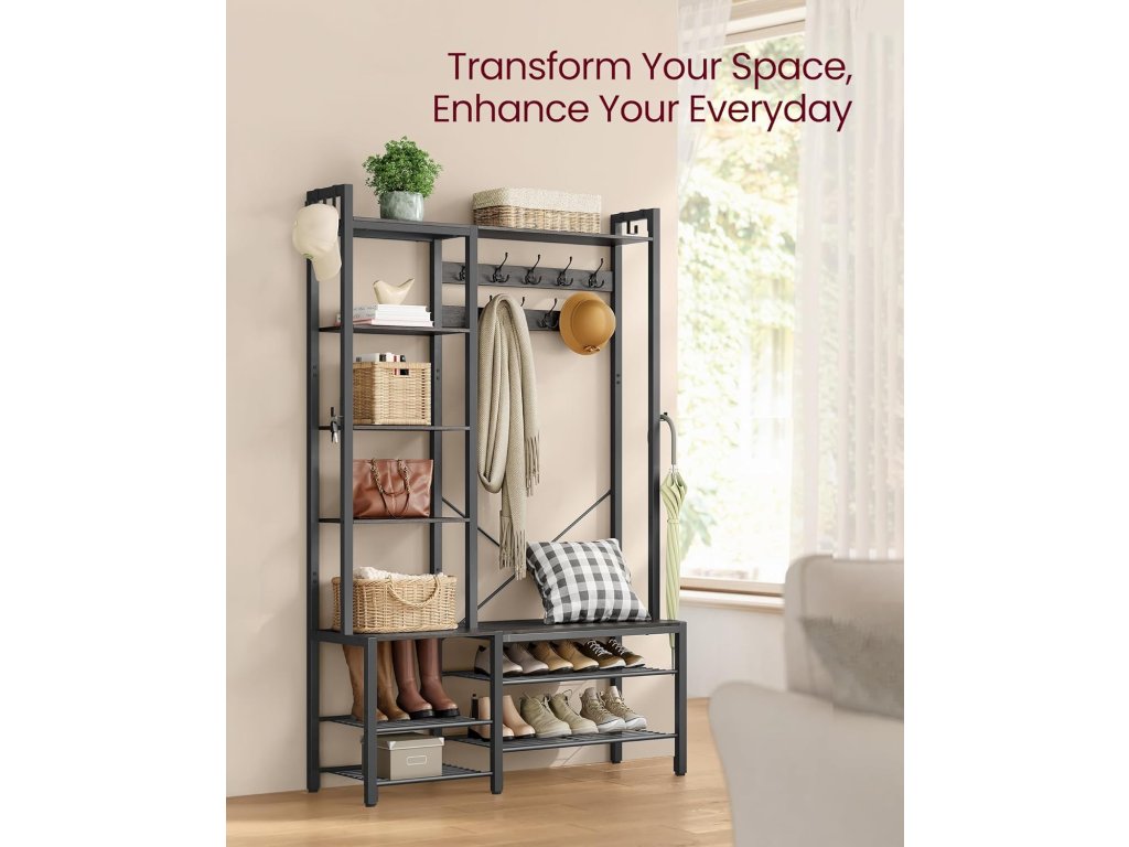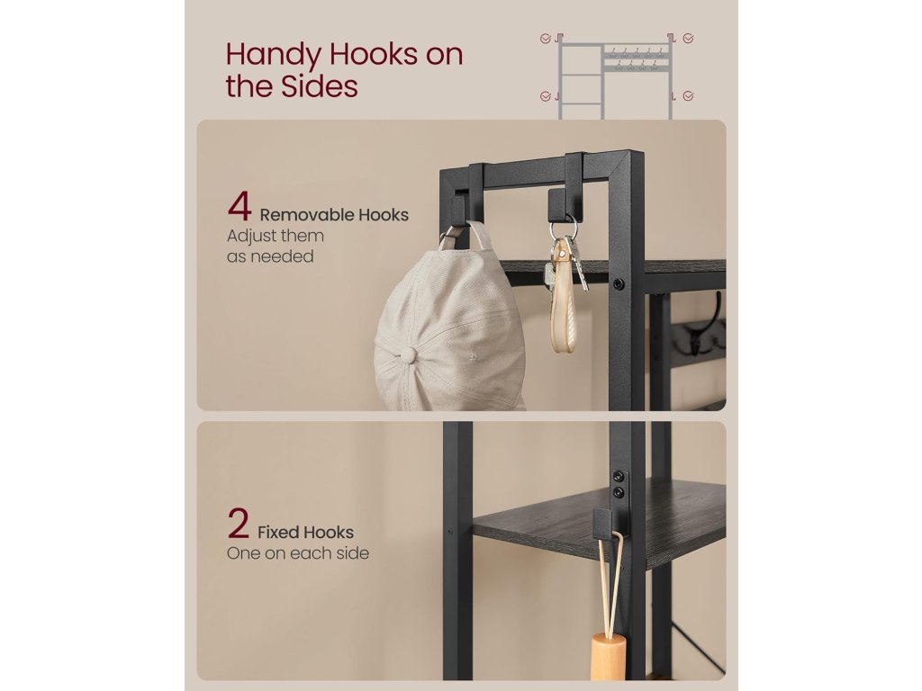 Design 4 v 1 Tento předsíňový strom kombinuje háčky na kabáty, lavici, botník a úložné police, které optimalizují prostor a pomohou vám vytvořit organizovaný a funkční vstupní prostor.Dostatek háčků pro zavěšení všeho 9 trojitých háčků na kabáty, tašky a šály a 6 bočních háčků na klobouky, deštníky, klíče a další předměty, které chcete mít snadno na dosah.5 užitečných panelových polic Pět panelových polic na tomto nábytku do předsíně je praktických pro ukládání košů, tašek a dalších předmětů nebo pro vystavení dekorací. Horní police je po stranách vybavena ochrannými lištami, které zabraňují pádu předmětů.2 police na boty Na 2 spodní kovové police tohoto předsíňového stromu se vejde 13-14 párů bot. Vlevo je výškově nastavitelná police na boty různých velikostí.Robustní a stabilní Vysoce kvalitní dřevotřísková deska a robustní ocelová konstrukce vytvářejí odolný předsíňový strom. Lavice na pravé straně unese až 220 lb. Nastavitelné nožičky a sada proti překlopení zajišťují vyšší stabilitu a bezpečnost.| Kategorie: | Předsíňové stěny |