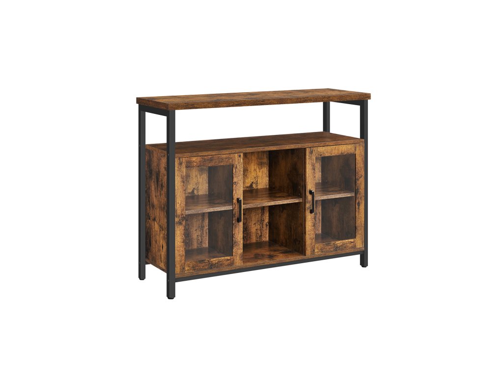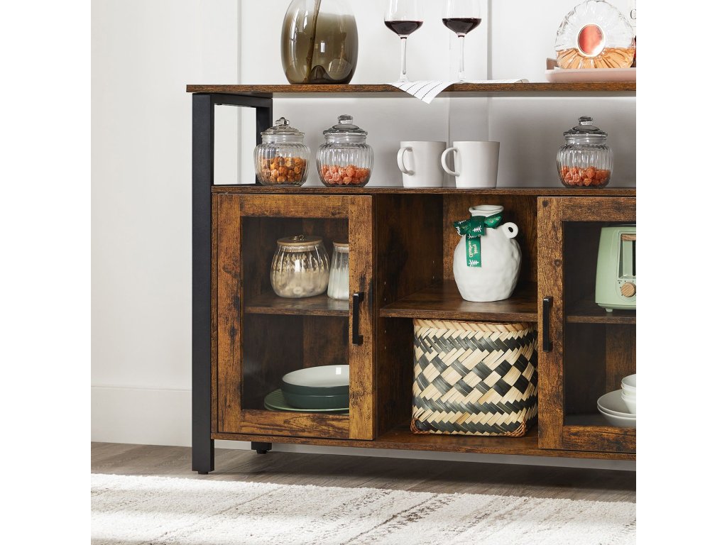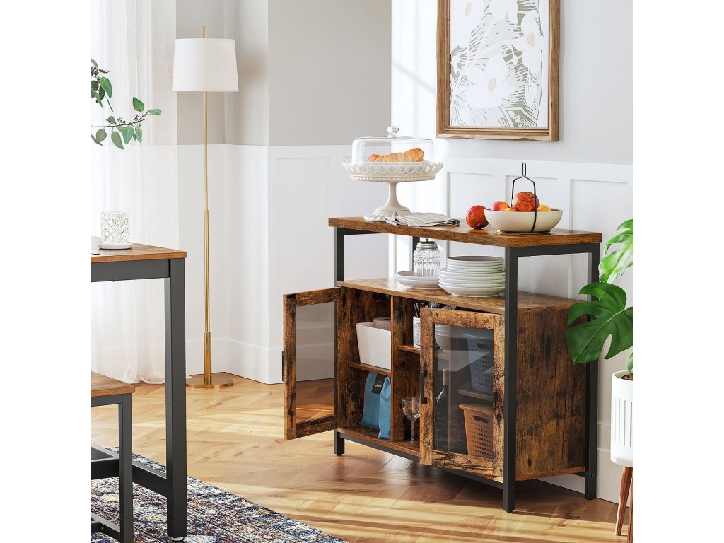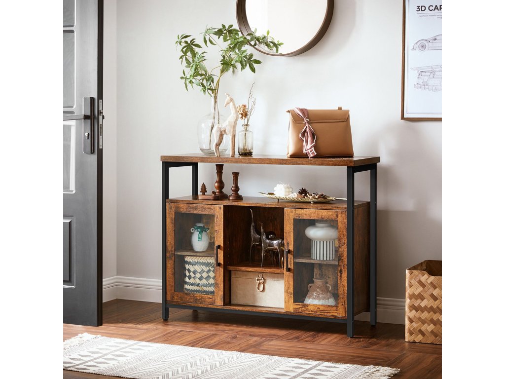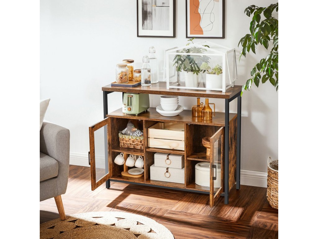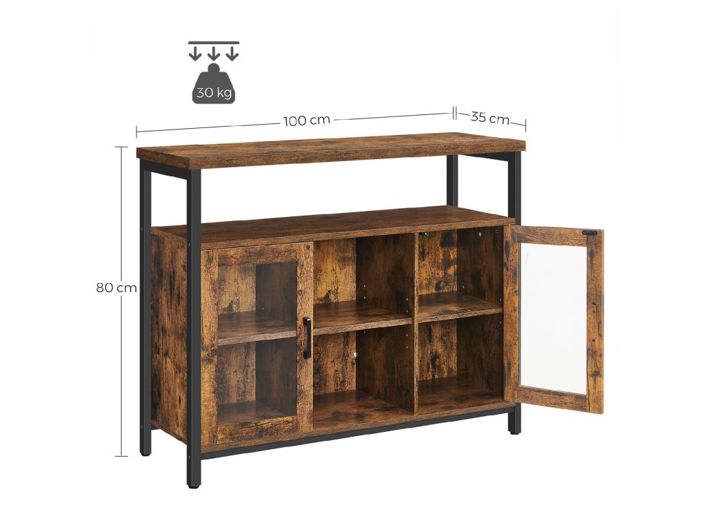 Příborník, bufetový stůl se 2 průhlednými skleněnými dvířky, TV skříňka, s nastavitelnými policemi, do jídelny, 100 x 35 x 80 cm, industriální styl, rustikální hnědá a černá.