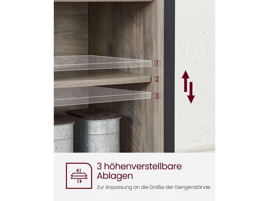 Unikátní posuvné dveře Rustikální dveře, symetrické uspořádání - dvoje posuvné dveře dodávají této kuchyňské skříňce venkovský styl, který lze snadno začlenit do mnoha stylů interiéru.Flexibilní úložiště: 6 míst a tři výškově nastavitelné police ve třech úrovních (také odnímatelné) pro předměty různých velikostí; deska stolu o rozměrech 33 x 100 cm pro více možností.Robustní a pevný: kombinace dřevotřísky a kvalitního kovového rámu dodává příborníku vysokou stabilitu a pevnost. Nastavitelné nožičky udržují skříňku v rovnováze a ochrana proti naklonění zajišťuje větší stabilitu.Všestranné využití: tuto skříňku můžete použít jako příborník v kuchyni, jako skříňku na drobnosti v předsíni, jako skříňku na televizi v obývacím pokoji nebo jako skříňku na dokumenty v domácí kanceláři.Snadná instalace Díky jasnému návodu a označeným dílům je montáž této kuchyňské skříňky hračkou. Součástí balení jsou také náhradní šrouby| Kategorie: | Komody |