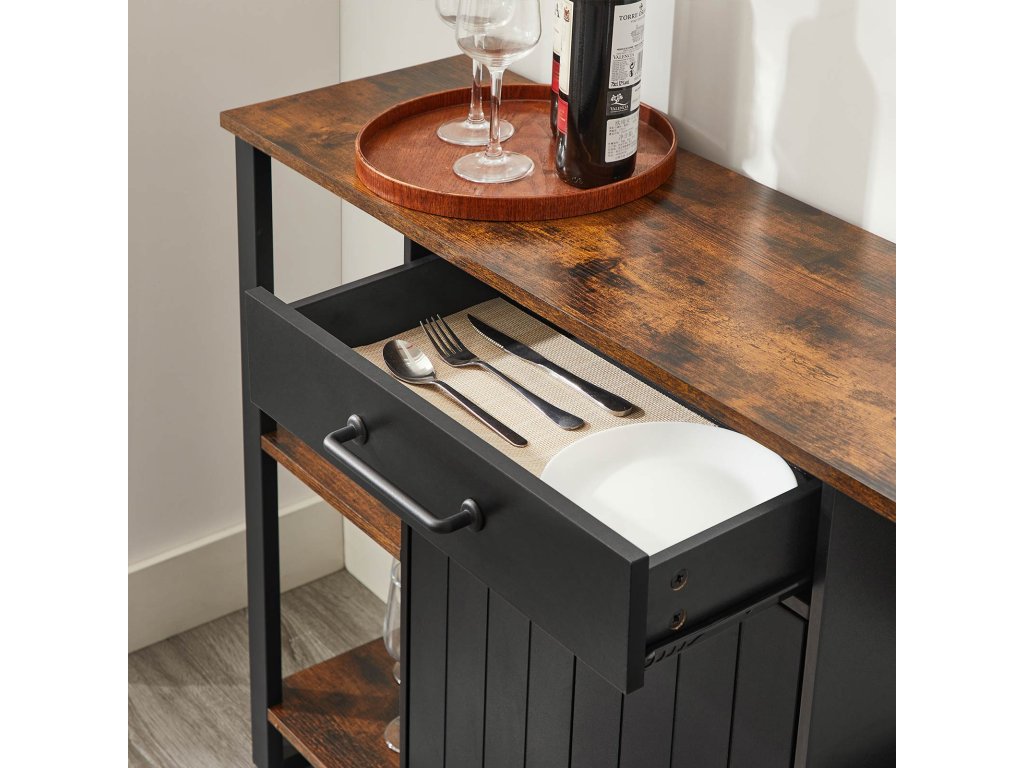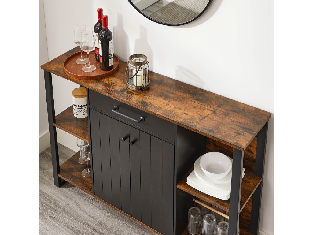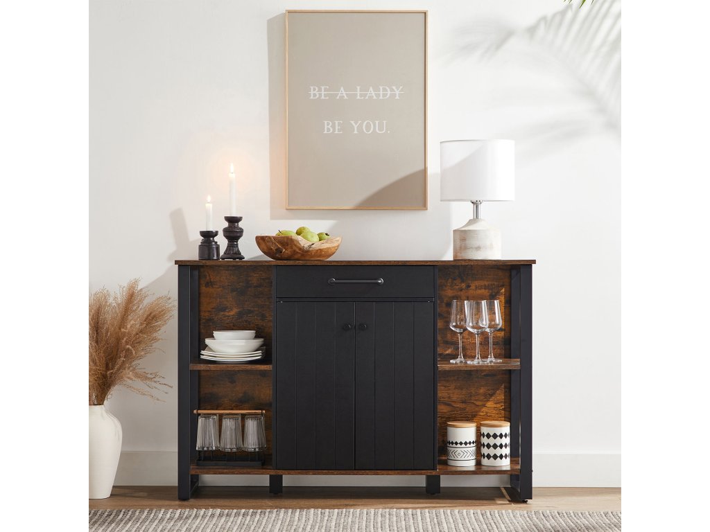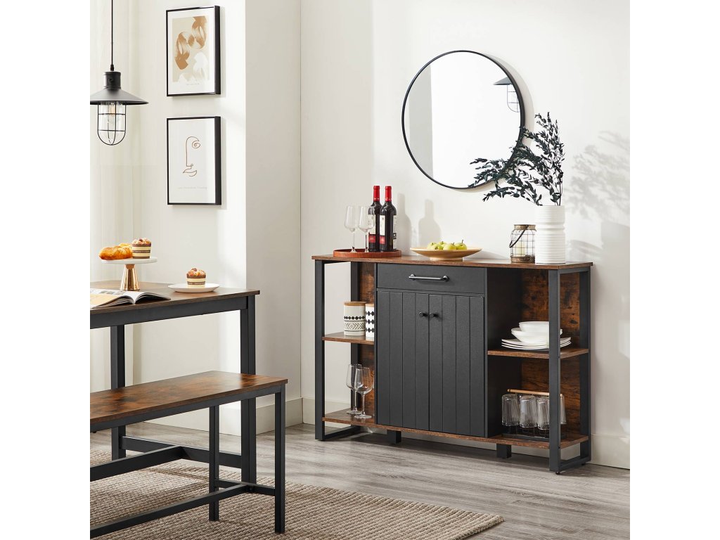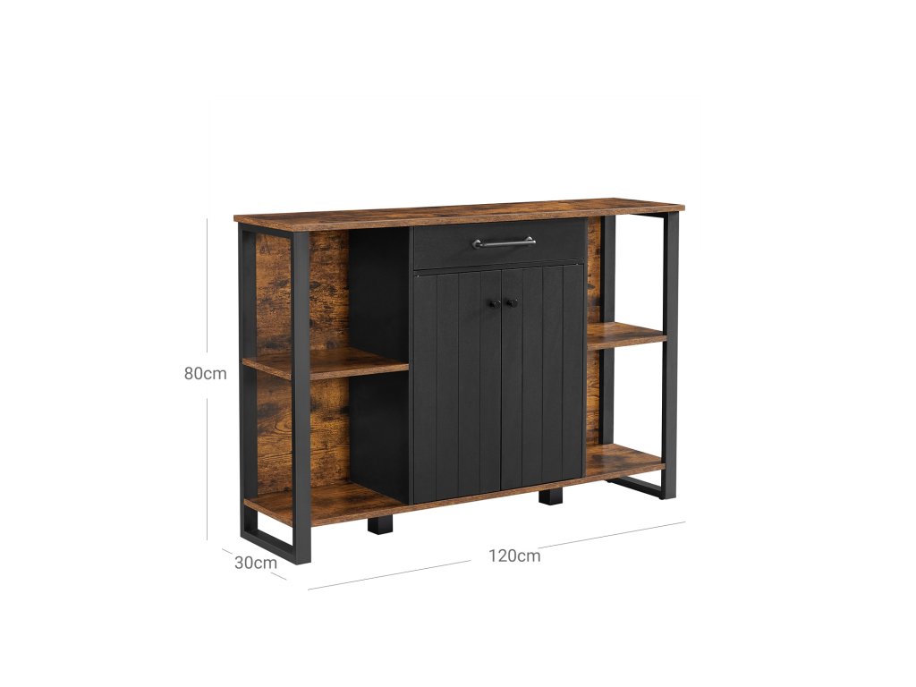 Příborník, kuchyňská skříňka, úložný organizér, skříňka se zásuvkou, policemi, dvířky, ocelový rám, boční skříňka do obývacího pokoje, jídelny, předsíně, rustikální hnědá a černá.