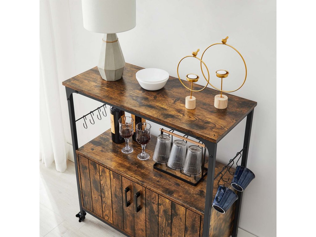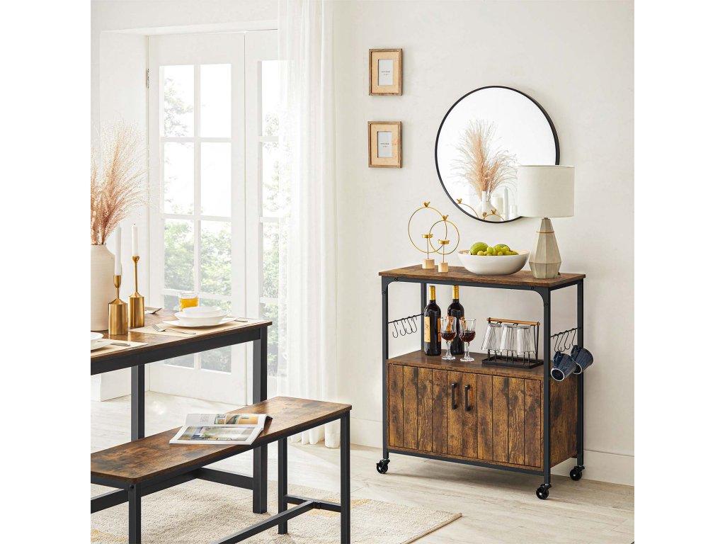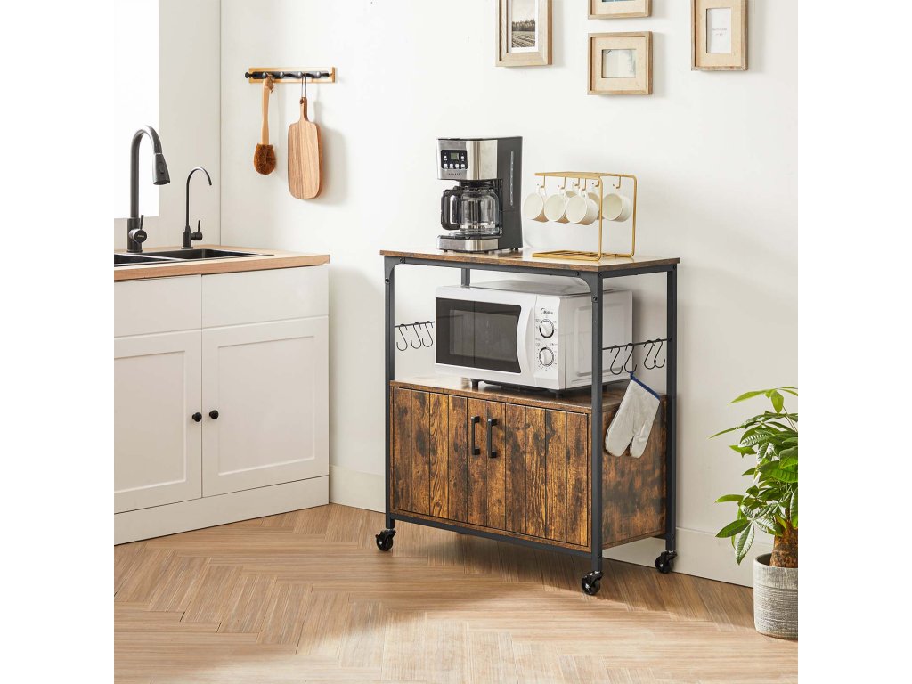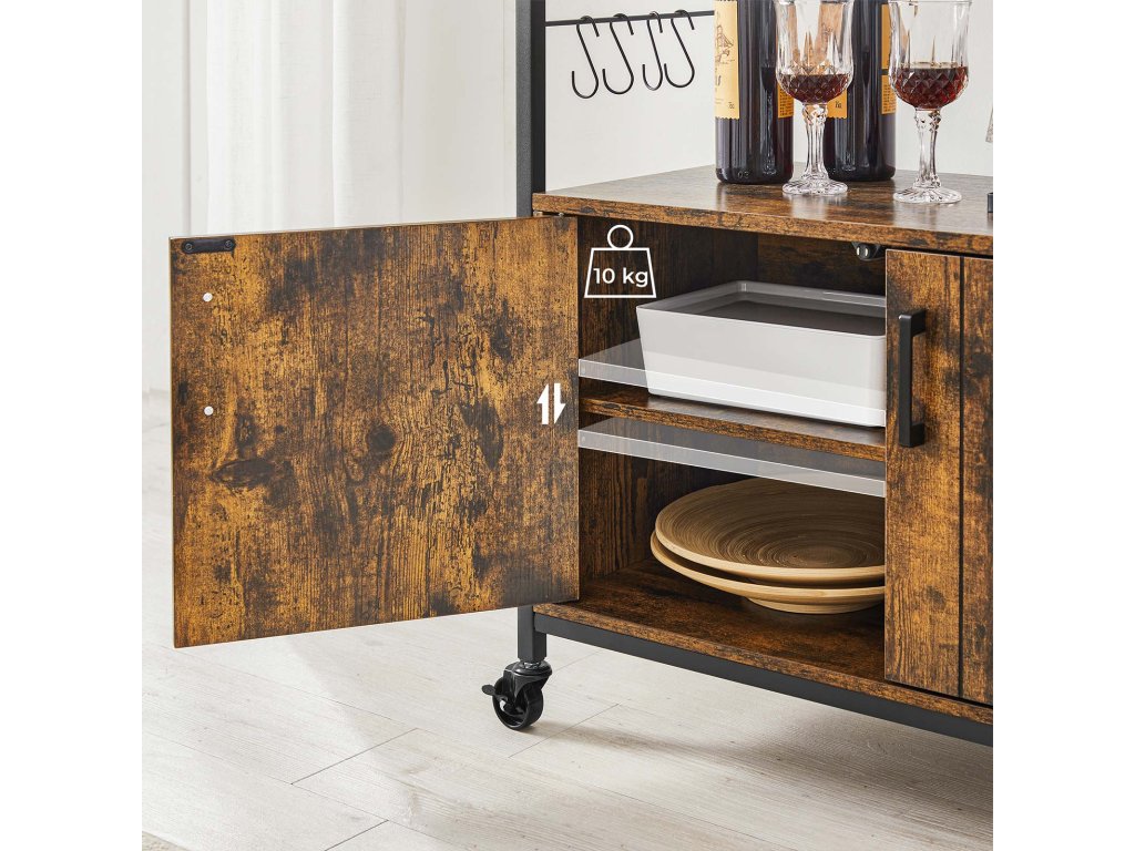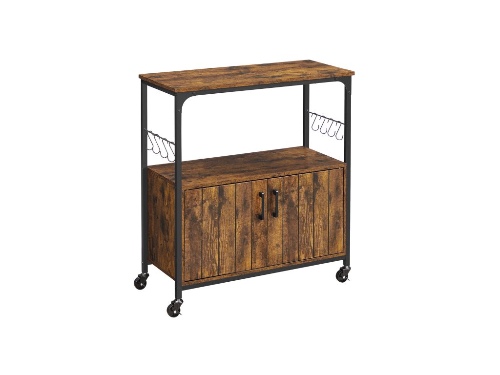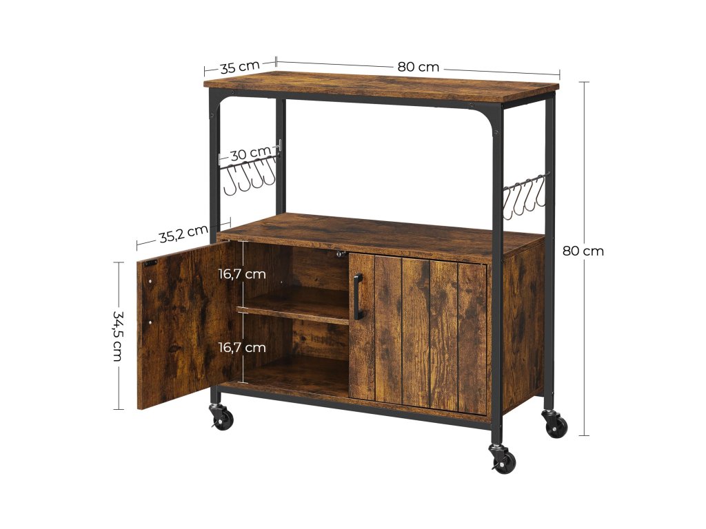 Příborník, kuchyňský ostrov, pekařský regál s kolečky, vozík na potraviny s dvířky, 8 háčků, úložné police, 80 x 35 x 80 cm, průmyslová kuchyňská skříň, rustikální hnědá a černá.