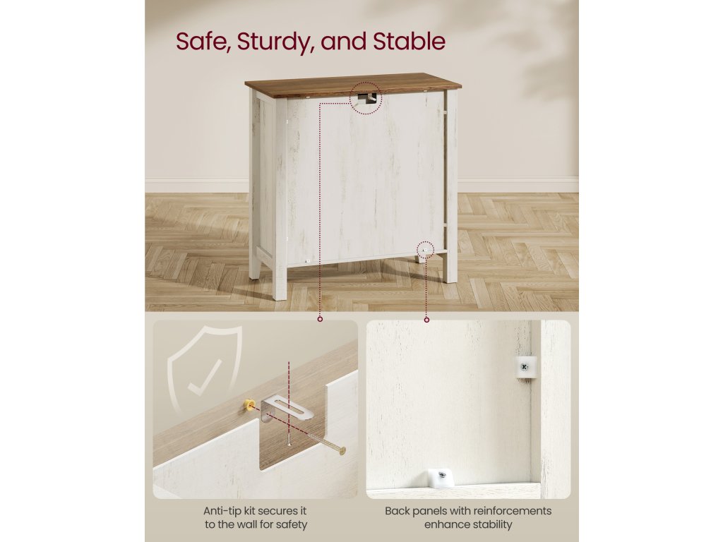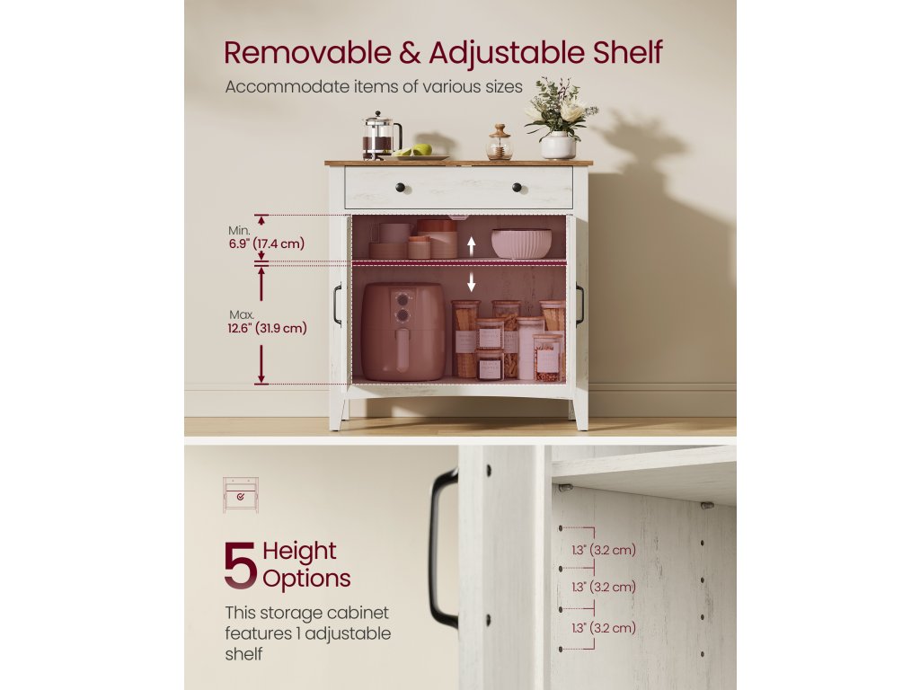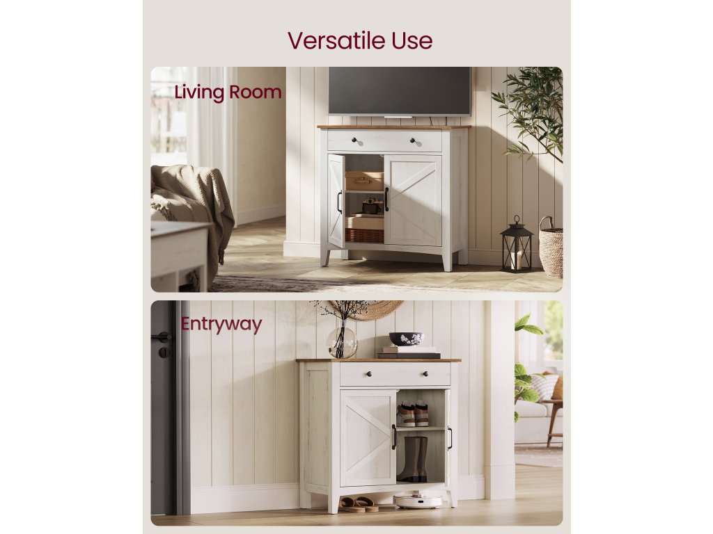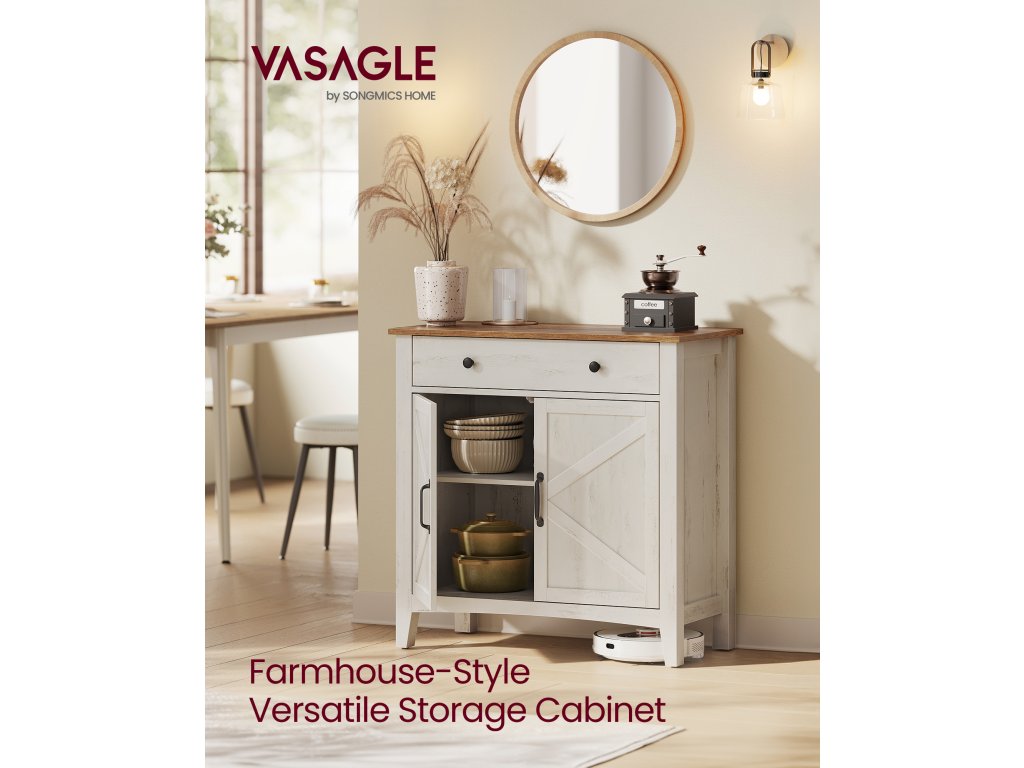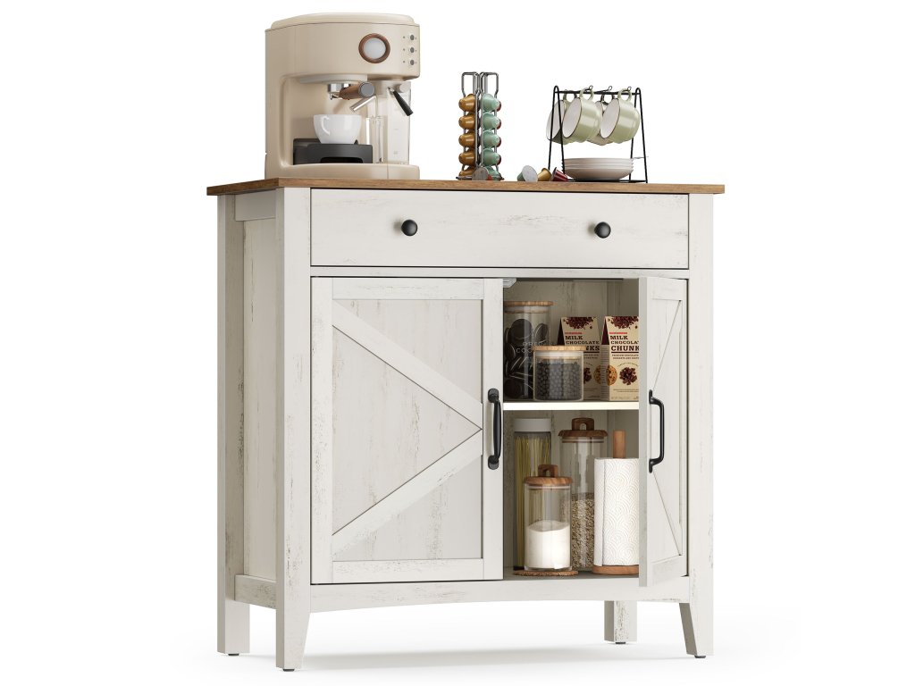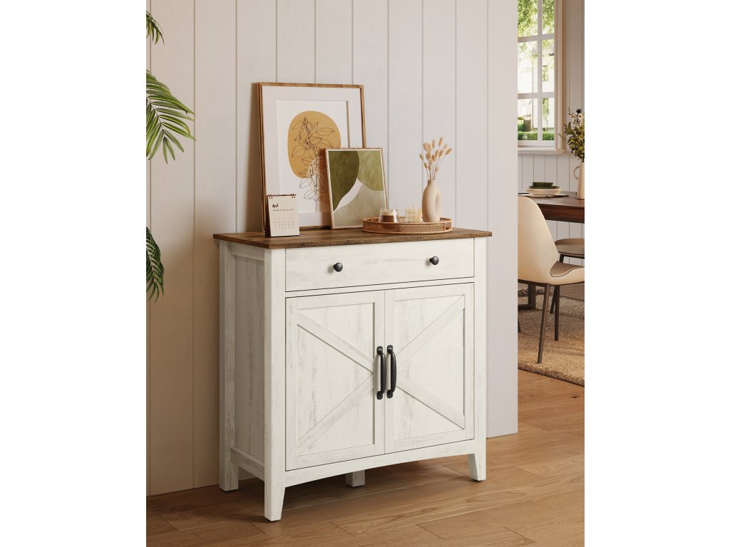 Farmářský univerzální přístroj Harmonická kombinace bílé a hnědé barvy a dveře ve stylu stodoly dělají z této jednotky elegantní TV stojan v obývacím pokoji. bufetová nebo barová skříňka do kuchyně či jídelny nebo konzolový stolek do předsíně.Dostatek úložného prostoru Prostorná zásuvka na drobnosti, velkorysá stolní deska pro vystavení dekorací a prostorná spodní skříňka na větší předměty. tento příborník vyhoví vašim různým úložným potřebámPřizpůsobitelný design Tato kuchyňská skříňka se dodává s přizpůsobitelným děličem zásuvek, který vám umožní uspořádat prostor zásuvek podle vašich potřeb. Spodní skříňka je vybavena nastavitelnou policí s 5 možnostmi nastavení výšky, která umožňuje ukládat předměty různých velikostí.Built to Last Díky vysoce kvalitní konstrukci z dřevotřískových desek a MDF zajišťuje tato skříňka do obývacího pokoje stabilitu a dlouhou životnost. pomáhá udržovat váš prostor organizovaný a pohodlný rok co rok.Promyšlené detaily Tato úložná skříňka, která upřednostňuje vaši bezpečnost a pohodlí, je vybavena sadou proti převrácení pro zajištění stability, otvorem pro kabely pro efektivní vedení kabelů. a vysoké nohy, které usnadňují čištění pod nimi.| Kategorie: | Komody |