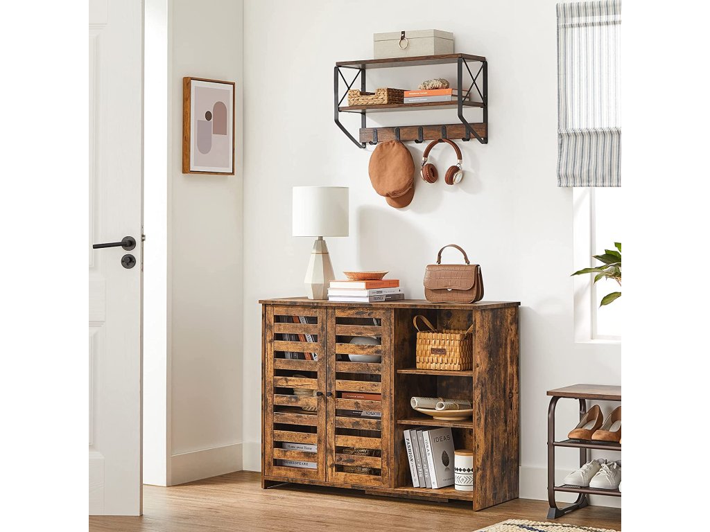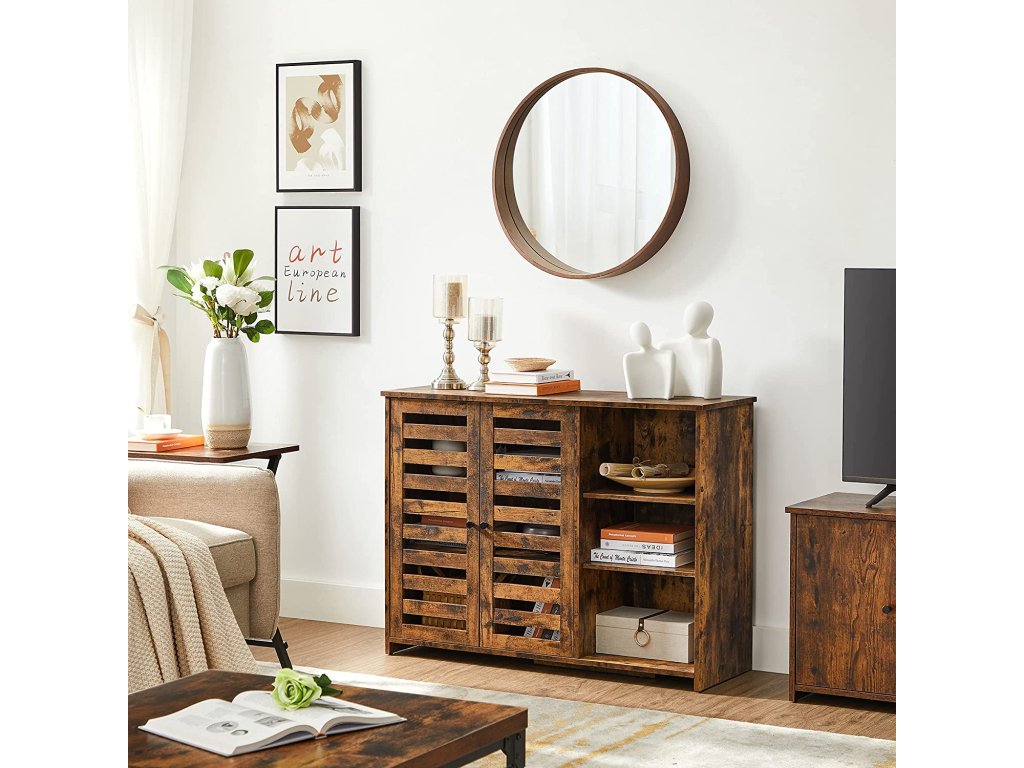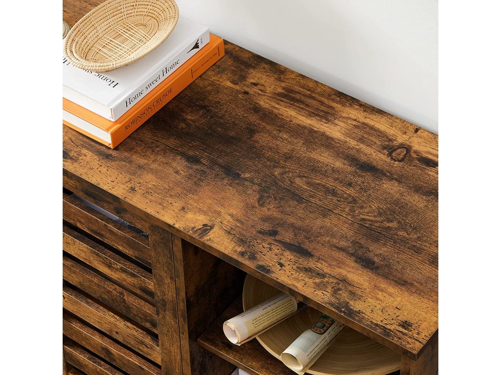 CO ZÍSKÁTE: Skříňka v rustikální barvě dřeva o rozměrech 110 x 35 x 75 cm se 3 otevřenými přihrádkami a 2 lamelovými dvířky, které poskytují otevřený i skrytý úložný prostor a obohatí váš domov.| Kategorie: | Komody |