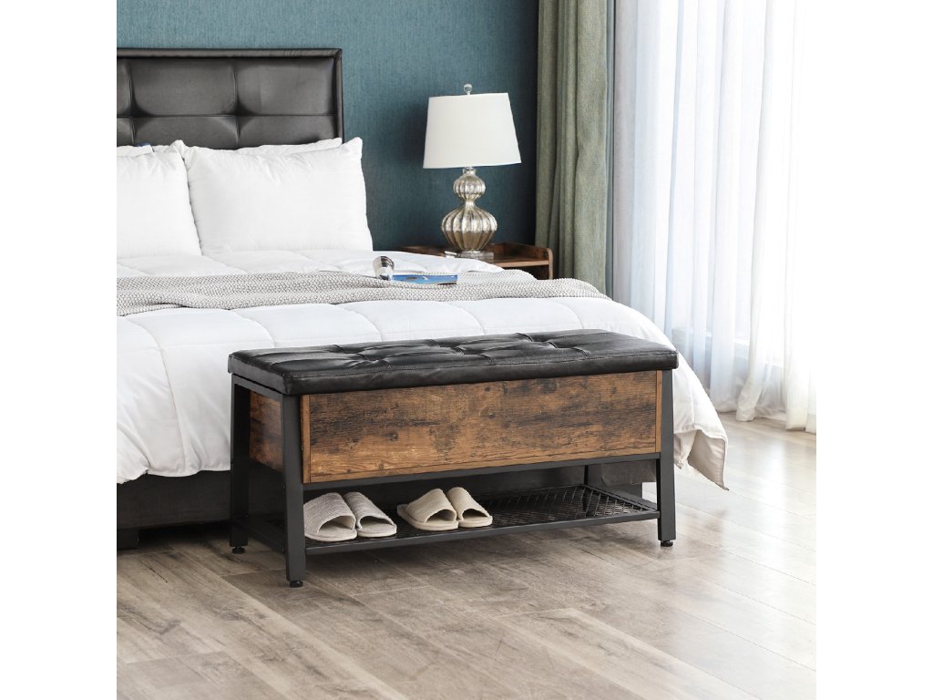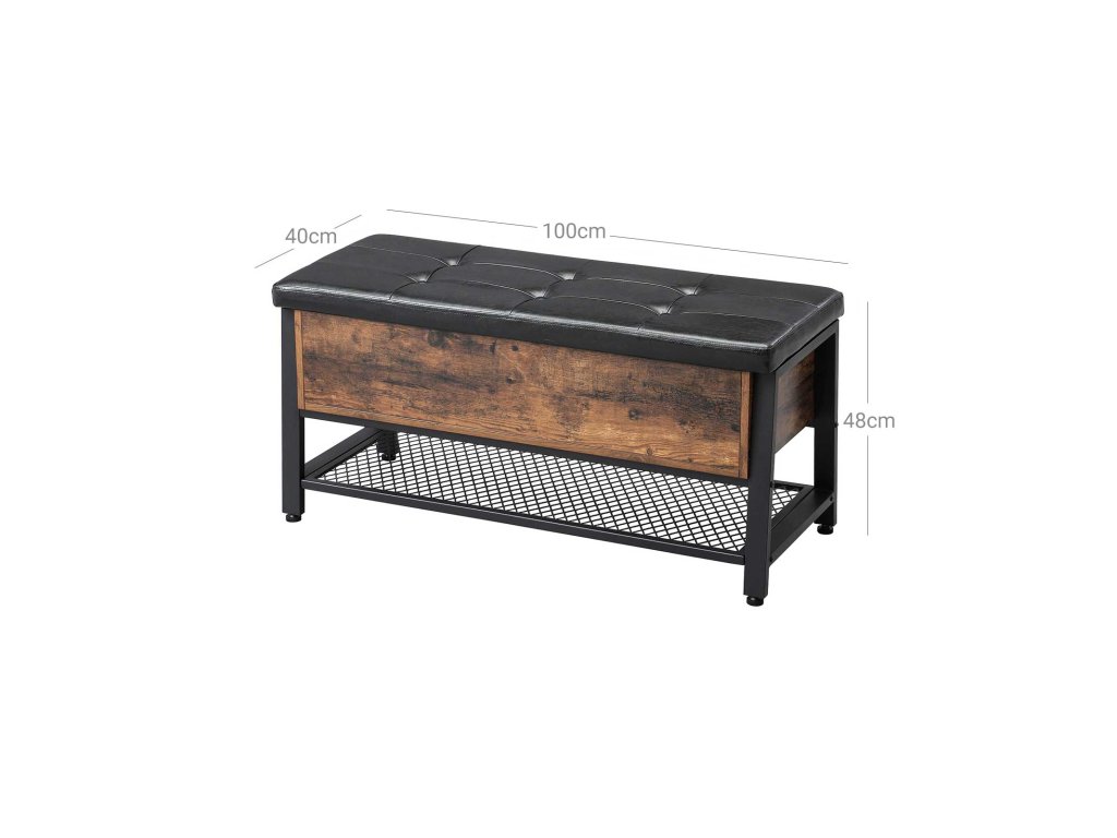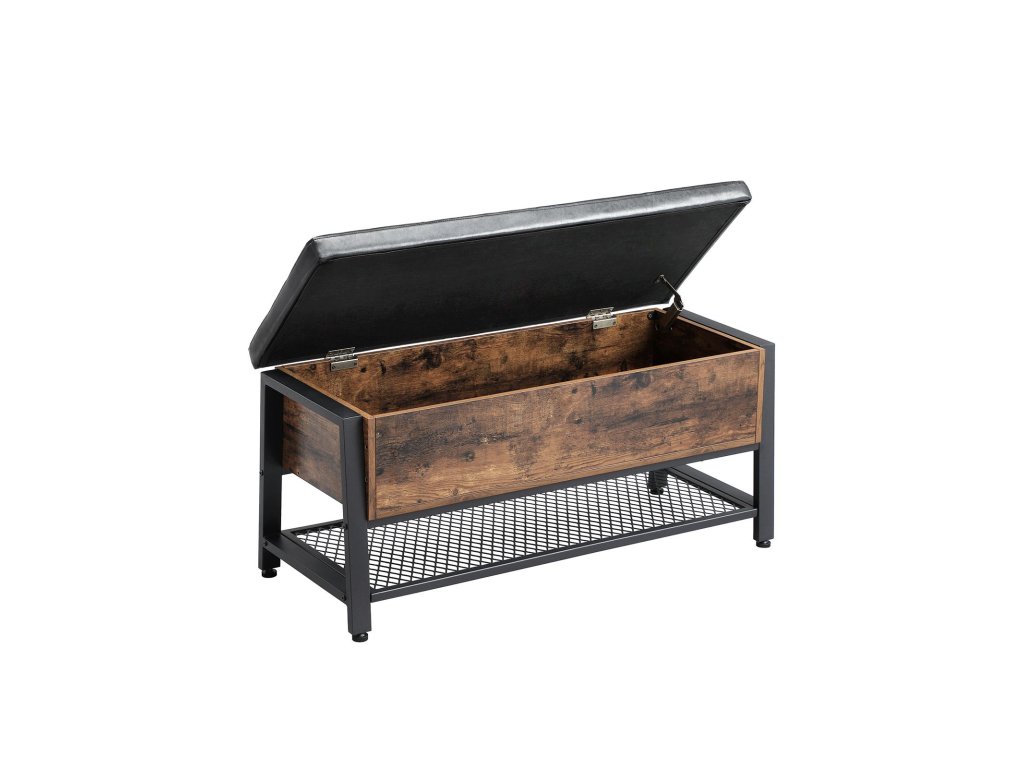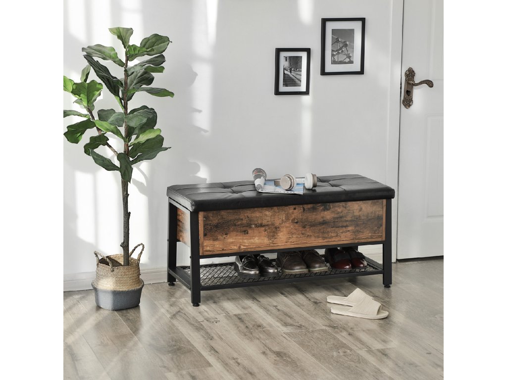 ŽELEZNÝ RÁM S PŮVABEM CHESTERFIELDU: Tato lavice na boty s lehce lesklým povrchem z imitace kůže je cenově dostupnou variantou slavných anglických modelů, která se vyznačuje chesterfieldským stylem s klasickými záhyby látky a čalouněním s všívanou látkou. Černý železný rám a rustikální dřevěné akcenty mu dodávají další kouzlo.SE SKRYTOU PŘIHRÁDKOU: Pod velkou plochou sedadla se nachází prostorná přihrádka na veškeré příslušenství a bezpečnostní závěs udržuje schránku otevřenou. Úložný prostor nabízí také robustní síťovaná police pod ním.HLEDÁTE TIPY NA VYBAVENÍ? Tuto pohodlnou sedací komodu můžete použít jako lavici na boty v předsíni nebo jako odkládací taburet v obývacím pokoji. Tento kus nábytku navíc dodá každé kanceláři kosmopolitní nádech.