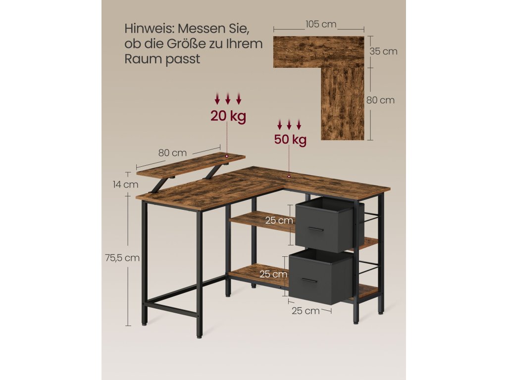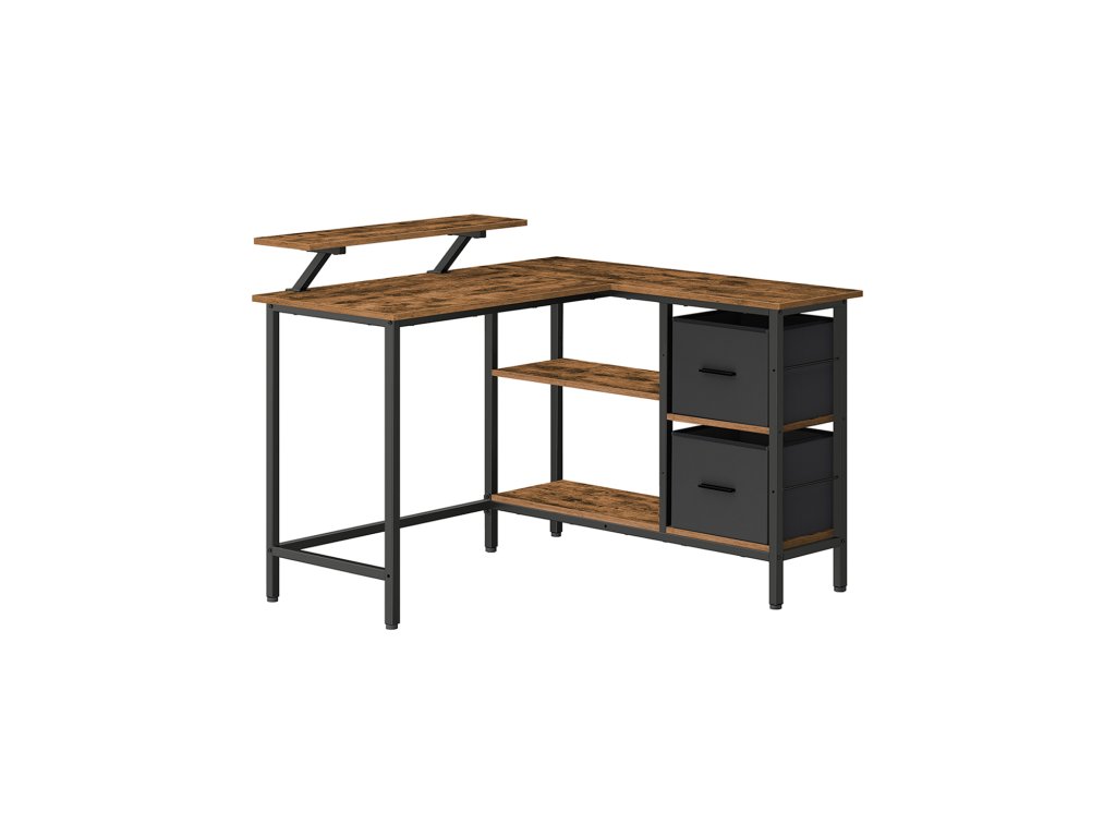 Psací stůl ve tvaru L se 2 prostornými zásuvkami, herní stůl s podstavcem na monitor, rohový psací stůl, počítačový stůl s nastavitelnou odkládací policí, pro domácí kancelář, rustikální hnědá.