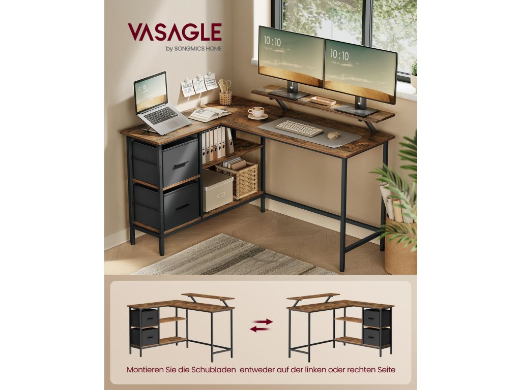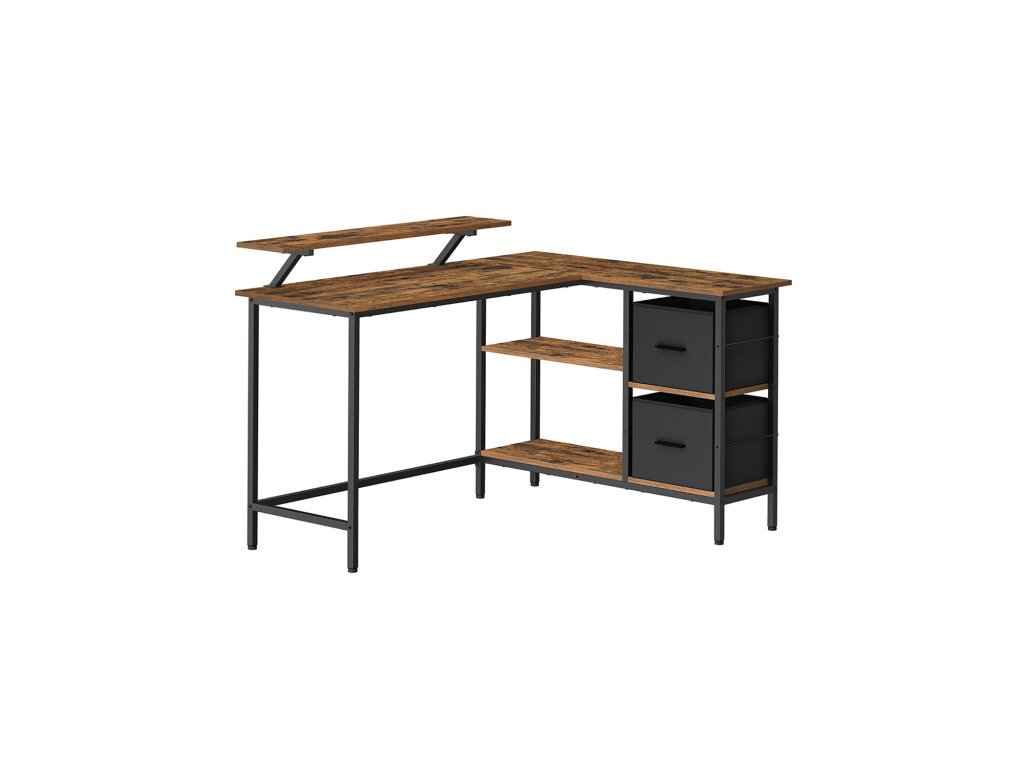 Psací stůl ve tvaru L se 2 prostornými zásuvkami, herní stůl s podstavcem na monitor, rohový psací stůl, počítačový stůl s nastavitelnou odkládací policí, pro domácí kancelář, rustikální hnědá.