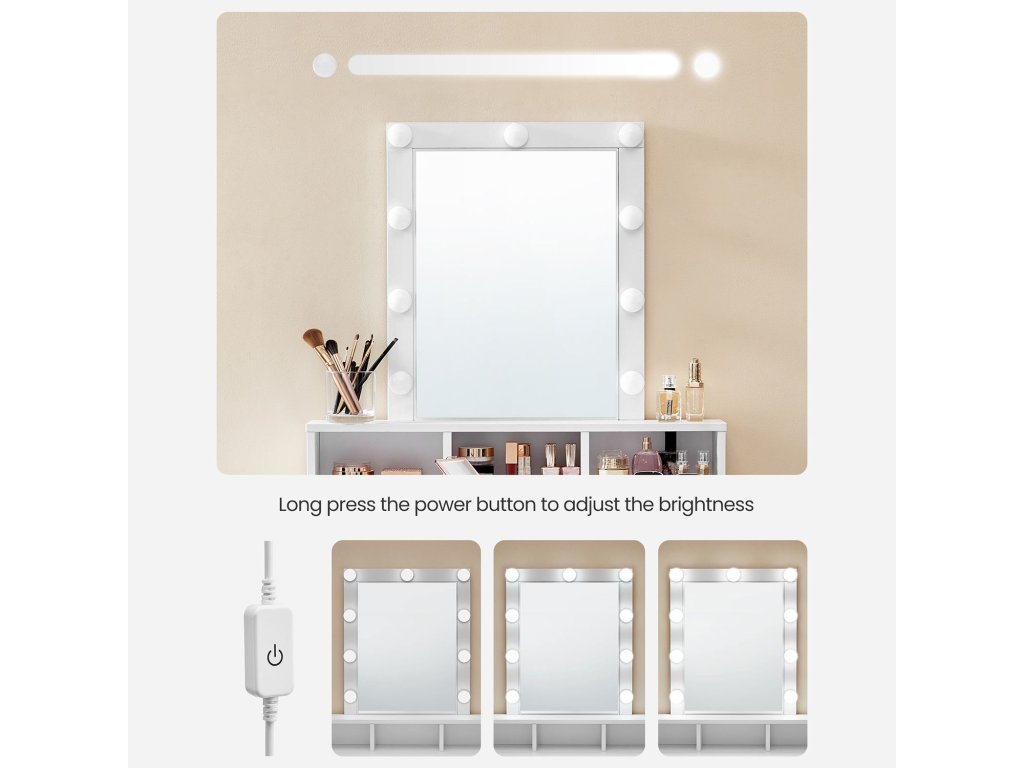 Všechno tam: nebaví vás každý den hledat make-up? Žádný problém. Oční stíny a pudr jsou nyní ve dvou velkých zásuvkách, lak na nehty je dobře chráněn ve 3 otevřených přihrádkách a lahvičky s parfémy lze umístit na vyvýšenou polici.Začněte den s radostí: moderní design a světlá barva tohoto kosmetického stolku vám vždy vykouzlí úsměv na tváři. Využijte svůj šperk k vyzkoušení nejnovějších triků při líčení.Vždy v perfektní kondici: pokud jste po nanesení make-upu šokováni, že na toaletním stolku jsou skvrny od make-upu, můžeme vás uklidnit. Má melaminový povrch, který se snadno čistí.Obsah: toaletní stolek se žárovkami, očíslovanými položkami a snadným návodem (angličtina není zaručena). Obdržíte také zařízení proti překlopení a skvělou příležitost k odpočinku a přípravě.| Kategorie: | Toaletní stolky |