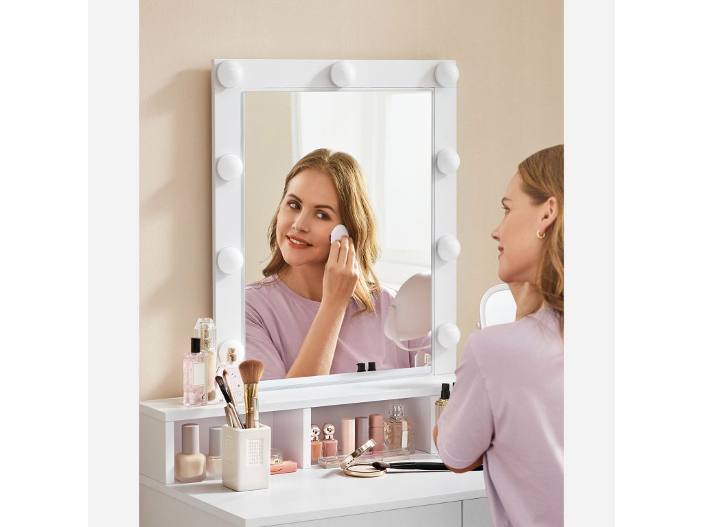 Bezchybné. Rozlučte se s rozmazaným make-upem, který vám zničí celý vzhled. Devět stmívatelných žárovek obklopujících zrcátko rozjasní vaši zkrášlovací plochu a umožní dokonalé nalíčení očí.