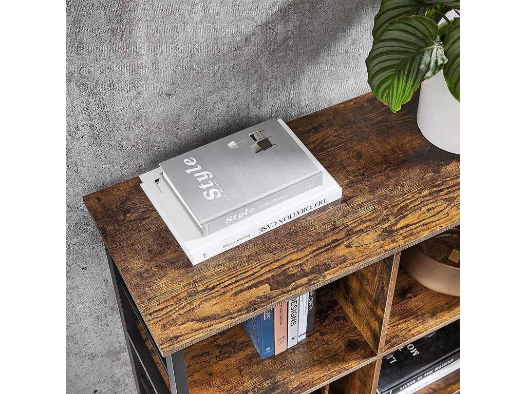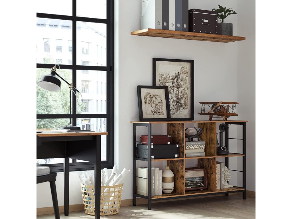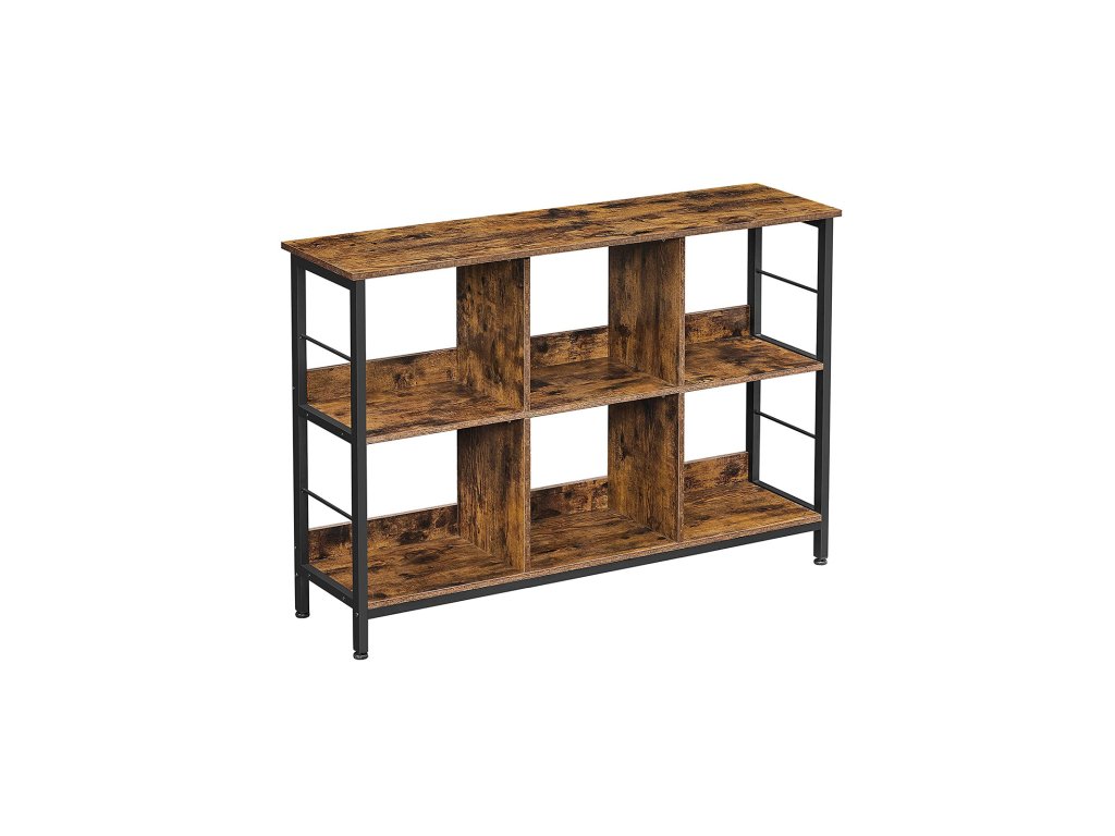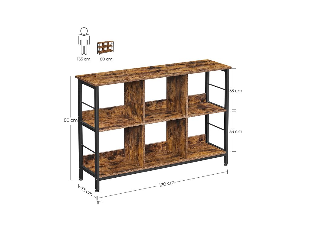Regál, knihovna, policová skříňka, televizní stolek, konzolový stolek, 6 přihrádek, do kanceláře, obývacího pokoje, ložnice, 33 x 120 x 80 cm, průmyslový design, rustikální hnědá a černá.