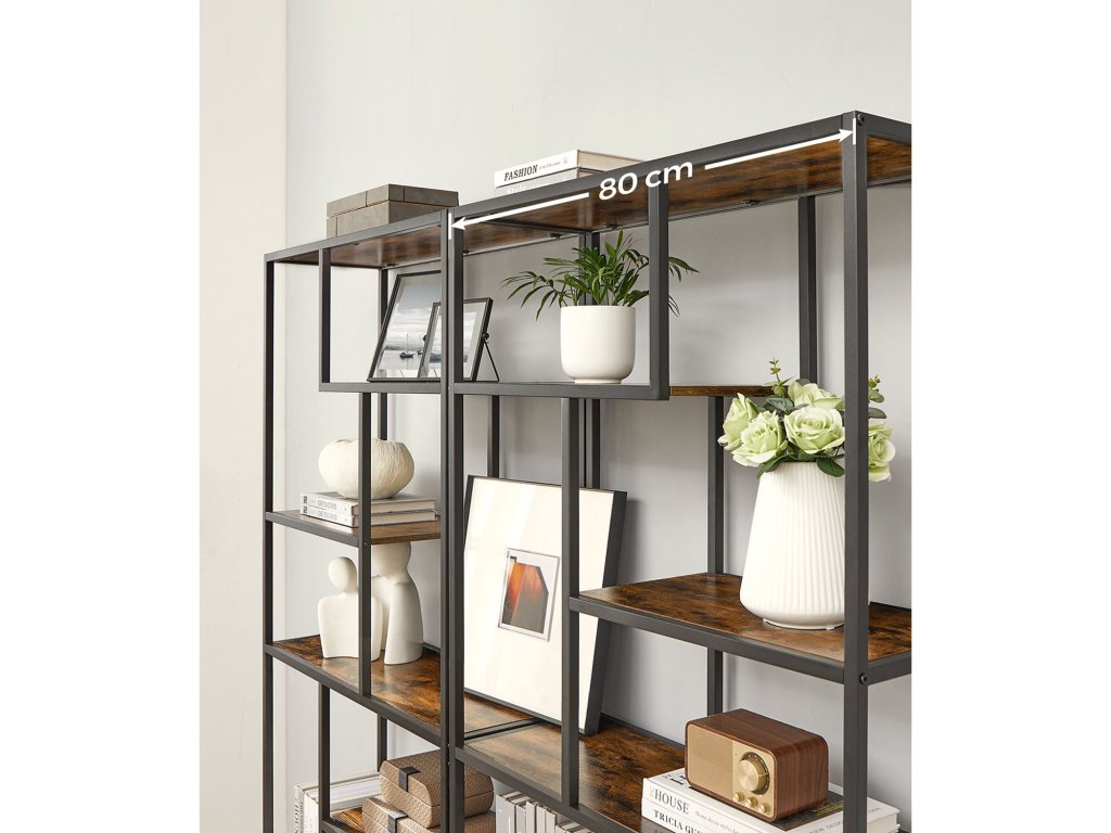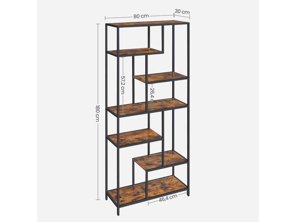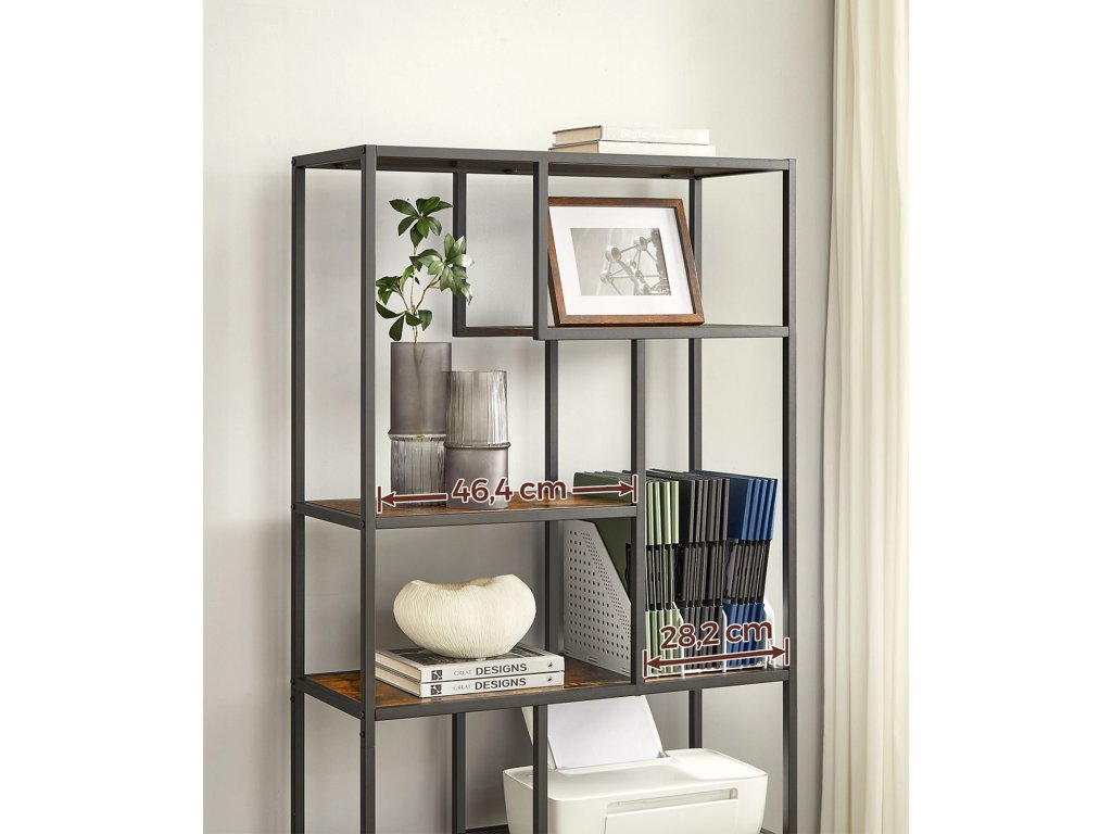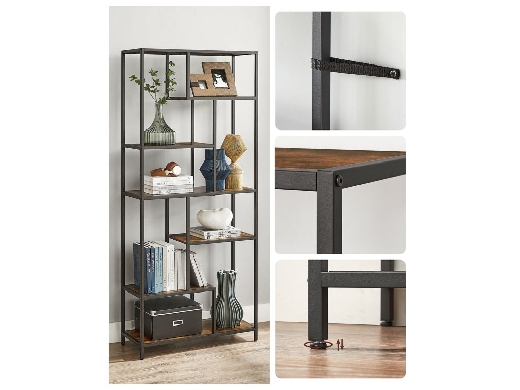 Více možností ukládání: Tato šestipatrová knihovna geometrického tvaru má police různých výšek (max. výška: 57,2 cm, min. výška: 26,4 cm), které usnadňují ukládání drobností různých velikostí.Různá použití, více možností: Tento regál lze použít v pracovně k ukládání knih a časopisů, v obývacím pokoji k vystavení fotografií nebo ozdob nebo v kuchyni k ukládání lahví a sklenic.Odolné a robustní: Dřevotřísková deska a ocel společně zajišťují odolnost, robustnost a dlouhou životnost, ať už se tato policová jednotka nachází kdekoli ve vaší domácnosti. dělat vám společnost po všechny dobré časy, které přijdou.Dobrá stabilita: Tato vysoká knihovna má na spodní straně nastavitelné nožičky, díky nimž je police stabilní i na mírně nerovném terénu; sada proti překlopení dále zvyšuje stabilitu a bezpečnost této dekorativní knihovny;Snadná montáž: Nepotřebujete žádné další nářadí! S podrobným návodem a očíslovanými díly tento šestipatrový dekorativní regál rychle sestavíte a můžete se pustit do zdobení, než se nadějete.| Kategorie: | Knihovny |
