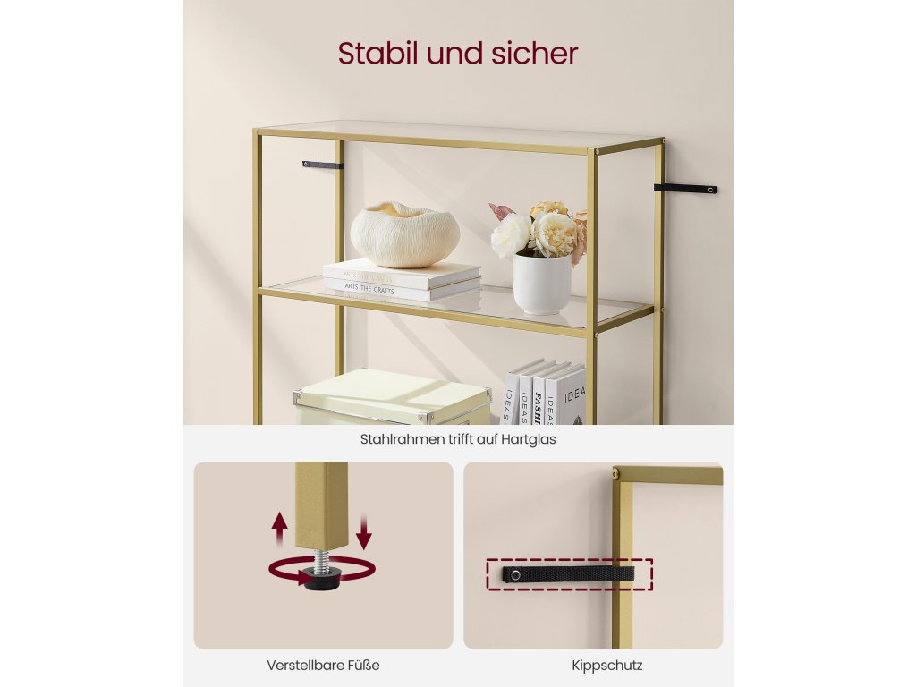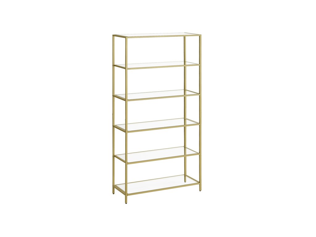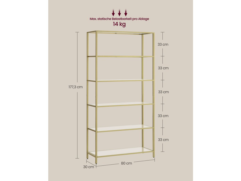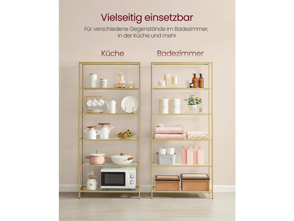 Regál na knihy, 6-patrový vysoký regál, stojan na rostliny, výstavní police, 30 x 80 x 180 cm, tvrzené sklo, do pracovny, kanceláře, obývacího pokoje, ložnice, kuchyně, zlatá...