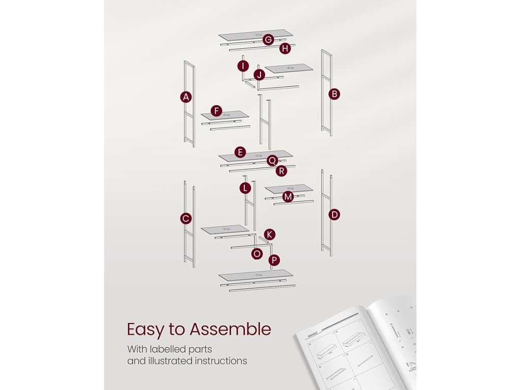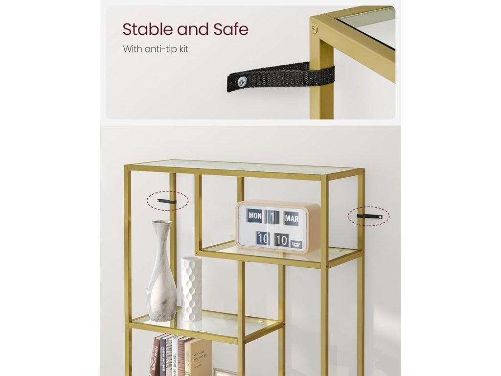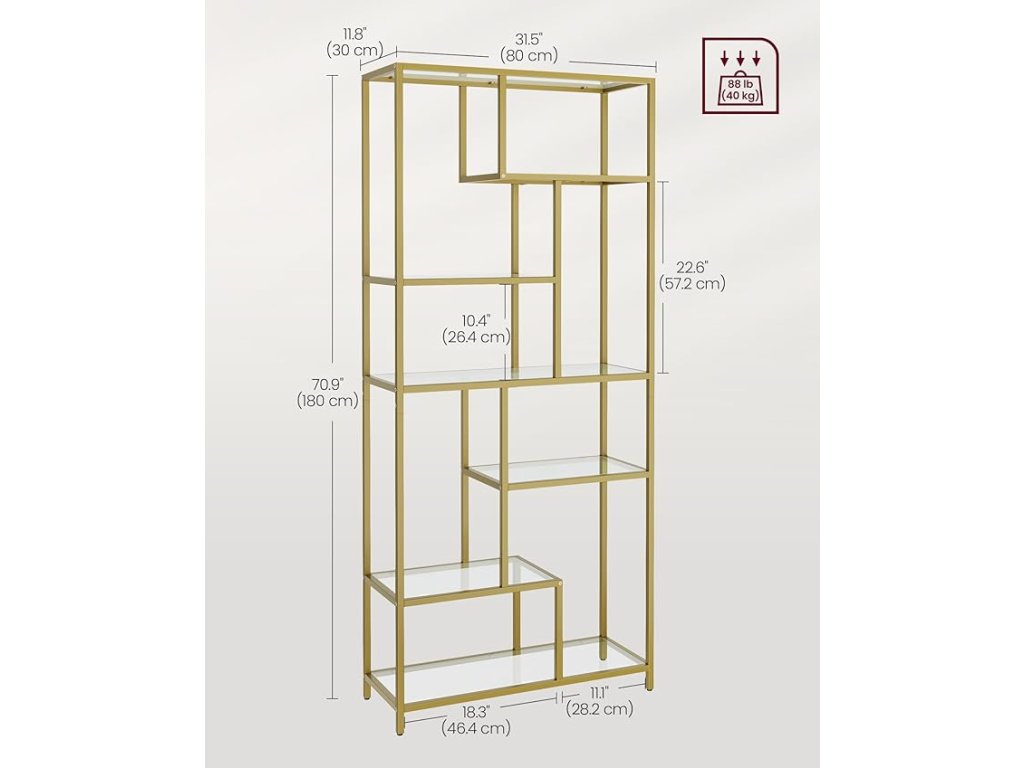 Více možností uložení Tato knihovna geometrického tvaru o rozměrech 30 x 80 x 180 cm má police různých výšek (max. výška: 57,2 cm, min. výška: 26,4 cm) pro snadné uložení drobností různých velikostí.Různé využití, více možností Tento šestipatrový regál lze použít v pracovně k ukládání knih a časopisů, v obývacím pokoji k vystavení fotografií nebo ozdob. nebo v kuchyni k uložení lahví a sklenic.Odolný a robustní Díky robustnímu tvrzenému sklu a oceli unese tato policová skříň až 40 kg. Zaručuje odolnost, robustnost a dlouhou životnost všude tam, kde se tato policová jednotka nachází ve vaší domácnosti, a bude vám dělat společnost po všechny dobré časy.Dobrá stabilita Tato vysoká knihovna má na spodní straně nastavitelné nožičky, díky nimž je police stabilní i na mírně nerovném povrchu; sada proti překlopení dále zvyšuje stabilitu a bezpečnost této dekorativní knihovny;Snadná montáž Není třeba žádné další nářadí! S podrobným návodem a číslovanými díly tento šestipatrový dekorativní regál rychle sestavíte a můžete se pustit do zdobení, než se nadějete.| Kategorie: | Knihovny |