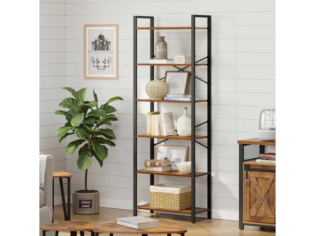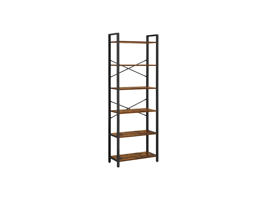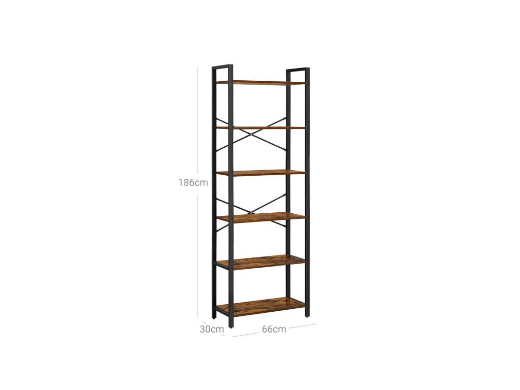 Regál na knihy, 6patrový regál s ocelovým rámem, vysoké rustikální police do obývacího pokoje, kanceláře, pracovny, předsíně, industriální styl, 66 x 30 x 186 cm, rustikální hnědá a černá.