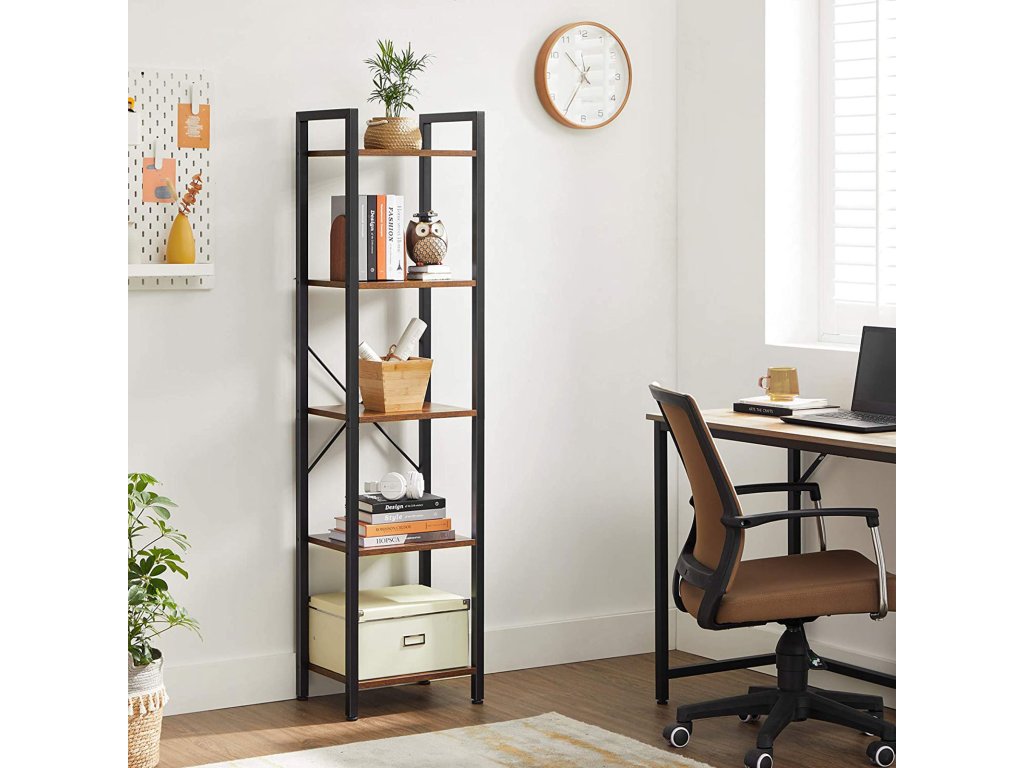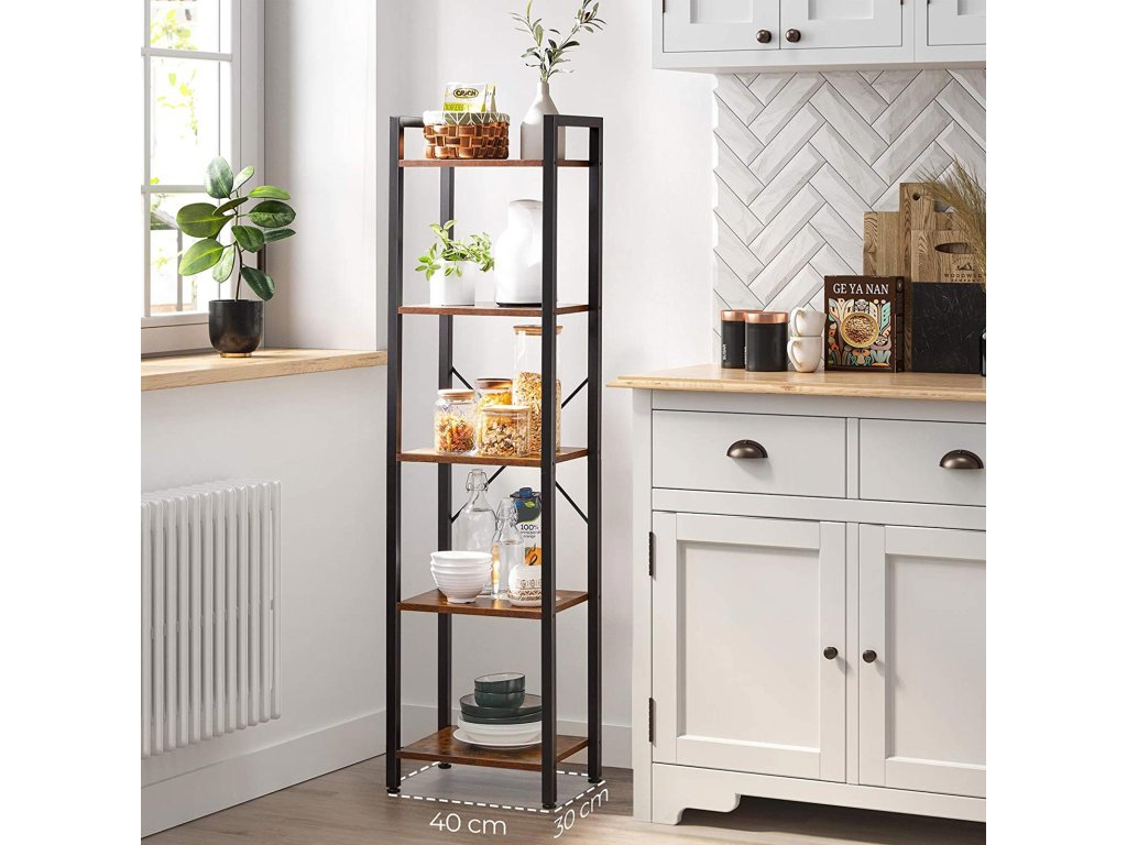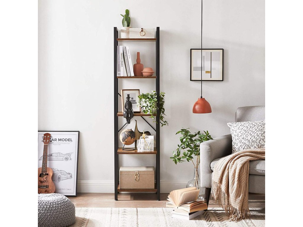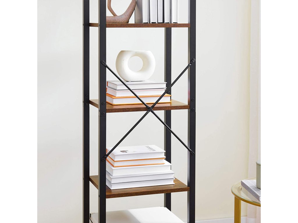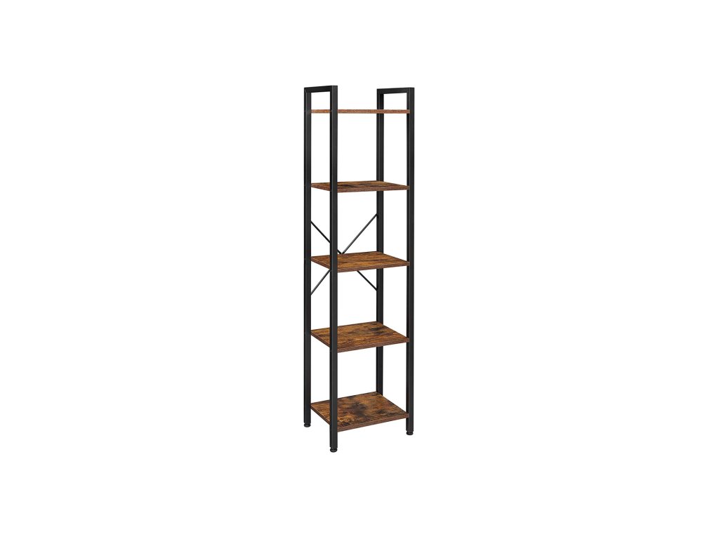 Regál na knihy, pětipatrový, stojanový stojan s ocelovým rámem, do obývacího pokoje, kanceláře, pracovny, předsíně, industriální styl, rustikální hnědá a černá.