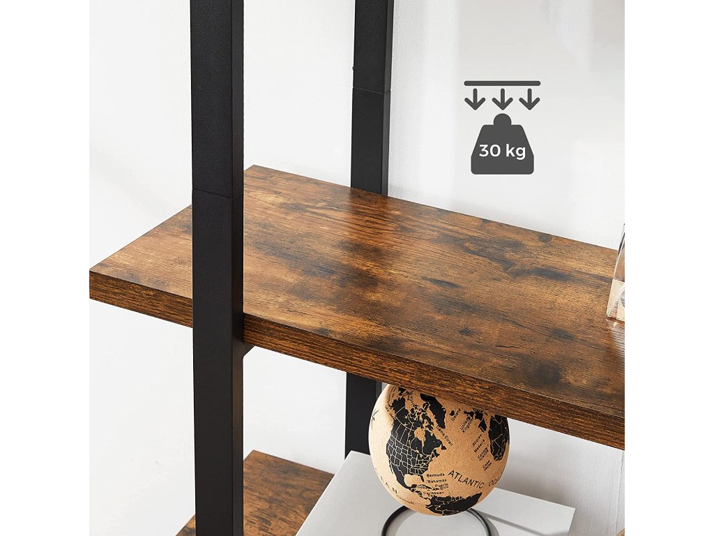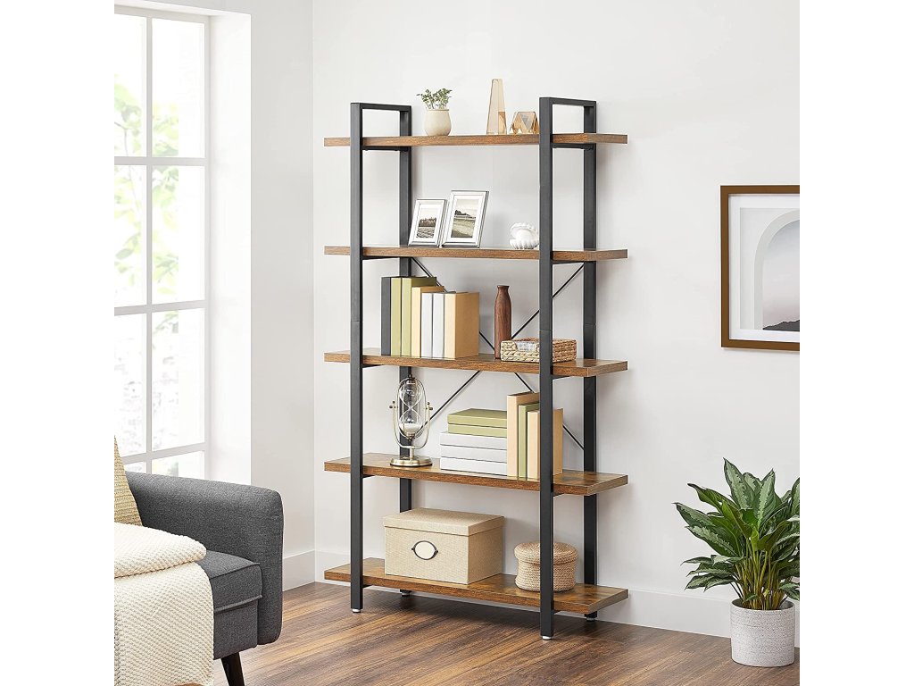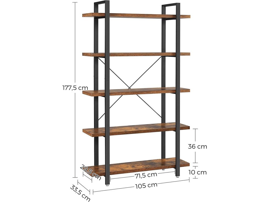Regál na knihy, pětipatrový průmyslový stabilní regál, úložný regál, stojící police, snadná montáž, obývací pokoj, ložnice, kancelář, rustikální hnědá a černá.