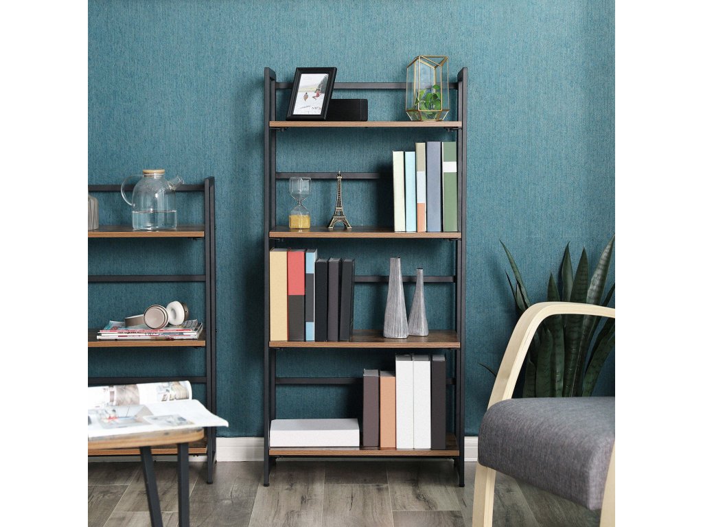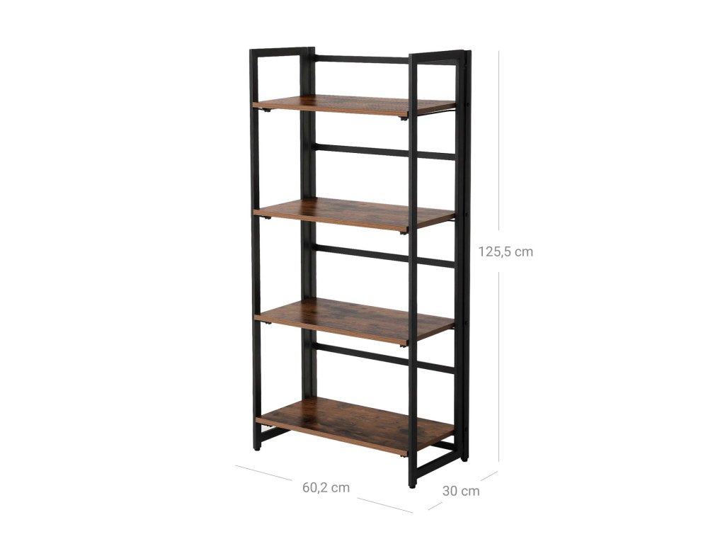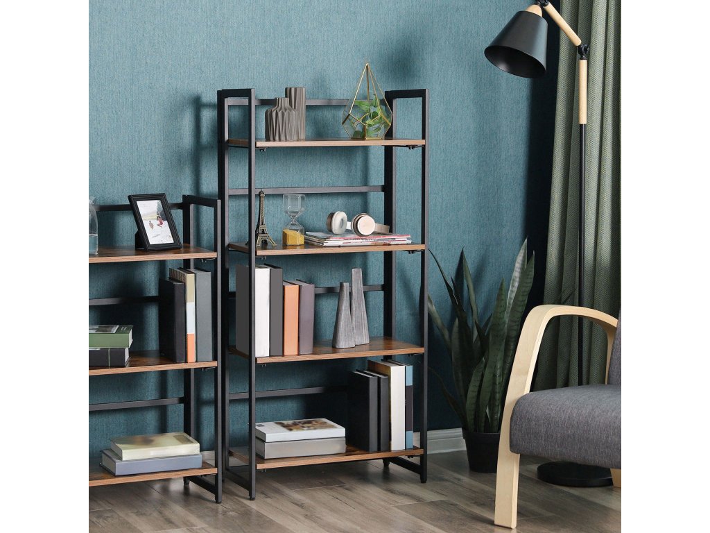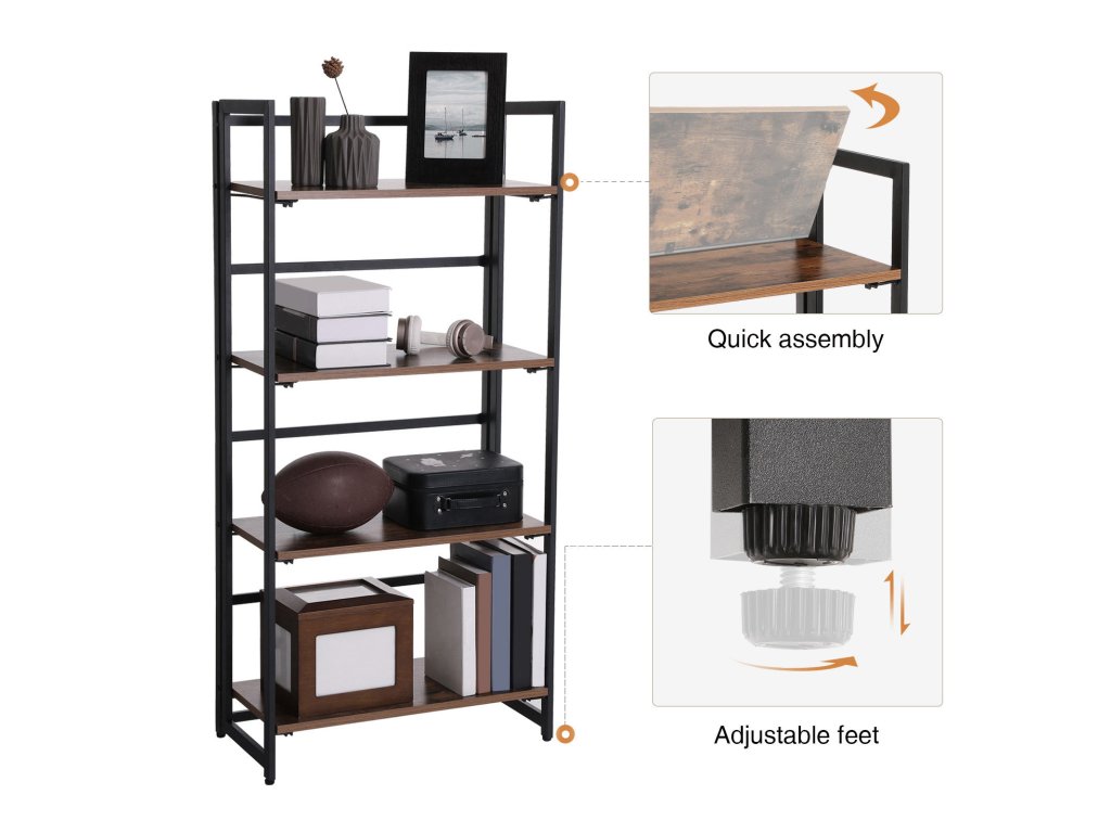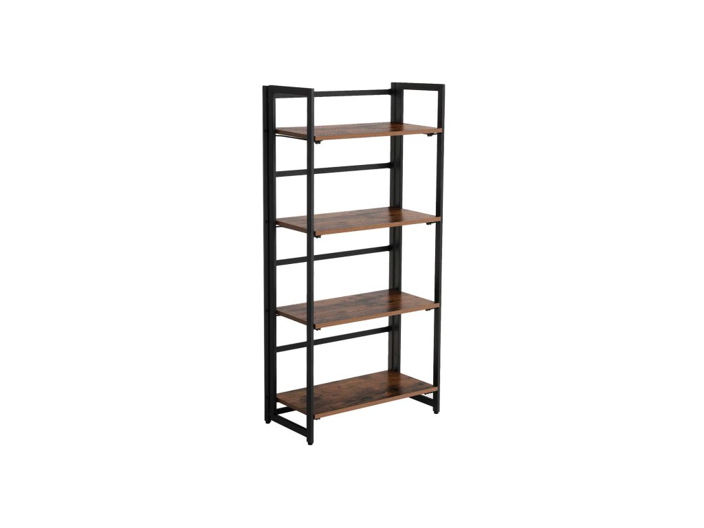 Regál na knihy, průmyslový skládací regál, čtyřpatrový regál, multifunkční regál, snadná montáž, s kovovým rámem, do obývacího pokoje, ložnice, kuchyně, rustikální hnědá.