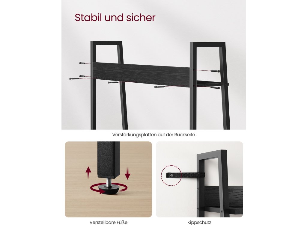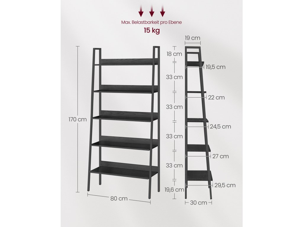 Úzký regál pro malé prostory Tento regál zabírá pouze 30 x 80 cm podlahové plochy a díky výšce 170 cm a 5 policím maximálně využívá vertikální prostor. Tento žebříkový regál šetřící místo se skvěle hodí do malých prostor.Stylový a všestranný Ebenově černé panely se stylovou kresbou dřeva a elegantním designem dělají z této podlahové police úžasný doplněk vaší domácí kanceláře, obývacího pokoje, ložnice a kuchyně.Stabilní a bezpečná 6,8 cm vysoké zadní panely zvyšují stabilitu této police a zabraňují pádu předmětů. Nastavitelné nožičky vyrovnávají mírné nerovnosti a zvyšují stabilitu. Sada proti převrácení zabraňuje převrácení police a zajišťuje tak její bezpečné používání.Robustní a odolný Tento úložný regál, vyrobený z robustní oceli a vysoce kvalitní dřevotřísky, unese celkem až 75 kg a poskytuje silnou oporu pro vaše knihy a sbírky. Tato robustní police je vyrobena tak, aby vydržela a sloužila vám dlouhá léta.Snadná montáž Ilustrovaný, přehledný návod a očíslované díly vám umožní snadno sestavit tento úzký regál na podlahu.| Kategorie: | Knihovny |