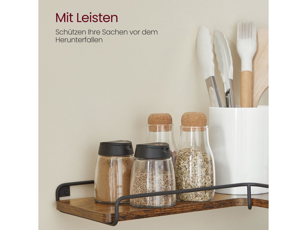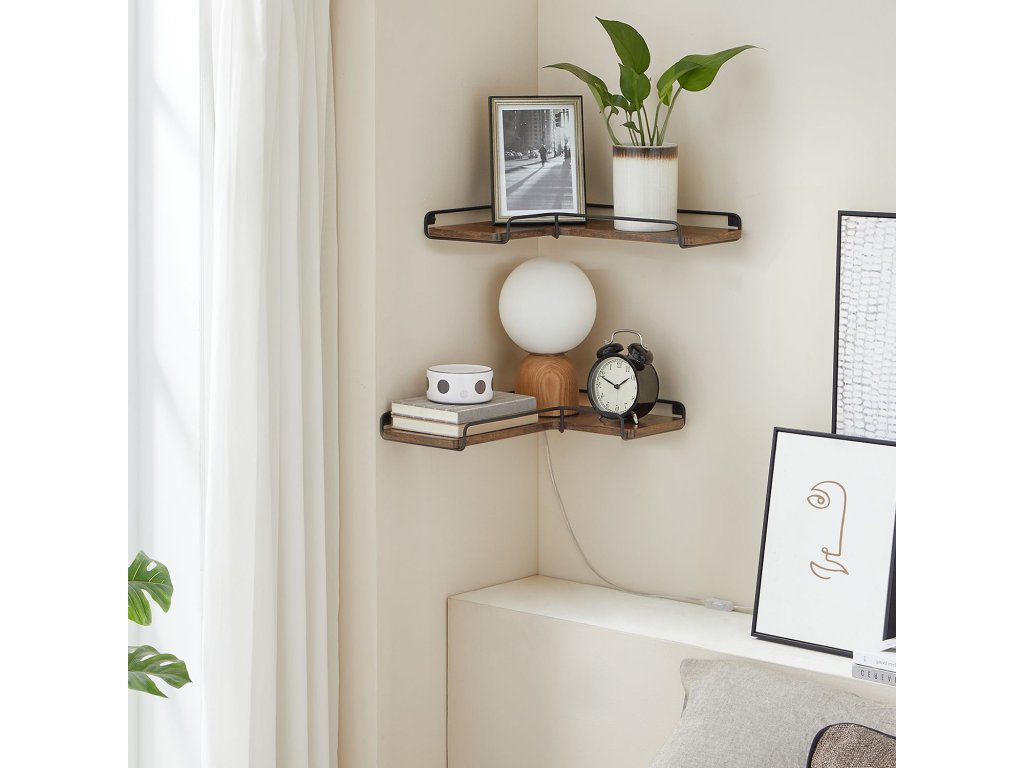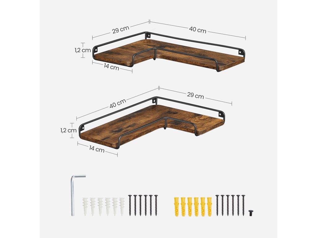 Prostor pro kabely: každá police v rohu ponechává maximálně 7-8 mm volného prostoru pro kabely. Nebojte se roztroušených kabelů, všechny jsou v pořádku.Všestranné využití: Tuto sadu nástěnných polic lze použít v obývacím pokoji k vystavení dekorací, v ložnici na rámy s obrázky, v kuchyni k uložení lahví a sklenic atd.Praktické: délka obou stran je různá (dlouhá strana: 40 cm, krátká strana: 29 cm). Dlouhou a krátkou stranu rohové police můžete přizpůsobit různým stěnám.STYLOVÝ: Díky zaobleným rohům a kombinaci dřevotřísky a oceli je tato sada plovoucích polic stylová a dodá vašemu domovu industriální nádech.SNADNÁ MONTÁŽ - Poskytujeme vám jasné pokyny, označené díly a montážní nářadí, navíc panely a kovové rámy jsou již předem smontované, takže tyto nástěnné police postavíte během chvilky.