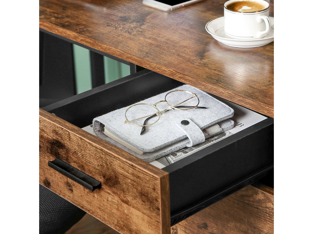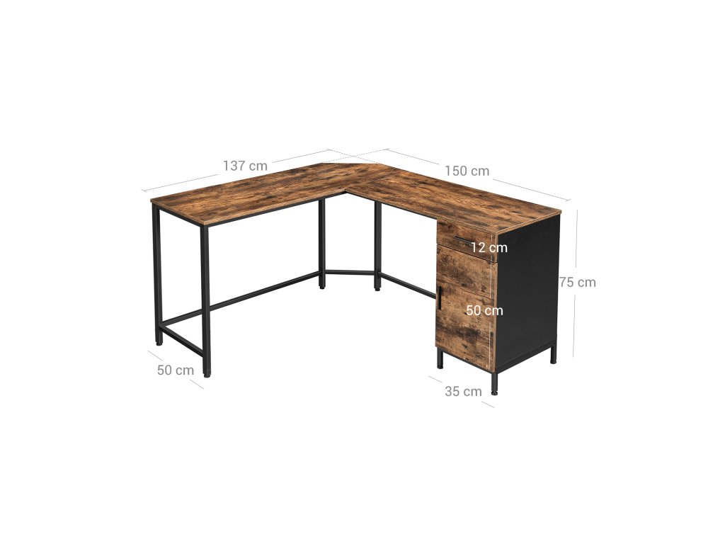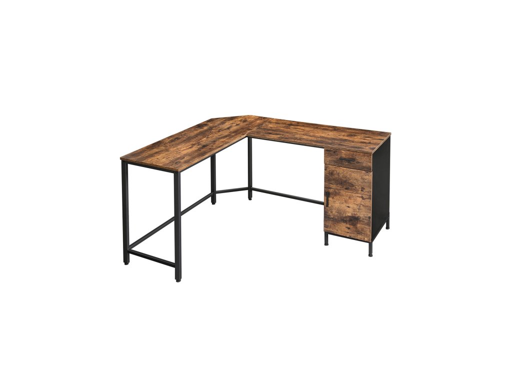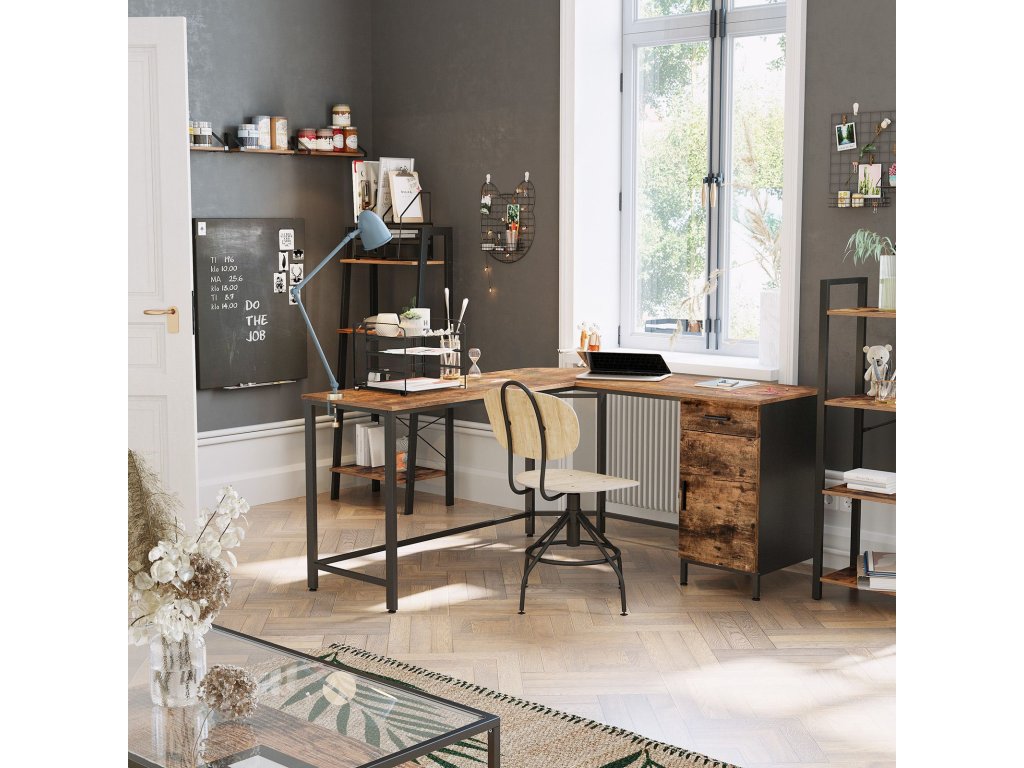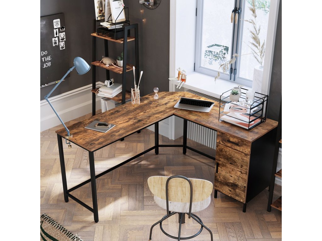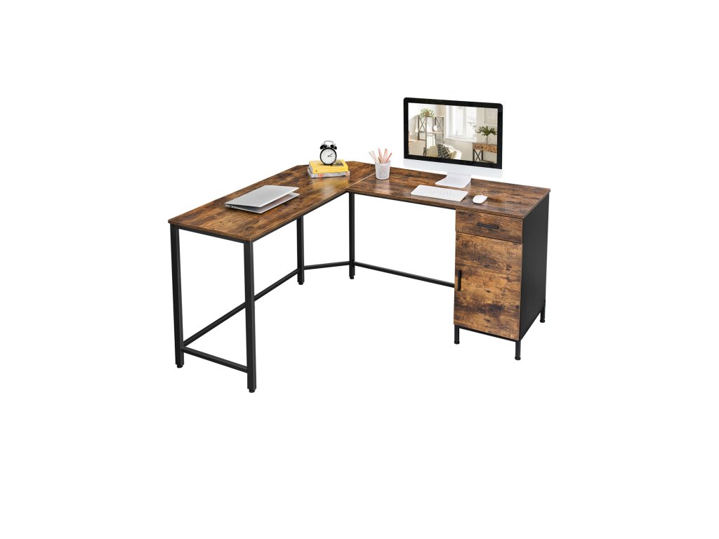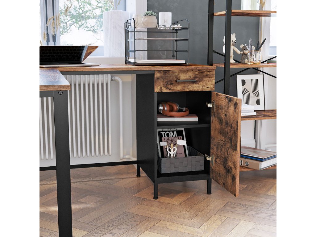 Rohový psací stůl, počítačový stůl ve tvaru L se skříní a zásuvkou, pracovna, úspora místa, snadná montáž, ocel, průmyslový design, rustikální hnědá a černá.