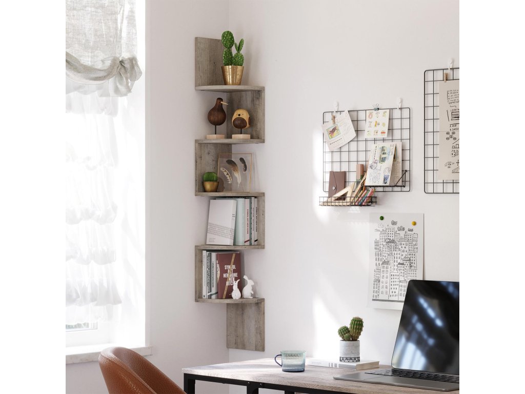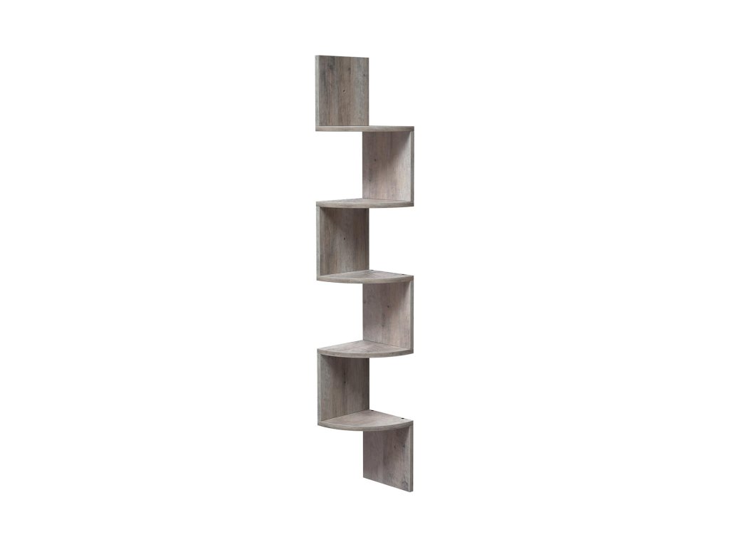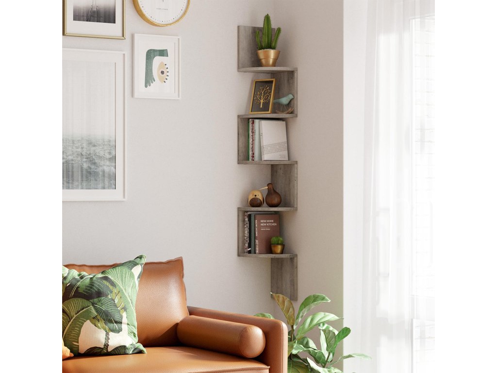 Rohový regál, 5úrovňová plovoucí nástěnná police s klikatým designem, police na knihy, béžová.