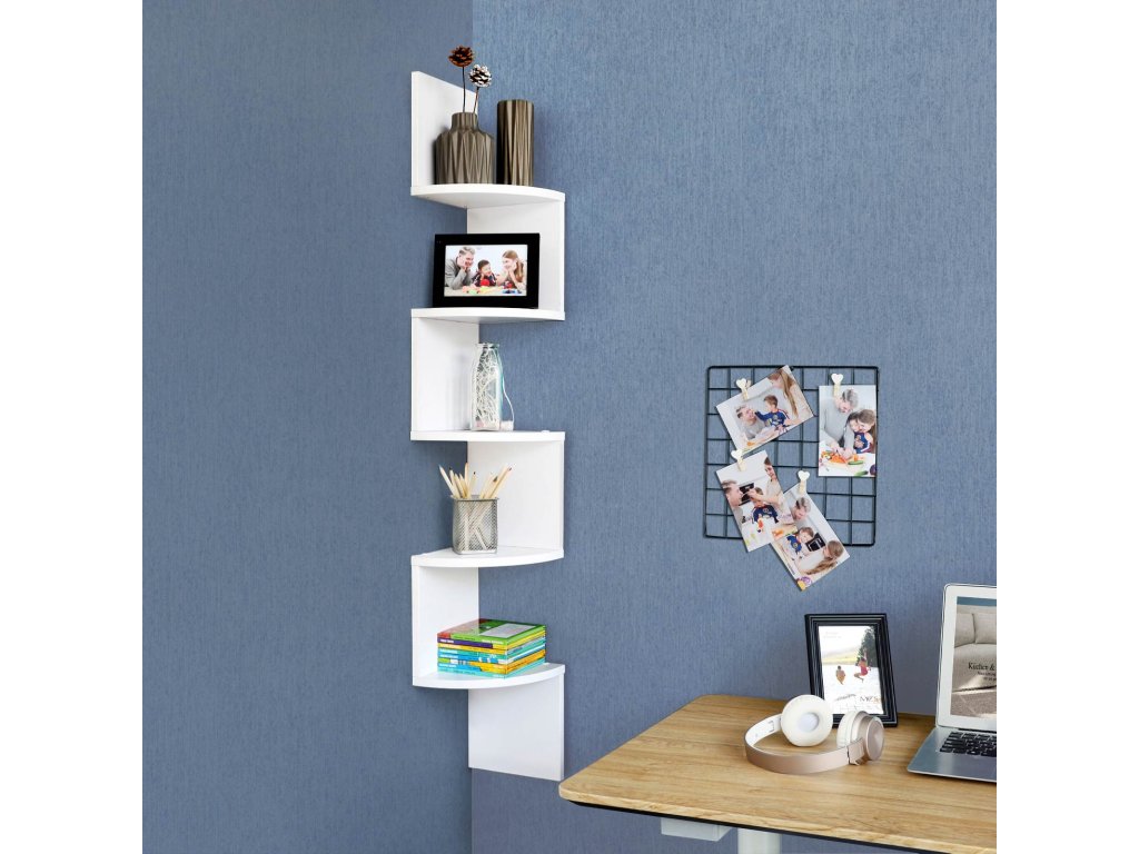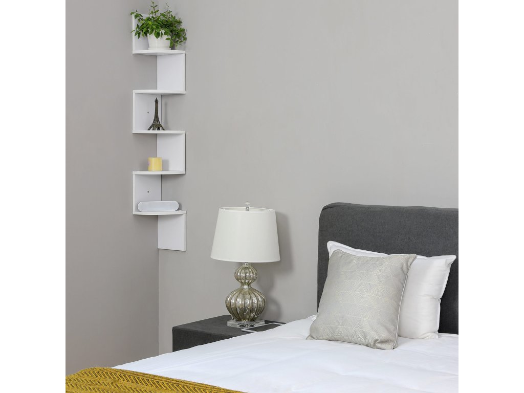 Rohový regál, 5úrovňová plovoucí nástěnná police s klikatým designem, police na knihy, bílá.