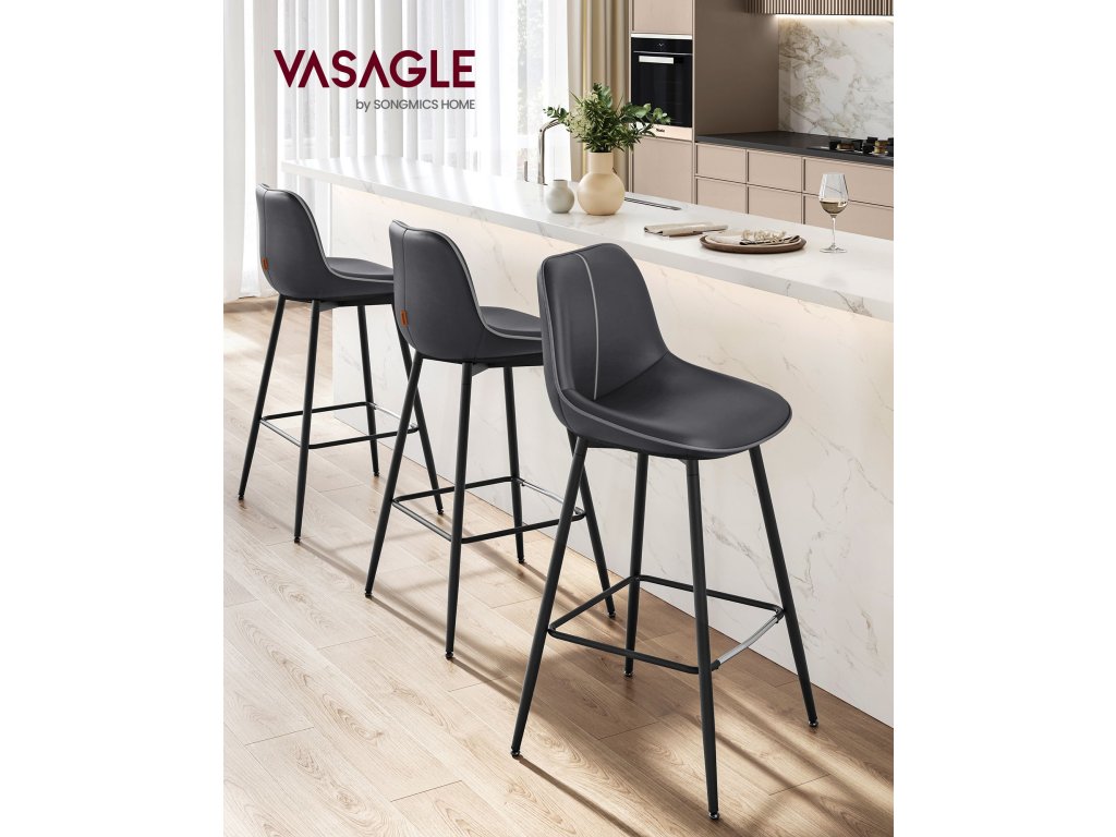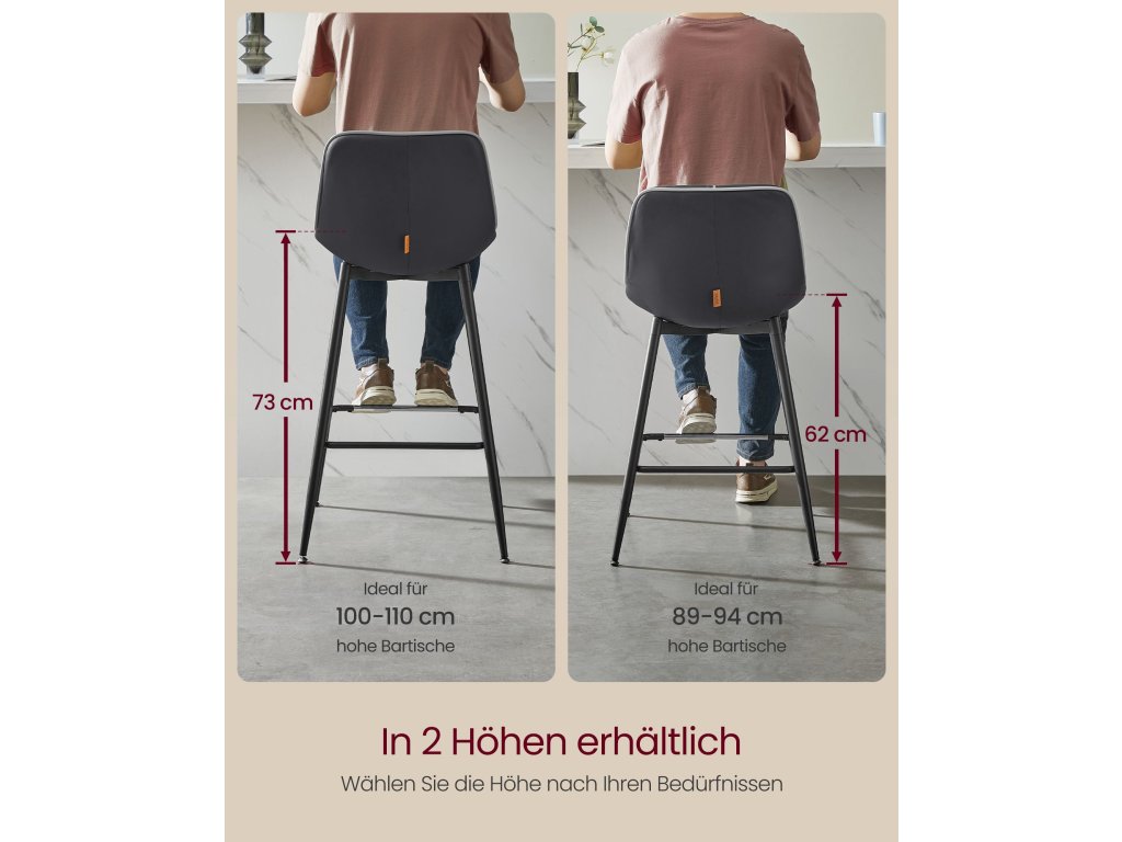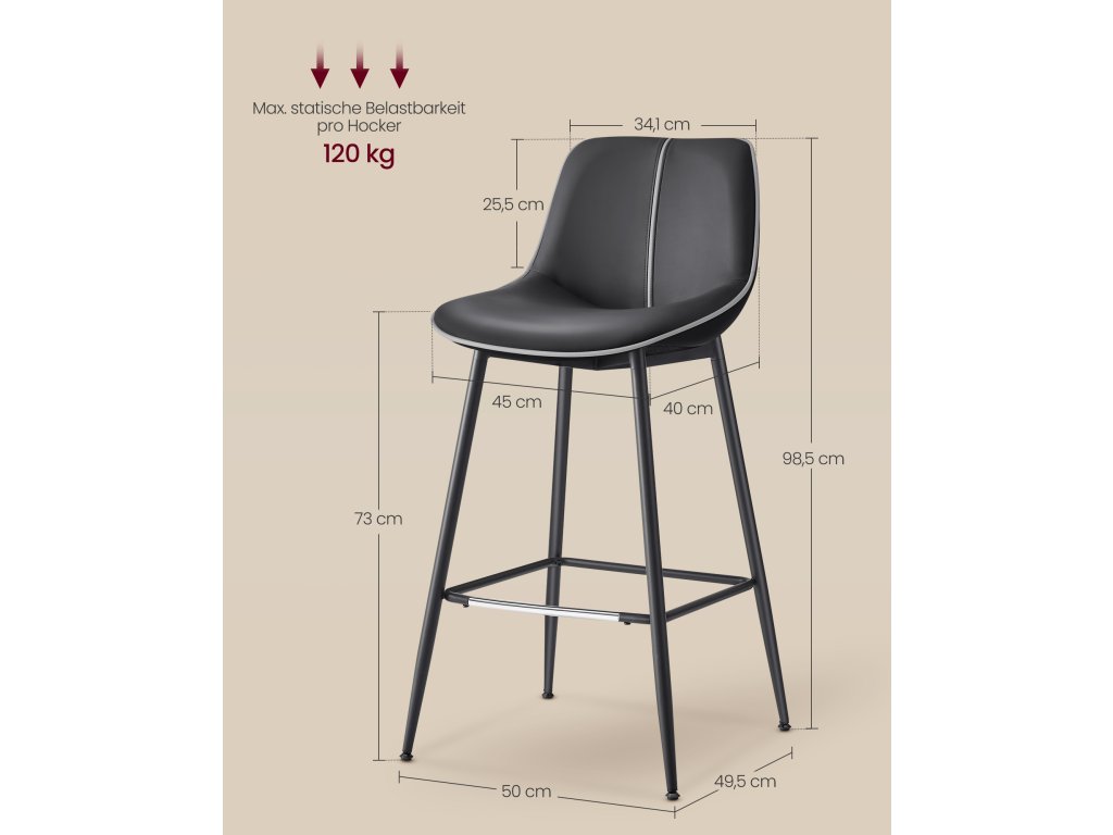 Sada 2 barových židlí, kuchyňské židle, ergonomické opěradlo, PU čalounění, kovové nohy s nastavitelnými podnožemi, výška 73 cm, snadná montáž, inkoustově černá.