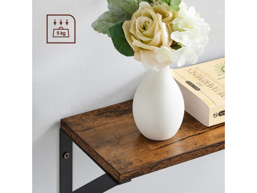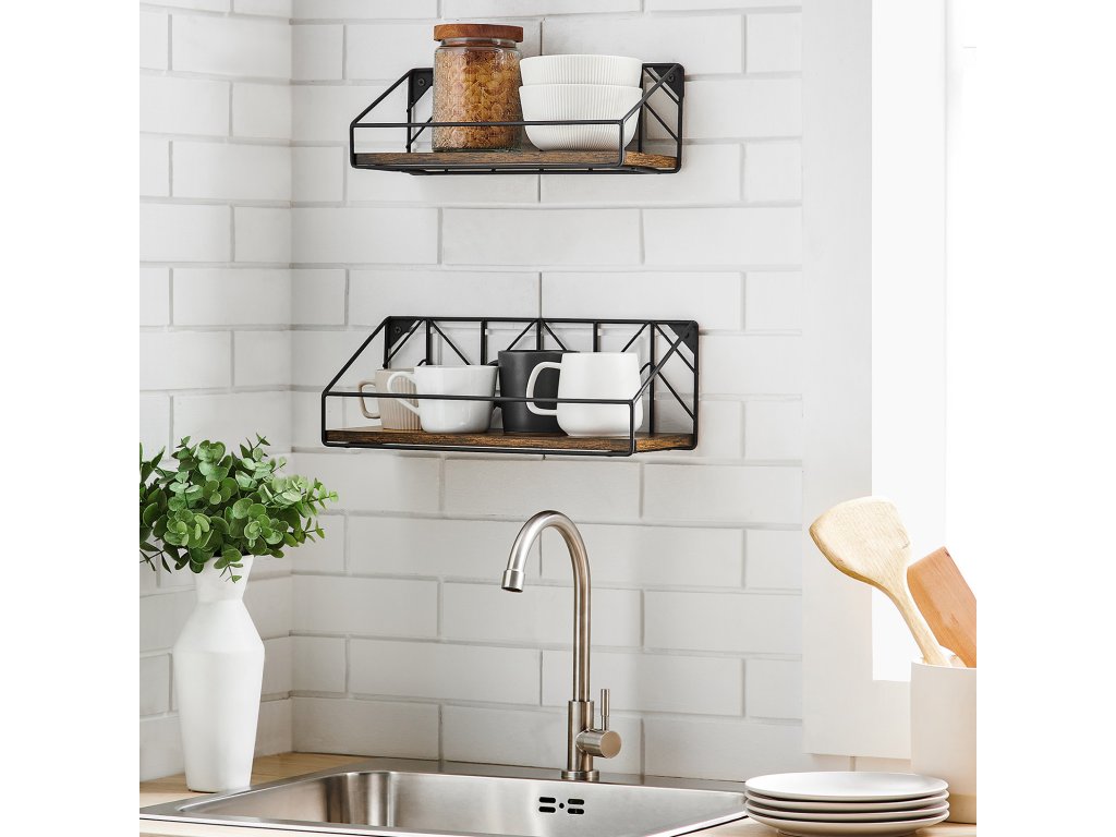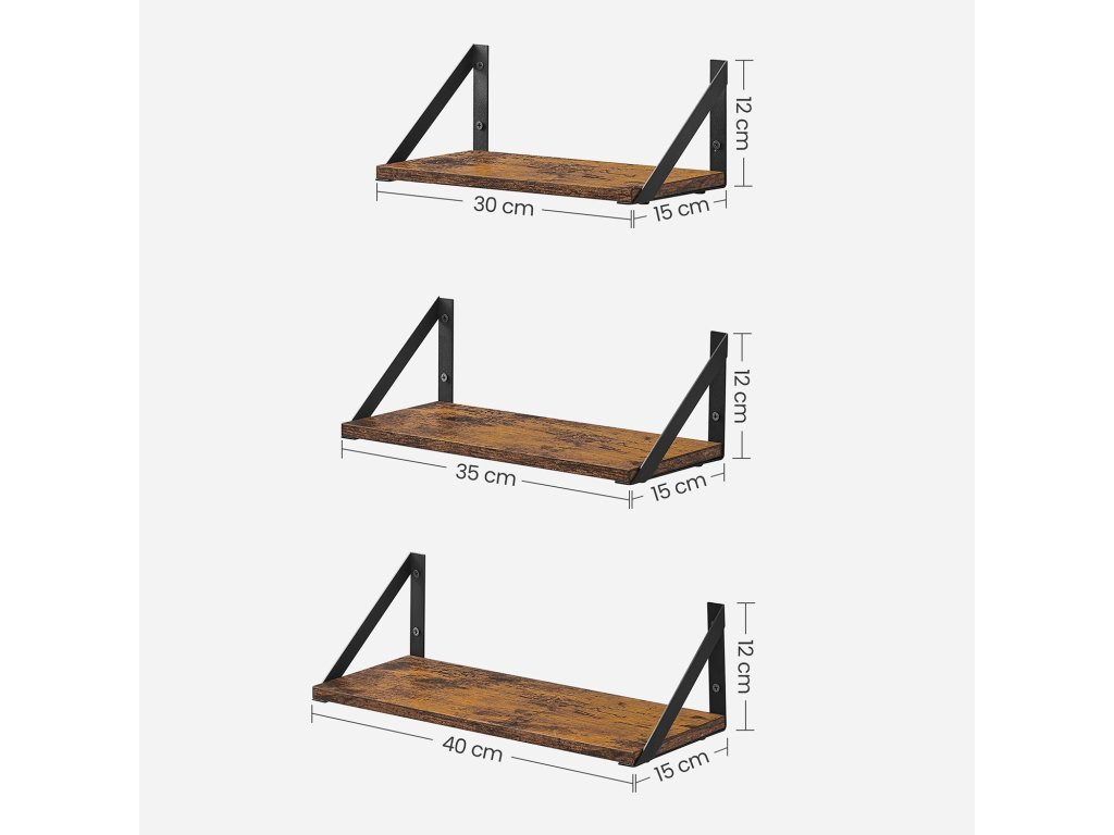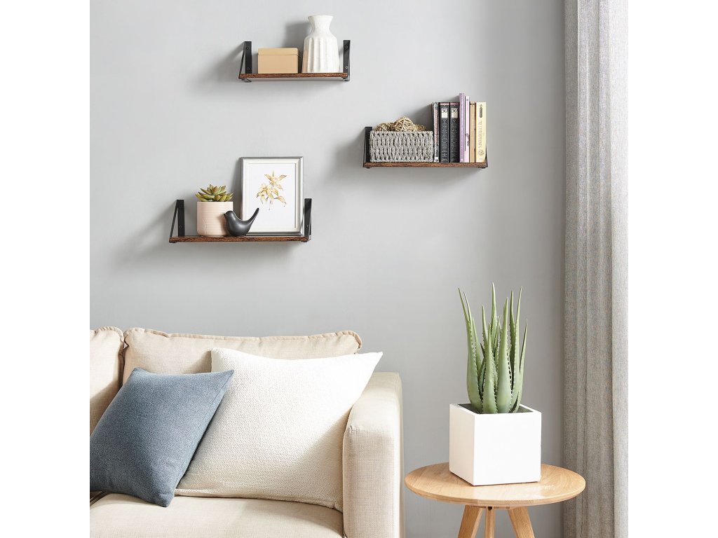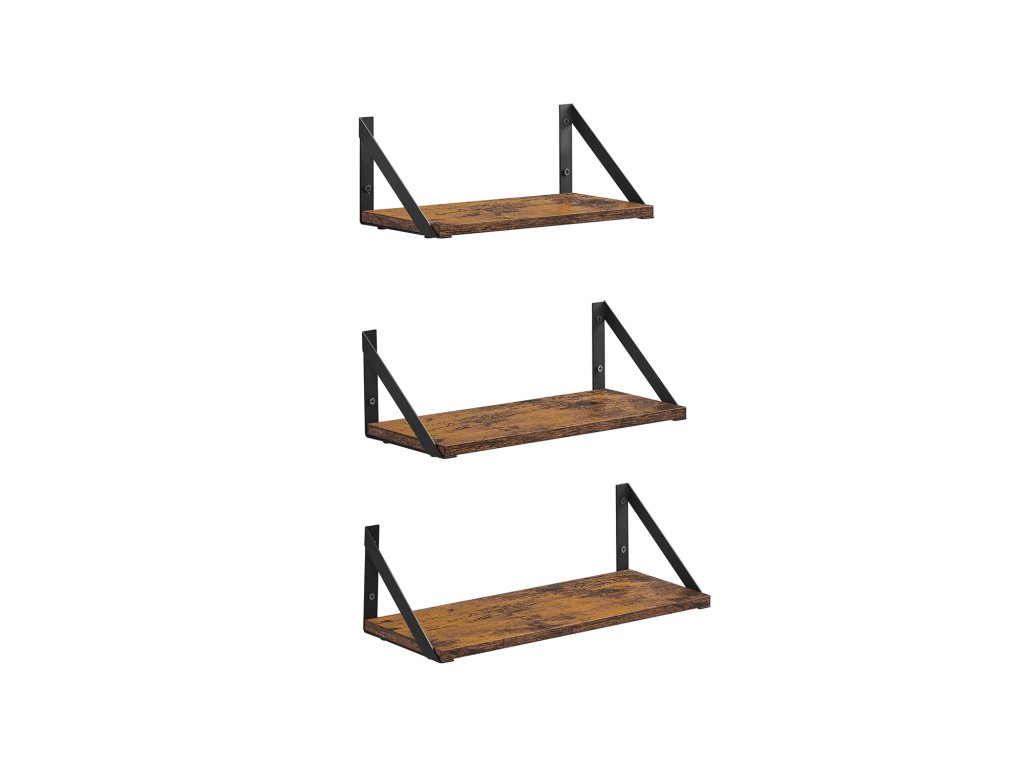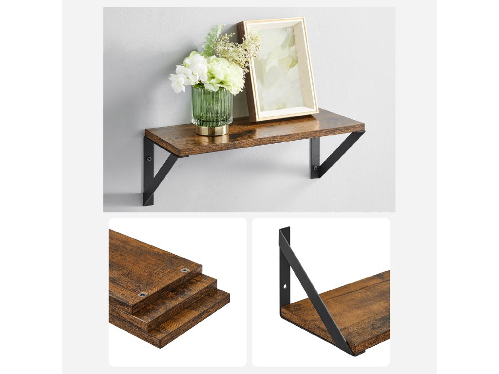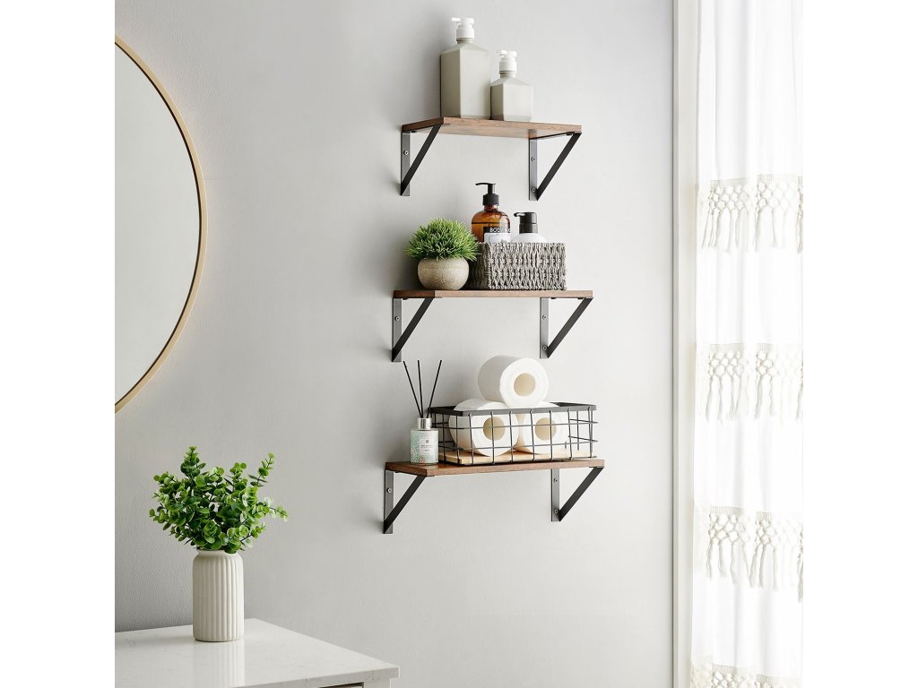 Sada 3 nástěnných polic, plovoucí police, na drobnosti, fotorámečky, lahvičky s kořením, toaletní potřeby, do obývacího pokoje, ložnice, kuchyně, koupelny, rustikální hnědá a černá.