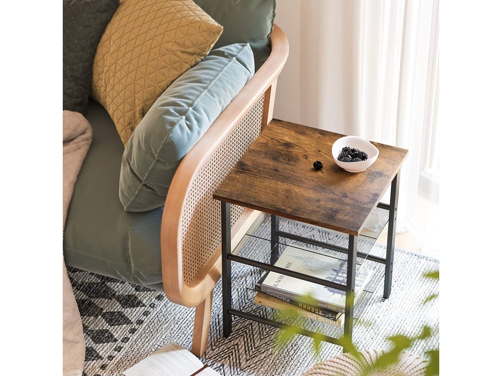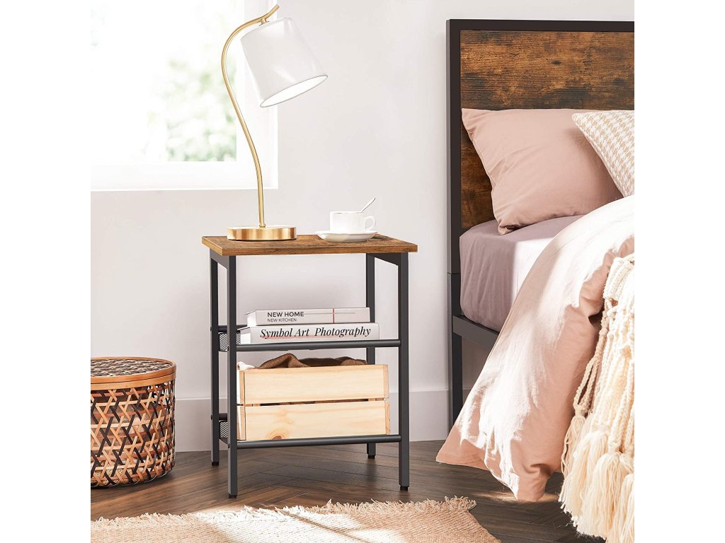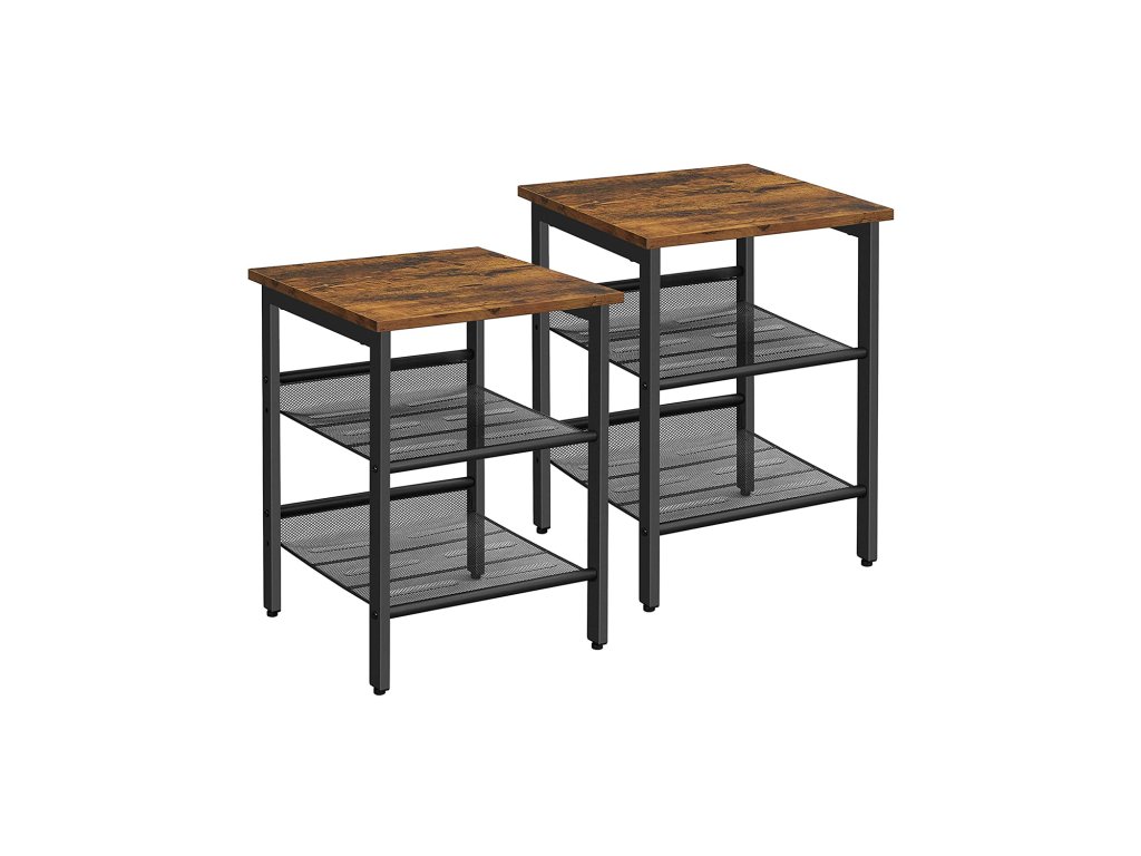 Sada nočních stolků, noční stolek, industriální sada 2 nočních stolků, s nastavitelnými policemi ze síťoviny, obývací pokoj, ložnice, předsíň, kancelář, stáj, rustikální hnědá a černá.