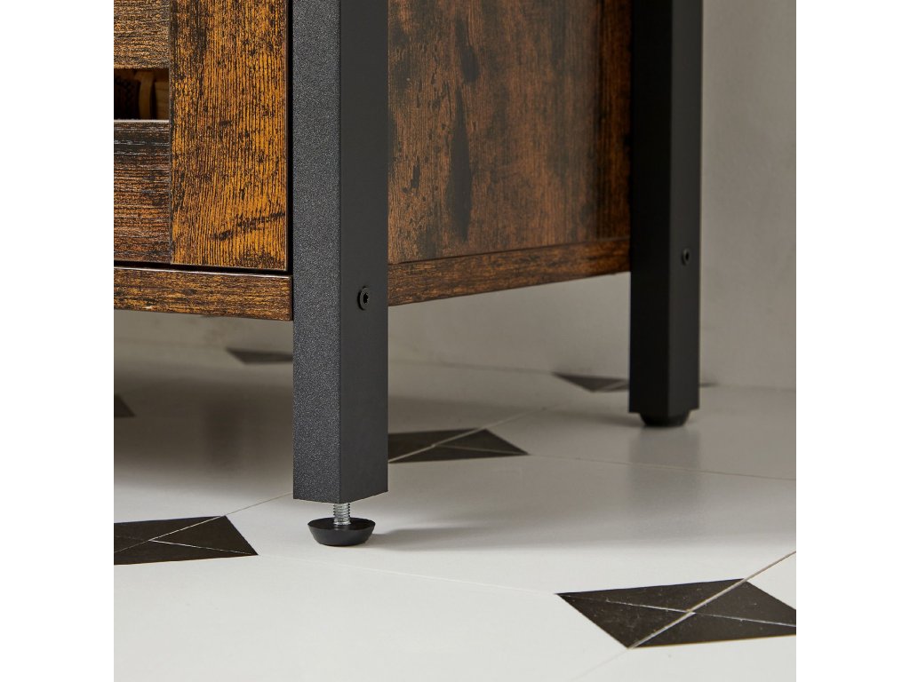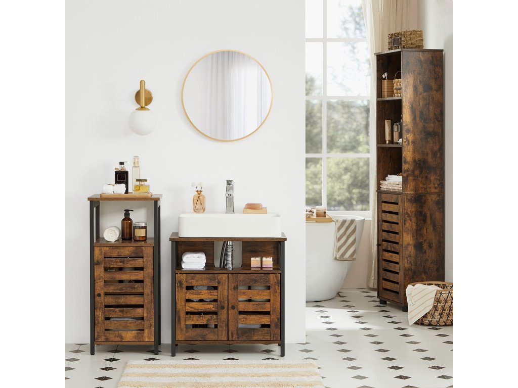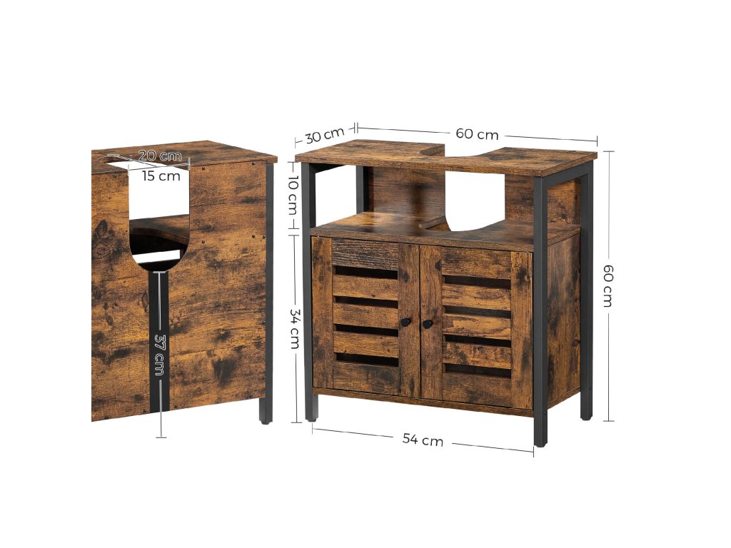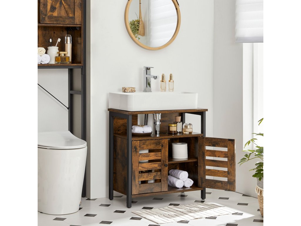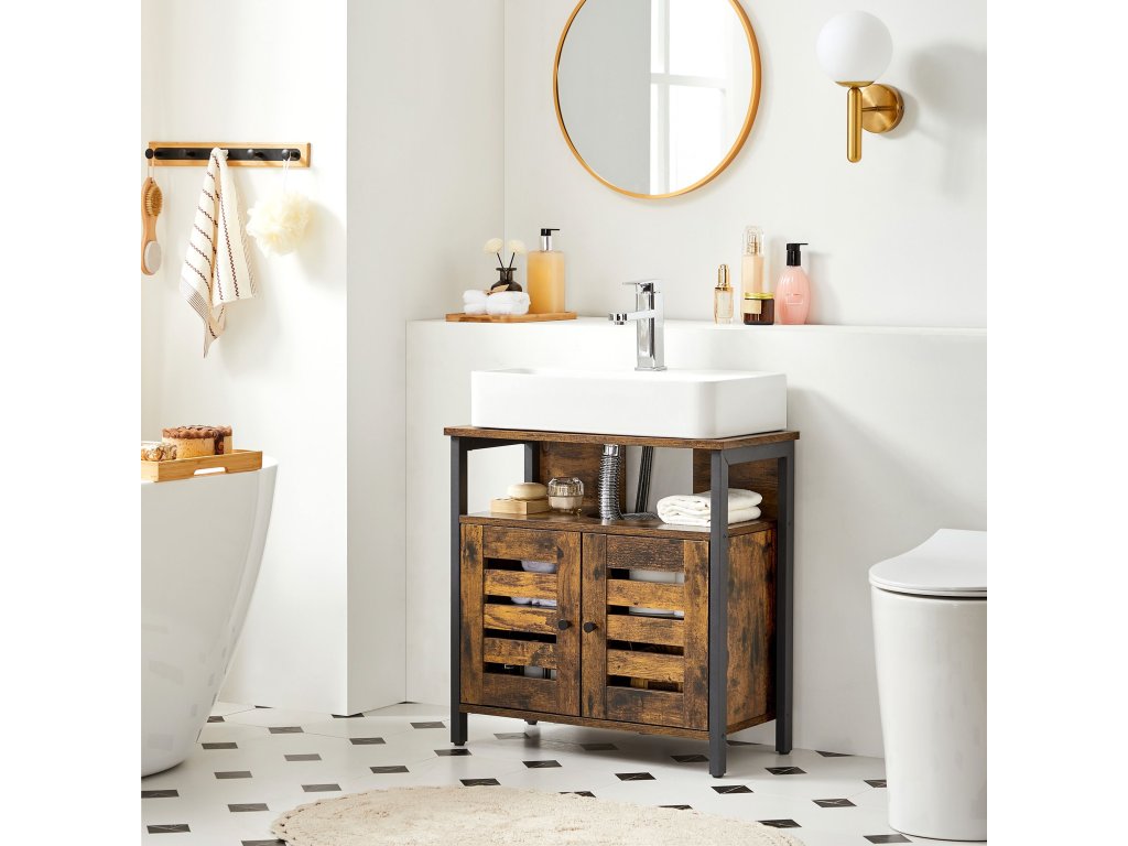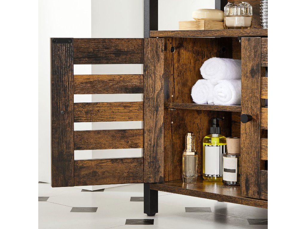 Rustikální v koupelně: A proč ne? Je to nejlepší způsob, jak do koupelny vnést velkou dávku nadčasového šarmu a charakteru. S touto hnědou skříňkou pod umyvadlo s rustikálními akcenty bude vypadat jako žádná jiná!.Silnější konstrukce, delší životnost: Tato skříňka pod umyvadlo je vyrobena z robustního ocelového rámu a kvalitní dřevotřísky a je dostatečně odolná, aby vám sloužila po mnoho let.Otevřené nebo skryté úložiště? S touto koupelnovou skříňkou můžete využít obojí - často používané ručníky a hřebeny můžete umístit na otevřenou polici, abyste k nim měli snadný přístup. a schovat náhradní role papíru na nastavitelnou polici se 3 možnostmi výšky za dveřmi.