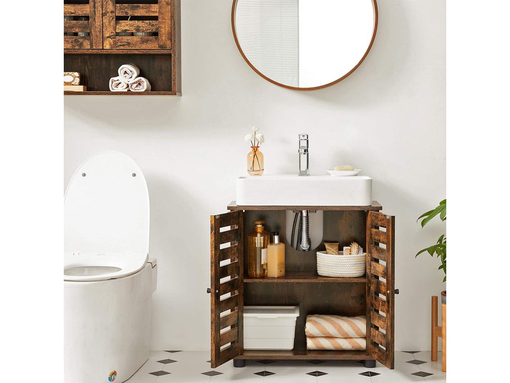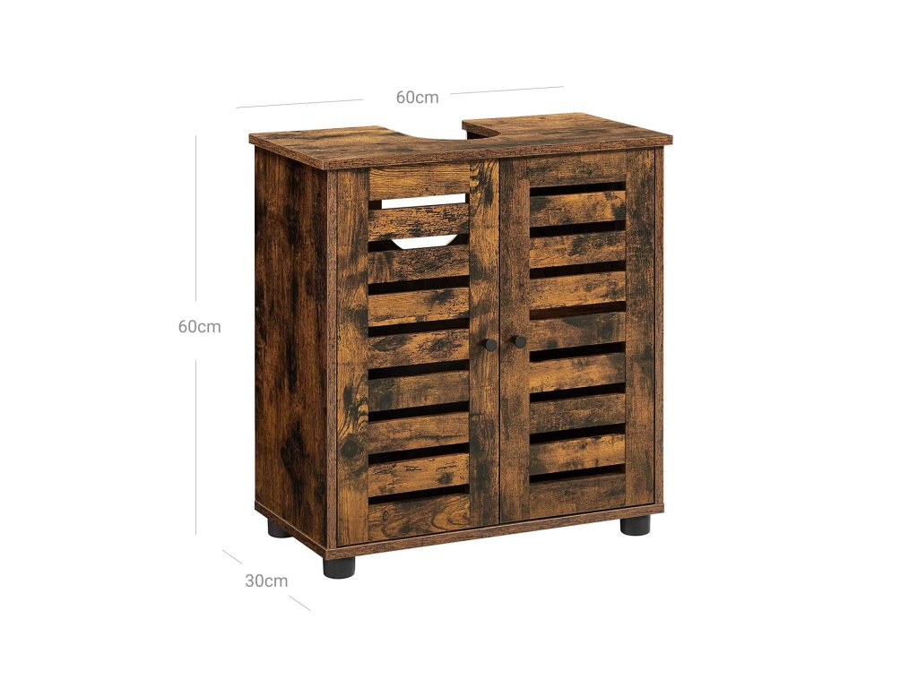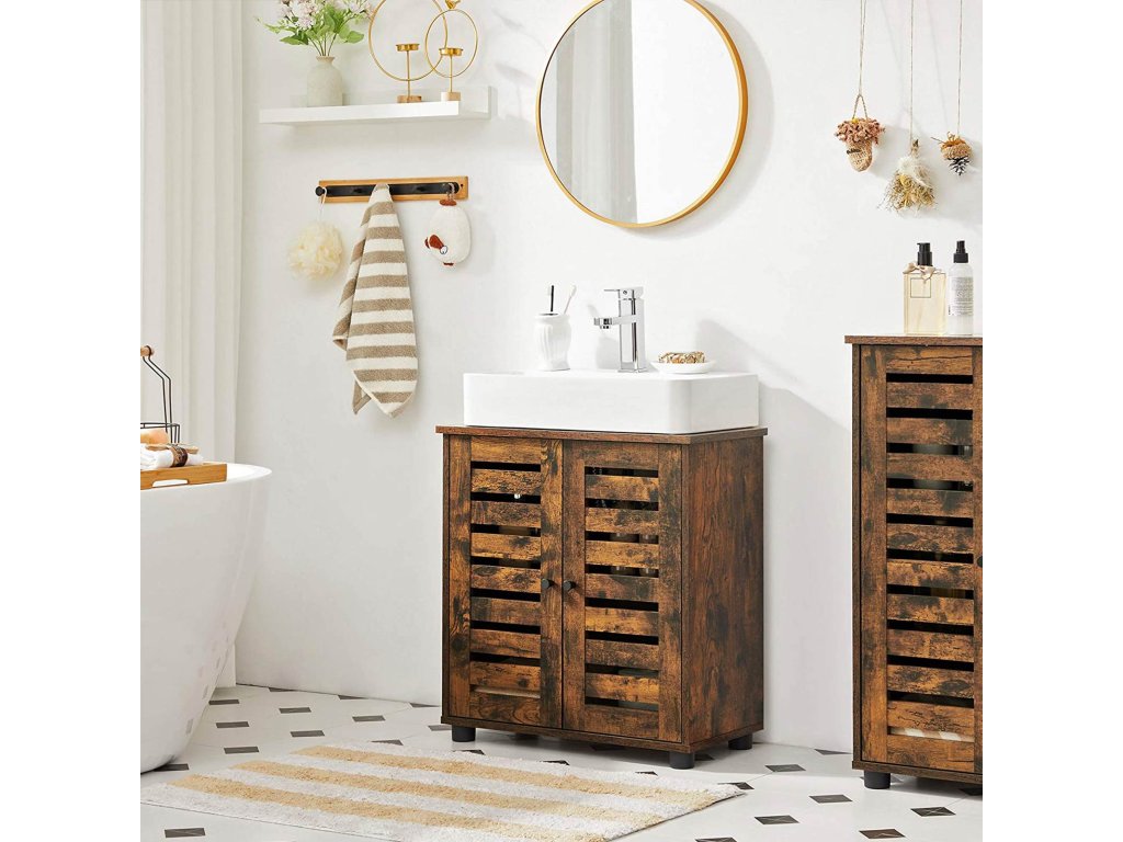 Koupelnová skříňka pod umyvadlo, podlahová skříňka do koupelny, úložná skříňka, 60 x 30 x 60 cm, se 2 žaluziovými dvířky, nastavitelná police, rustikální hnědá.