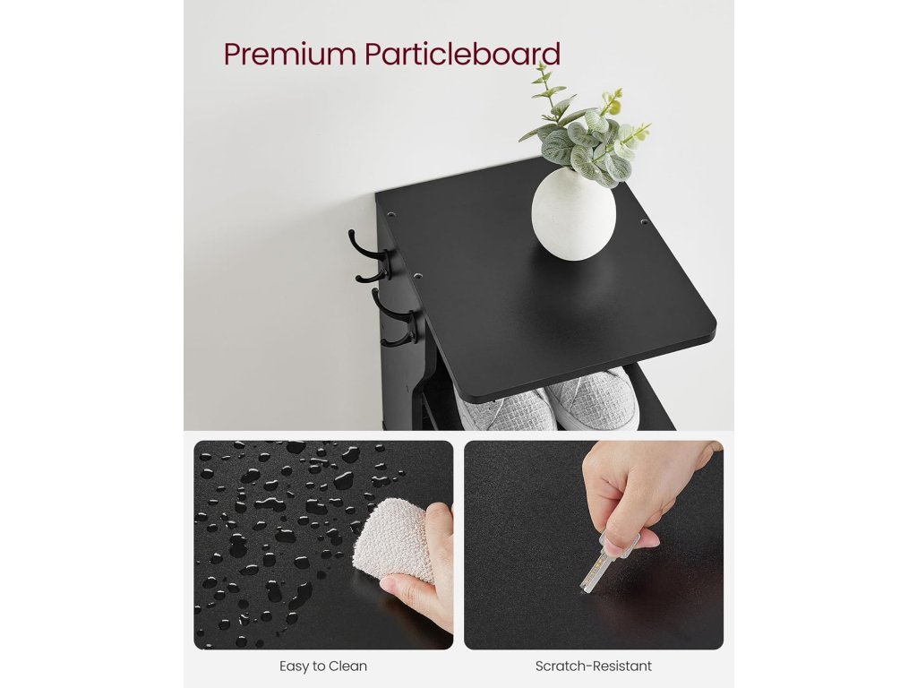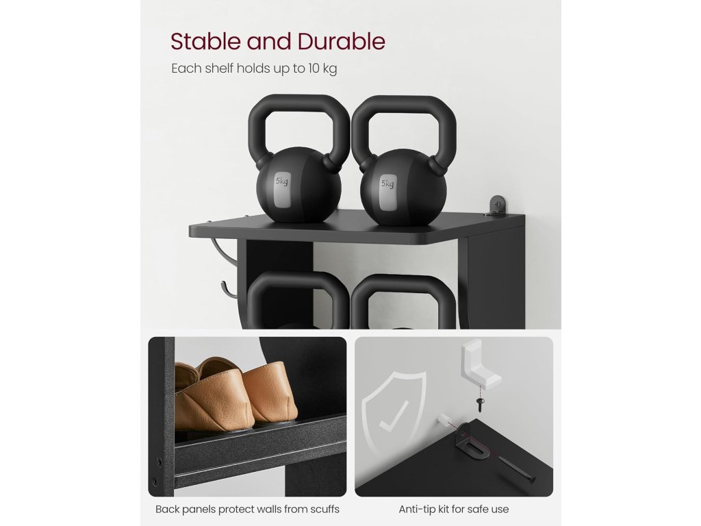Vhodný pro malé prostory Tento tenký organizér na boty o rozměrech 30 x 26,4 x 110,4 cm efektivně využívá podlahovou plochu, takže je ideální pro malé chodby, byty nebo jiné stísněné prostory.Pohodlné odkládání na háčky Klíče a peněženky můžete zavěsit na háčky úzkého botníku a rychle je vzít a odnést během ranního spěchu. A co víc, háčky lze podle potřeby instalovat vlevo nebo vpravo.Vejde se do vyšších bot Mokasíny, tenisky, turistické boty, holínky... všechny se dobře vejdou do polic s odstupem 17 cm, ať už jsou vysoké nebo krátké.Nabízí silnou oporu Tento vysoký stojan na boty je vyroben z dřevotřískových desek a může se pochlubit velkou pevností (max. zatížení 10 kg na každou polici), takže na něj můžete snadno nasadit těžké horolezecké boty.Co získáte Šestipatrový štíhlý stojan na boty s opěrnými deskami, které zvyšují stabilitu a chrání stěnu před odřením, a také zařízení proti překlopení, které vám pomůže zajistit bezpečnost věže na boty na stěně.| Kategorie: | Botníky |