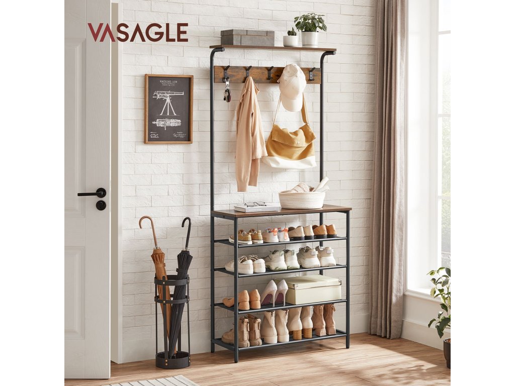 Úložiště typu vše v jednom, odemčené: Uložit boty a tašky na 5 polic pod sebou, pověsit kabáty na 5 dvojitých háčků. na horní polici můžete umístit dekorativní předměty nebo drobné doplňky - tento věšák nabízí prostorný domov pro všechny.Máte rádi industriální atmosféru? Pak se vám bude líbit tento předsíňový strom. Tento volně stojící věšák s matným černým rámem a rustikálním hnědým povrchem snadno vnese industriální eleganci do ložnice, pokoje na koleji, chodby nebo obývacího pokoje.