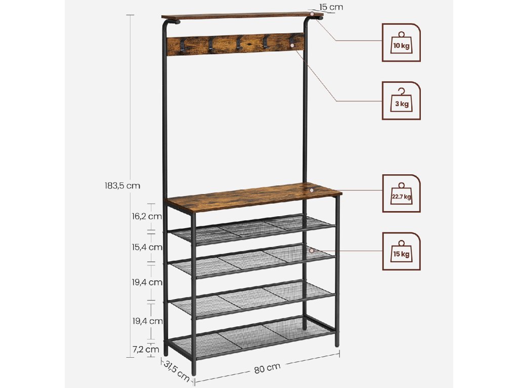 Stojan na kabáty, předsíňový strom s úložným prostorem na boty, 5úrovňový stojan na boty s různou výškou, 5 dvojitých háčků, horní police, předsíň ložnice kolejní byt, průmyslový, rustikální hnědý a černý.