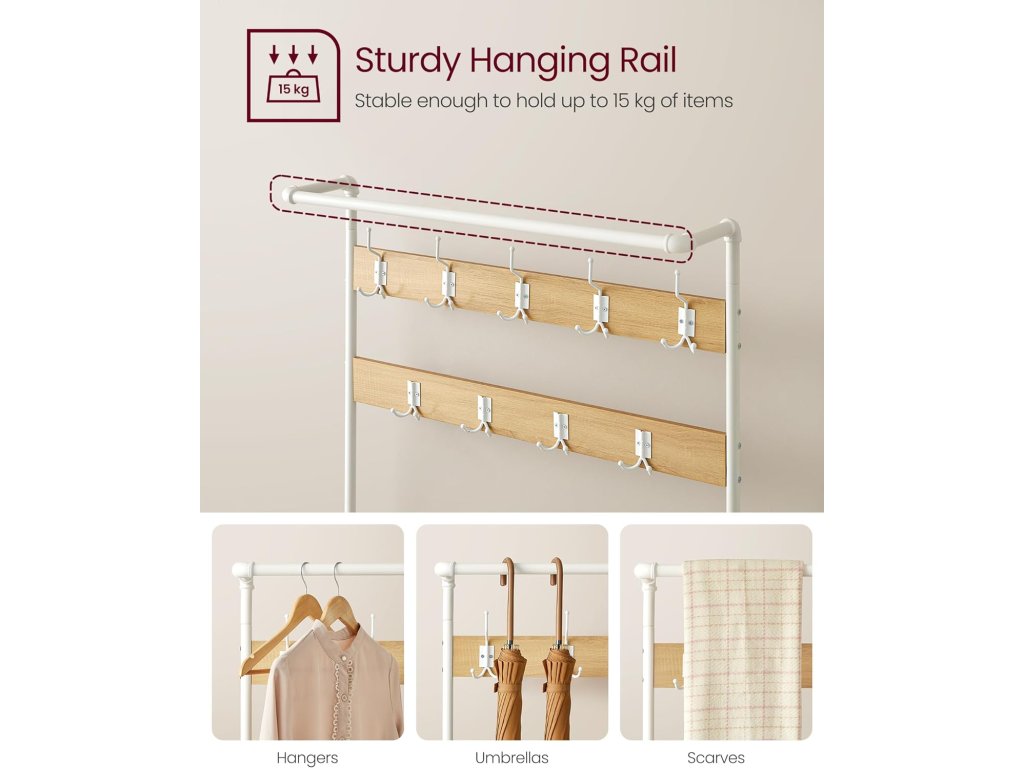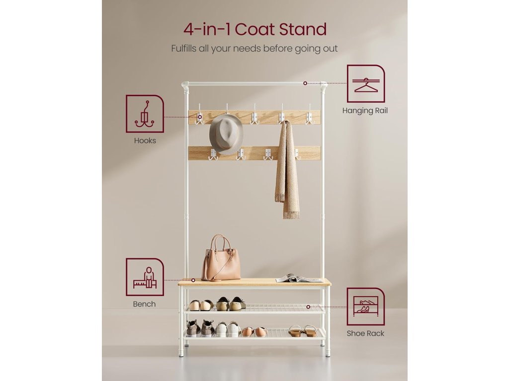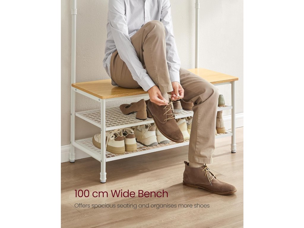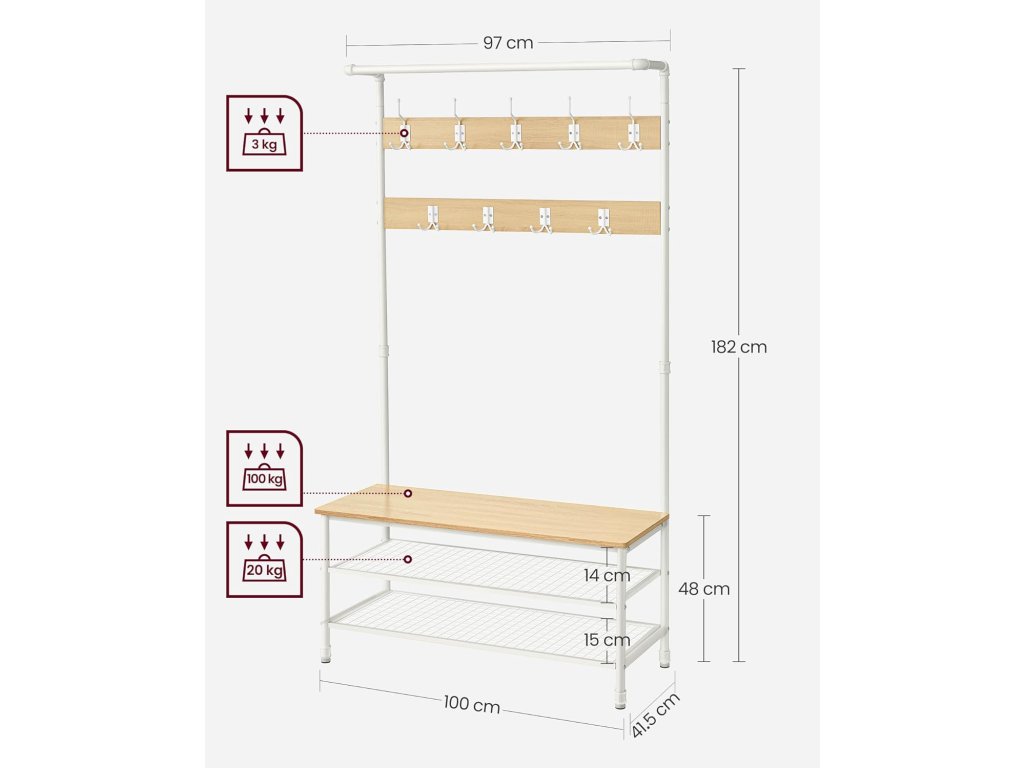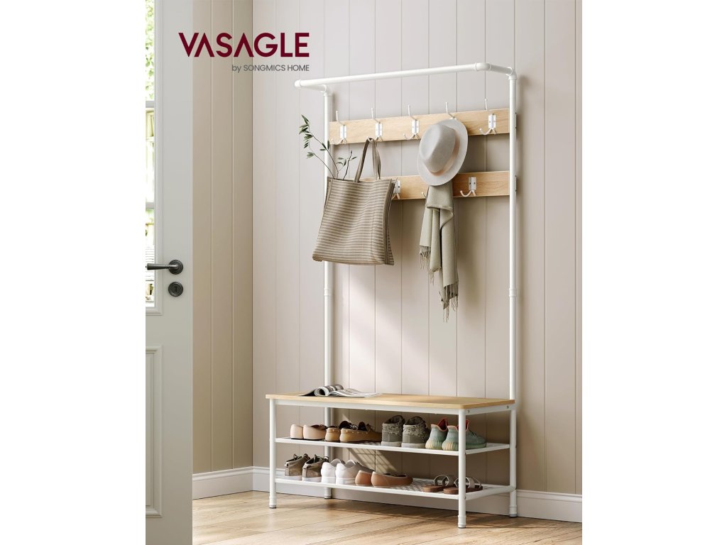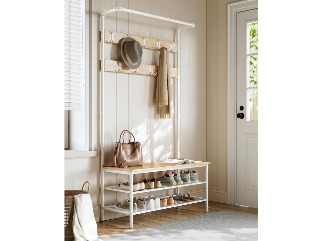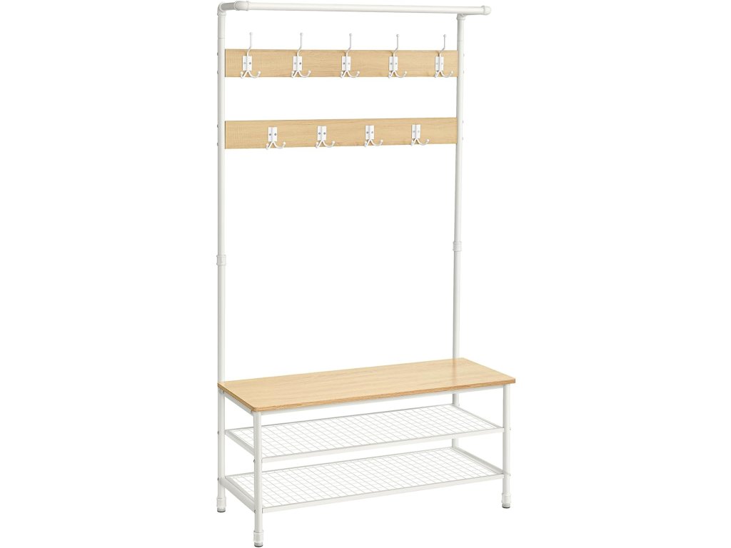Style Meets Organisation Snoubení čistých linií s průmyslovým potrubím a moderní dubovo-bílou paletou tento věšák s úložným prostorem na boty vnese do vašeho domova jedinečný šarm a udrží nepořádek v předsíni na uzdě.4 v 1 pro různé potřeby Po návratu domů na konci dne stačí pověsit kabát, klobouk nebo šálu na některý ze 4 dvojitých háčků nebo 5 trojháčků. posaďte se na 100 cm dlouhou lavici, abyste si mohli sundat boty a uložit je na 2 odkládací police z ocelové síťoviny.Praktická závěsná lišta Závěsná lišta nahoře se rovná malé šatní skříni. Můžete na ni umístit věšáky, na které si uspořádáte sako, košili nebo svrchní oblečení, abyste je mohli snadno uchopit a nemačkali.Robustní a stabilní Tento strom v předsíni, vyrobený z odolných ocelových trubek a kvalitních dřevotřískových desek, unese až 100 kg na lavici na boty, 15 kg na závěsné tyči a 3 kg na každém háku. a 20 kg na každé kovové policiSnadná montáž Tento stojan na kabáty o rozměrech 41,5 x 100 x 182 cm snadno sestavíte díky označeným dílům a jasným pokynům a uklidíte tak svou předsíň, obývací pokoj nebo byt. nebo v ložnici (připevněte jej ke stěně pomocí přiložené sady proti převrácení)
