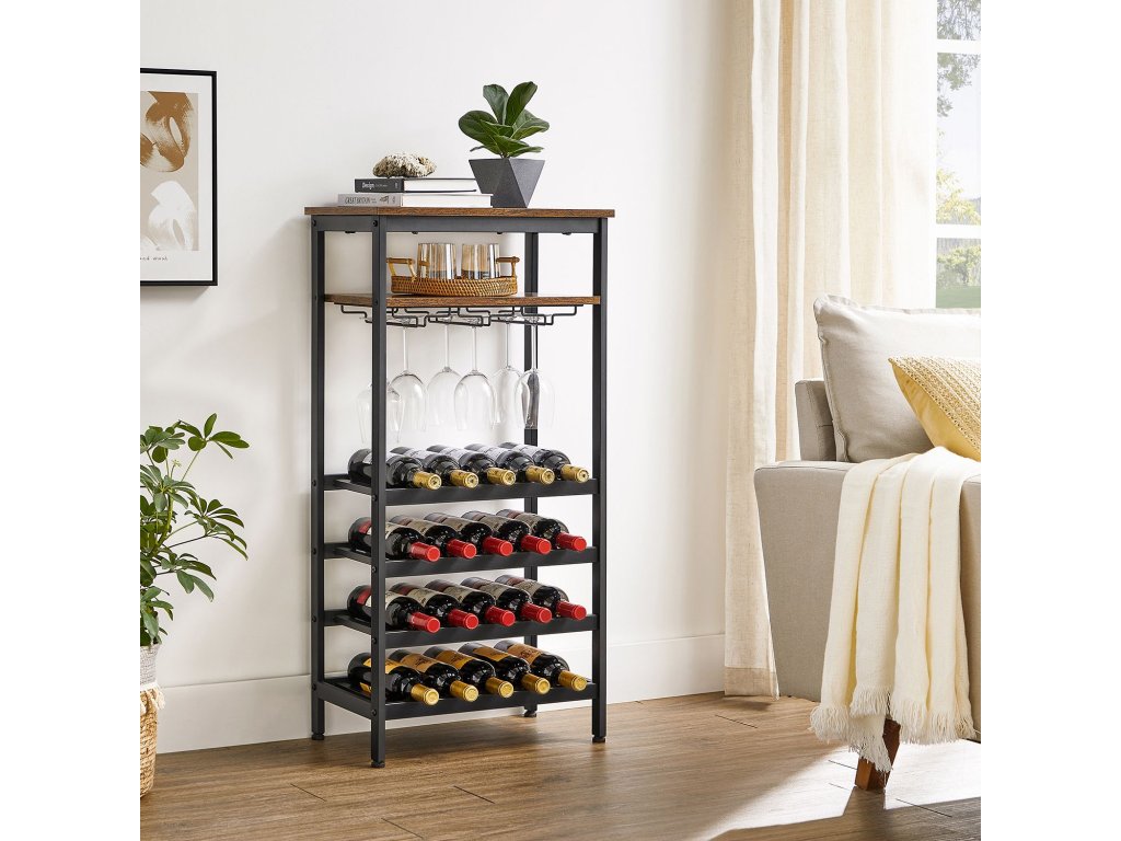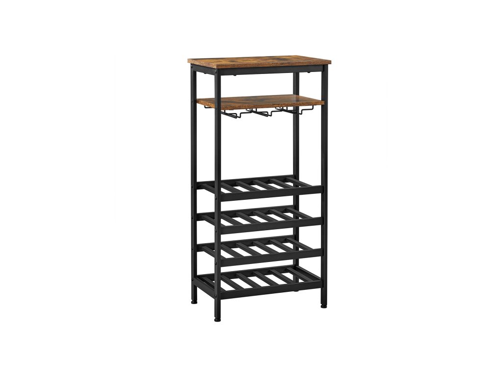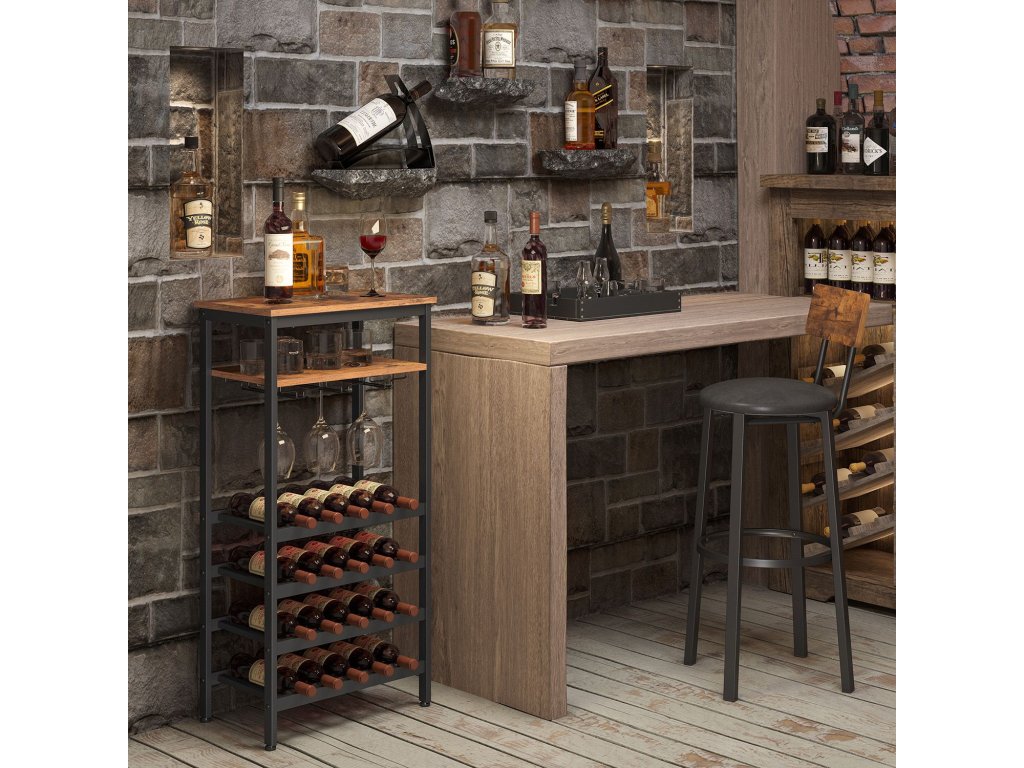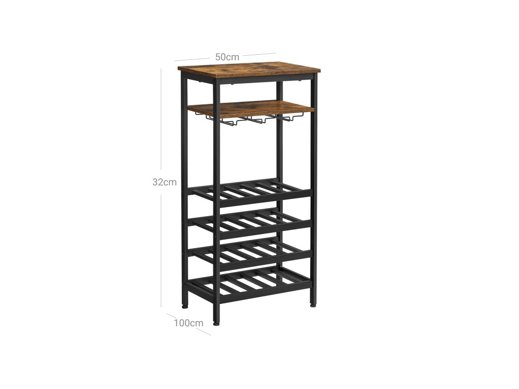 Stojan na víno, pojme 20 lahví, držák na víno, stojan na lahve s držákem na sklenice, do sklepa, kuchyně, jídelny, industriální styl, 50 x 32 x 100 cm, rustikální hnědá a černá.
